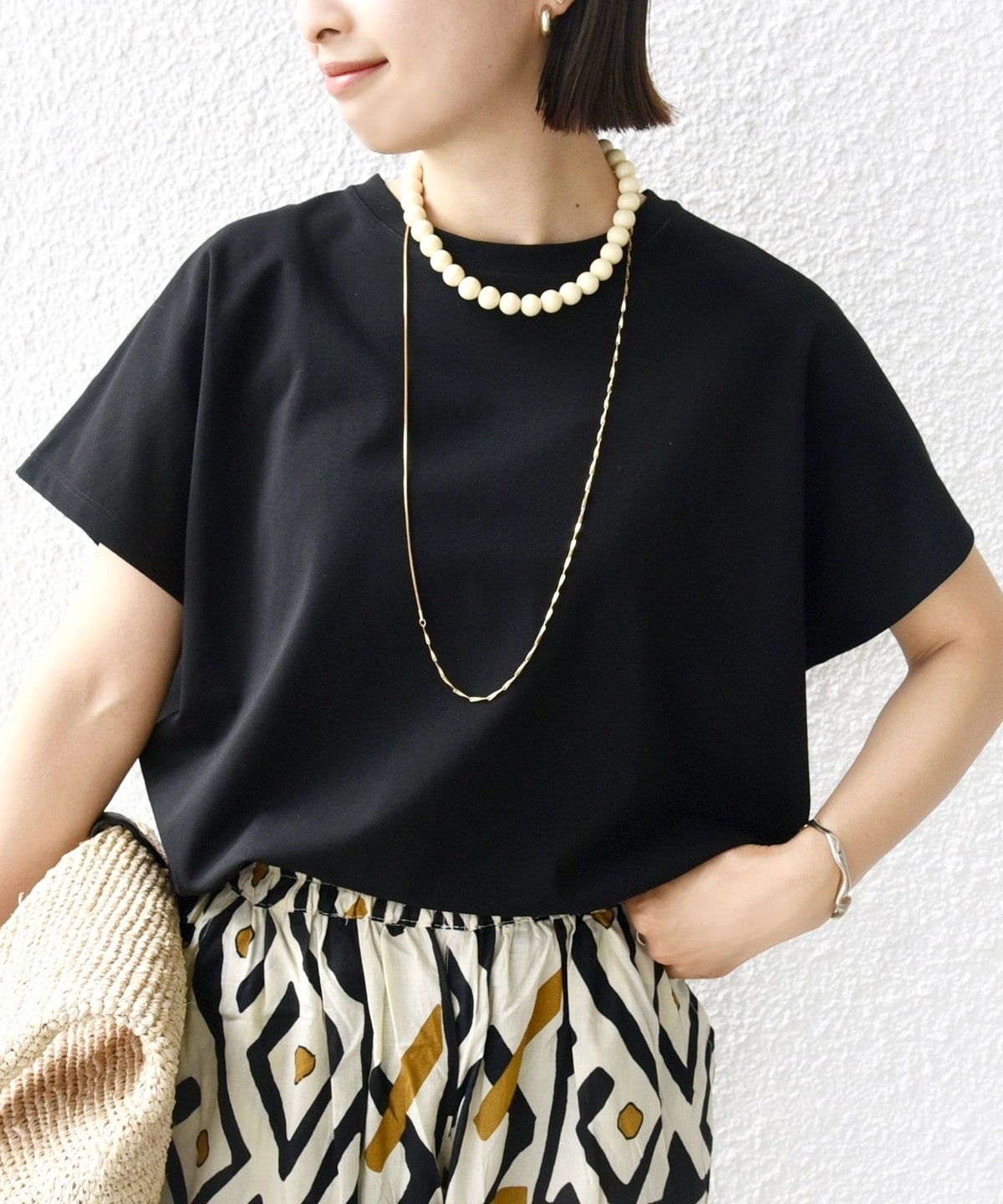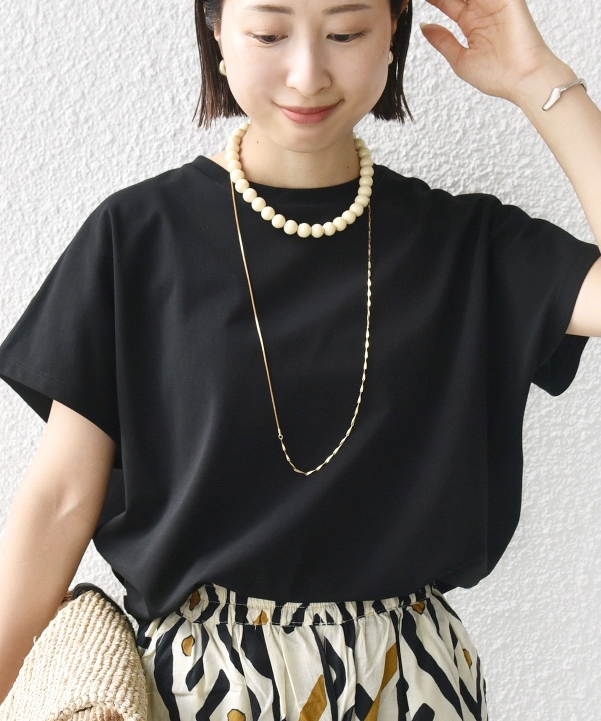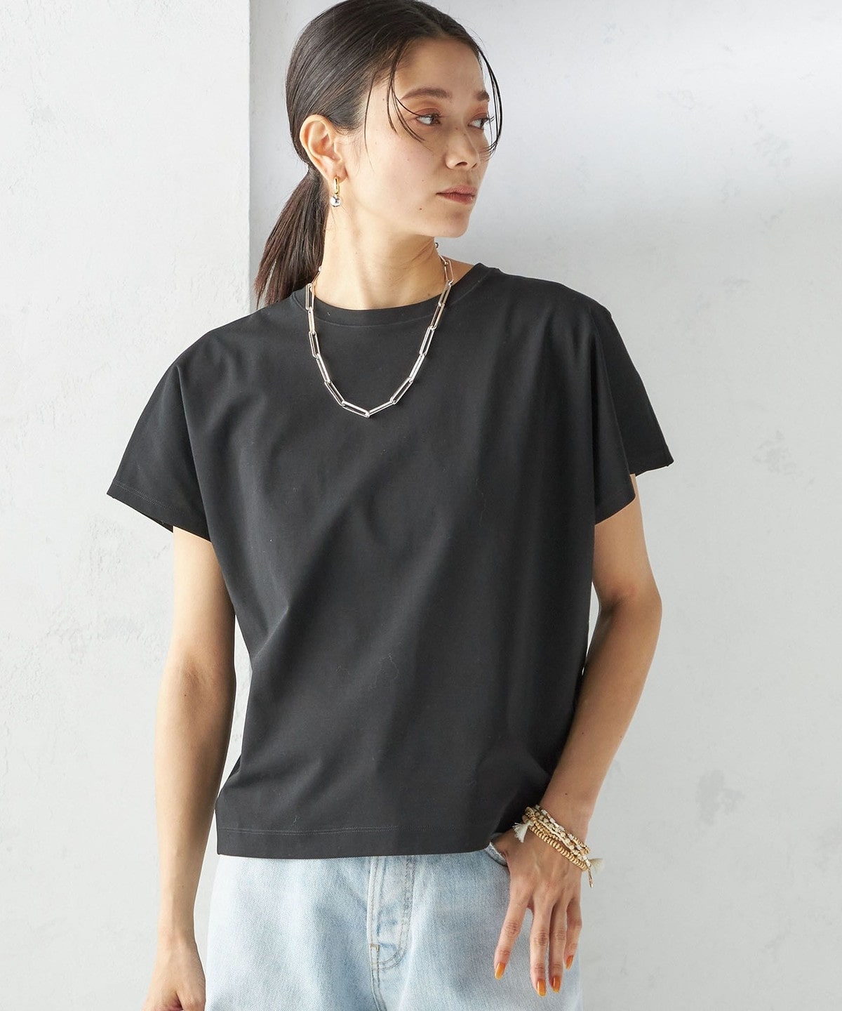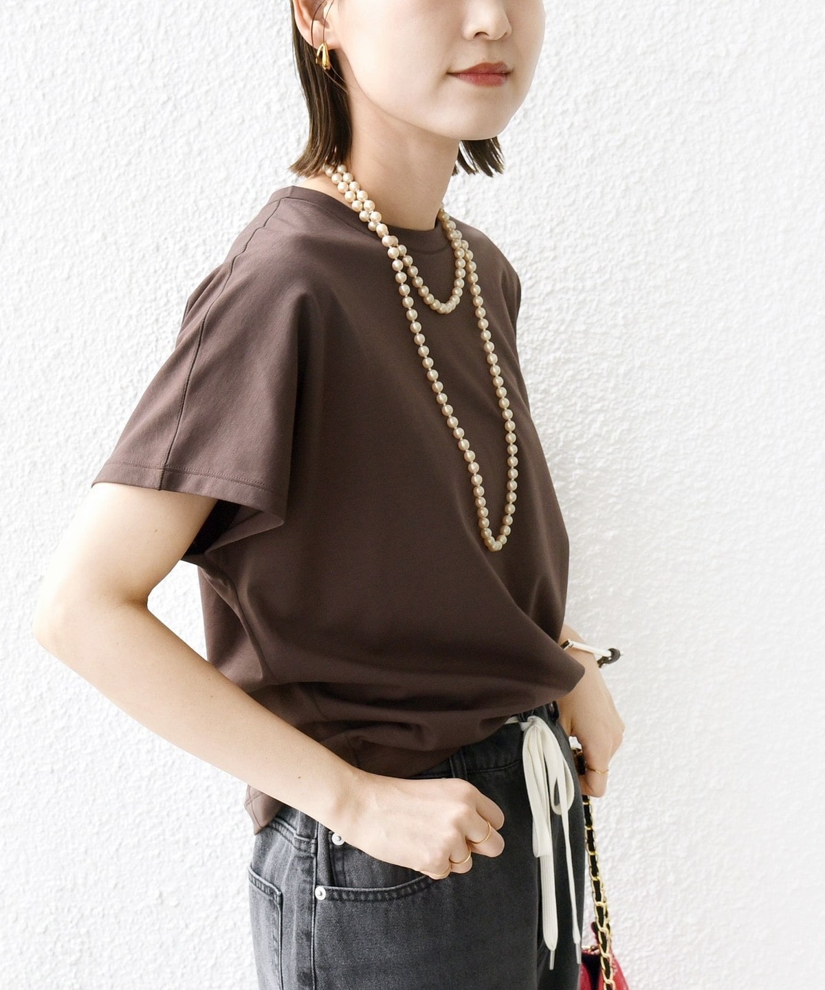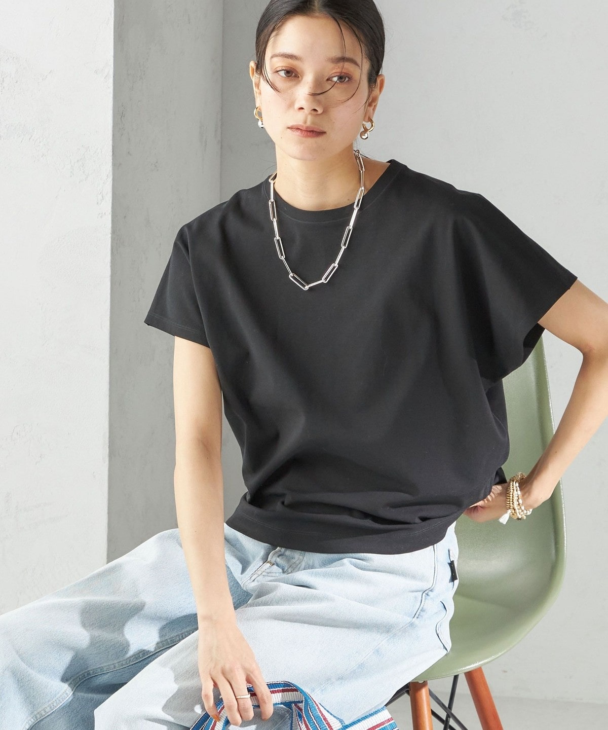 半袖のドルマンスリーブで程よくゆったりとしながらも、様々なボトムに合わせやすいショート丈です。