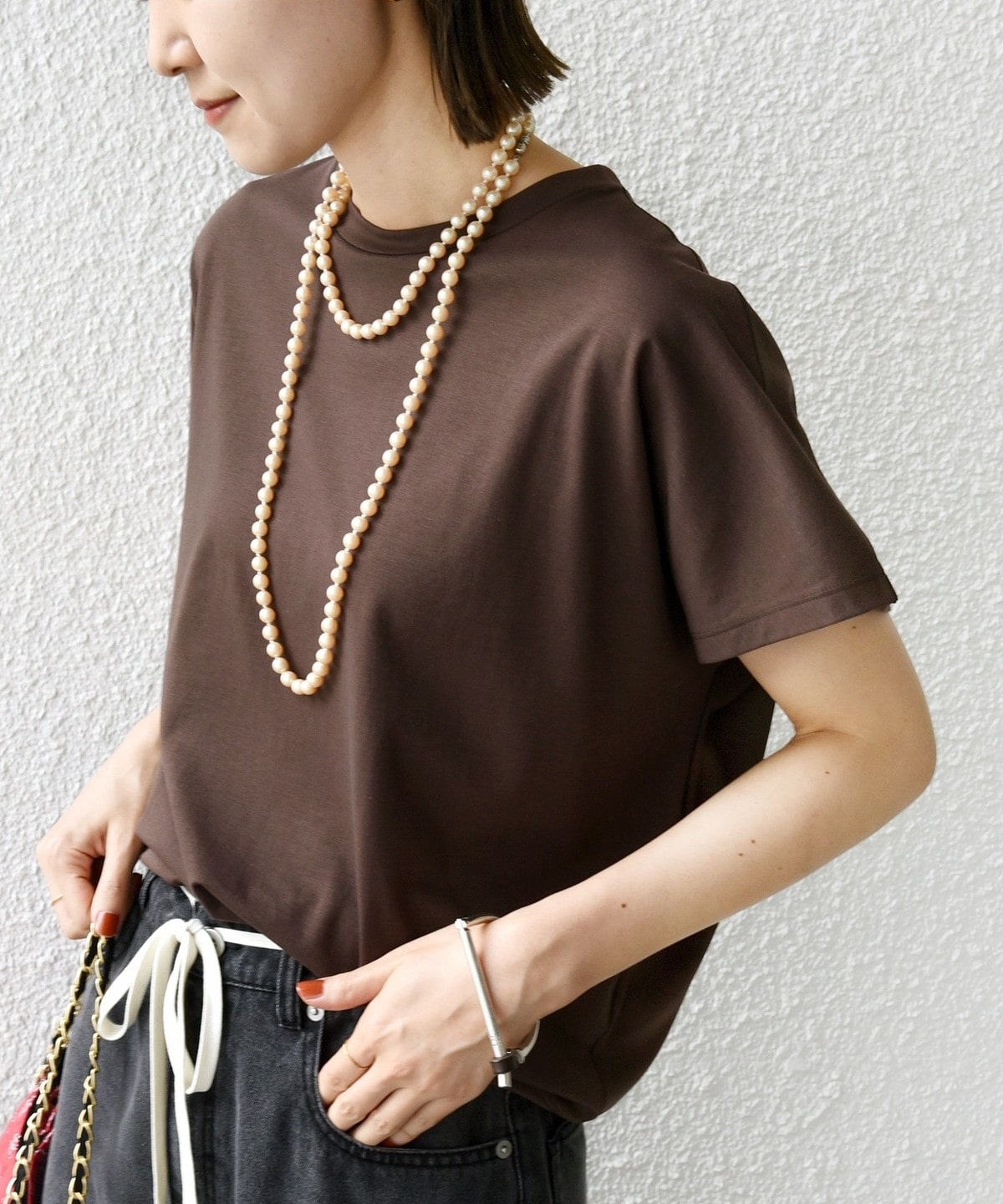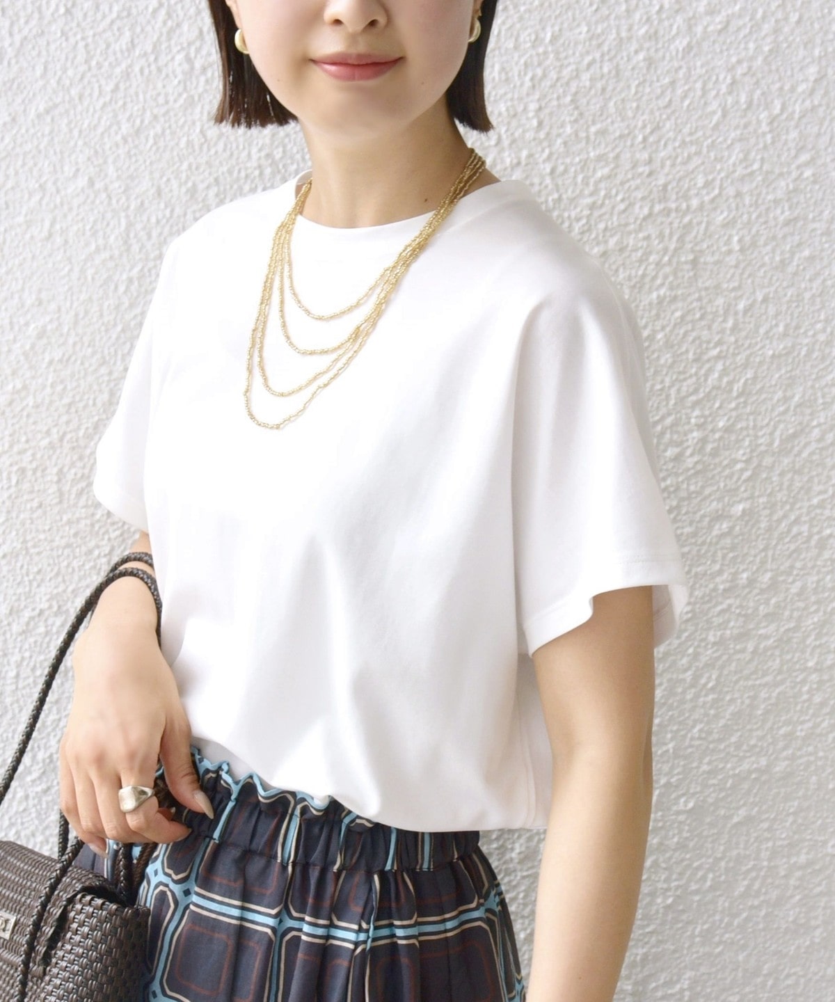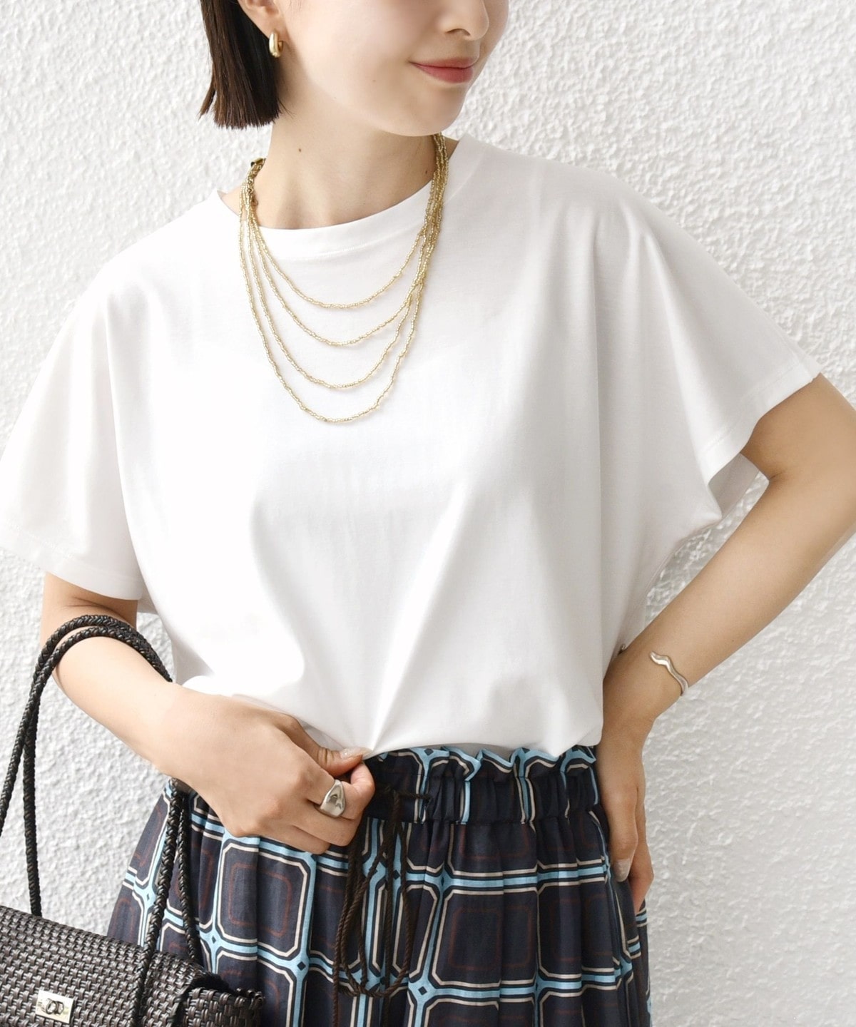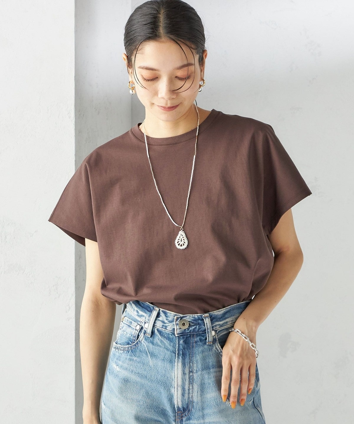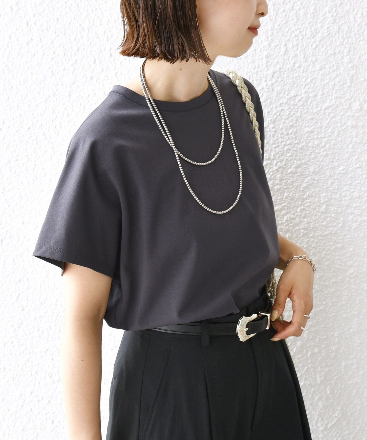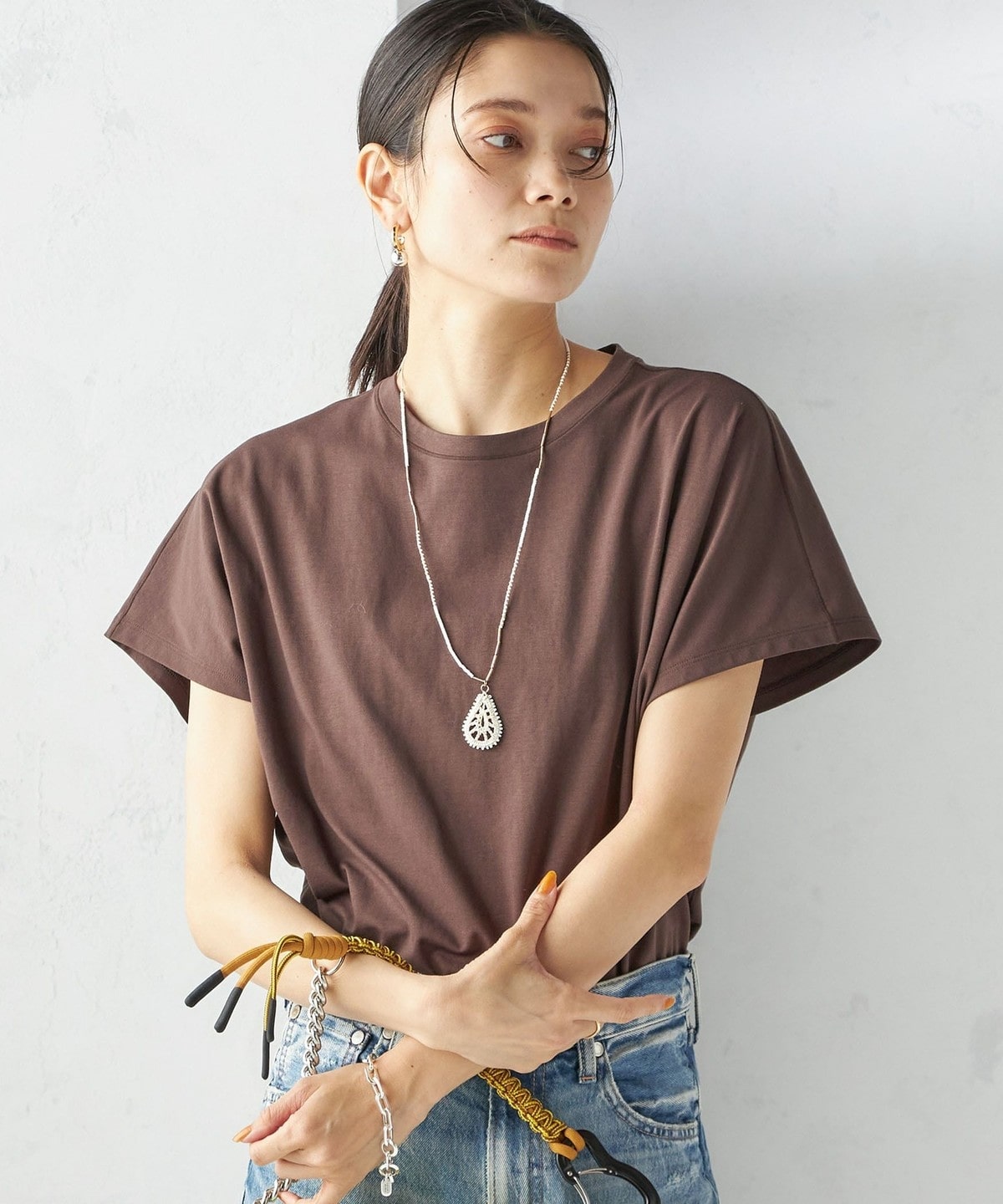 半袖のドルマンスリーブで程よくゆったりとしながらも、様々なボトムに合わせやすいショート丈です。