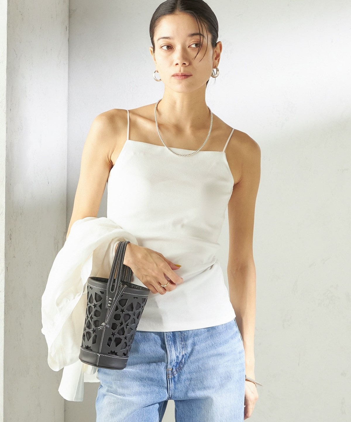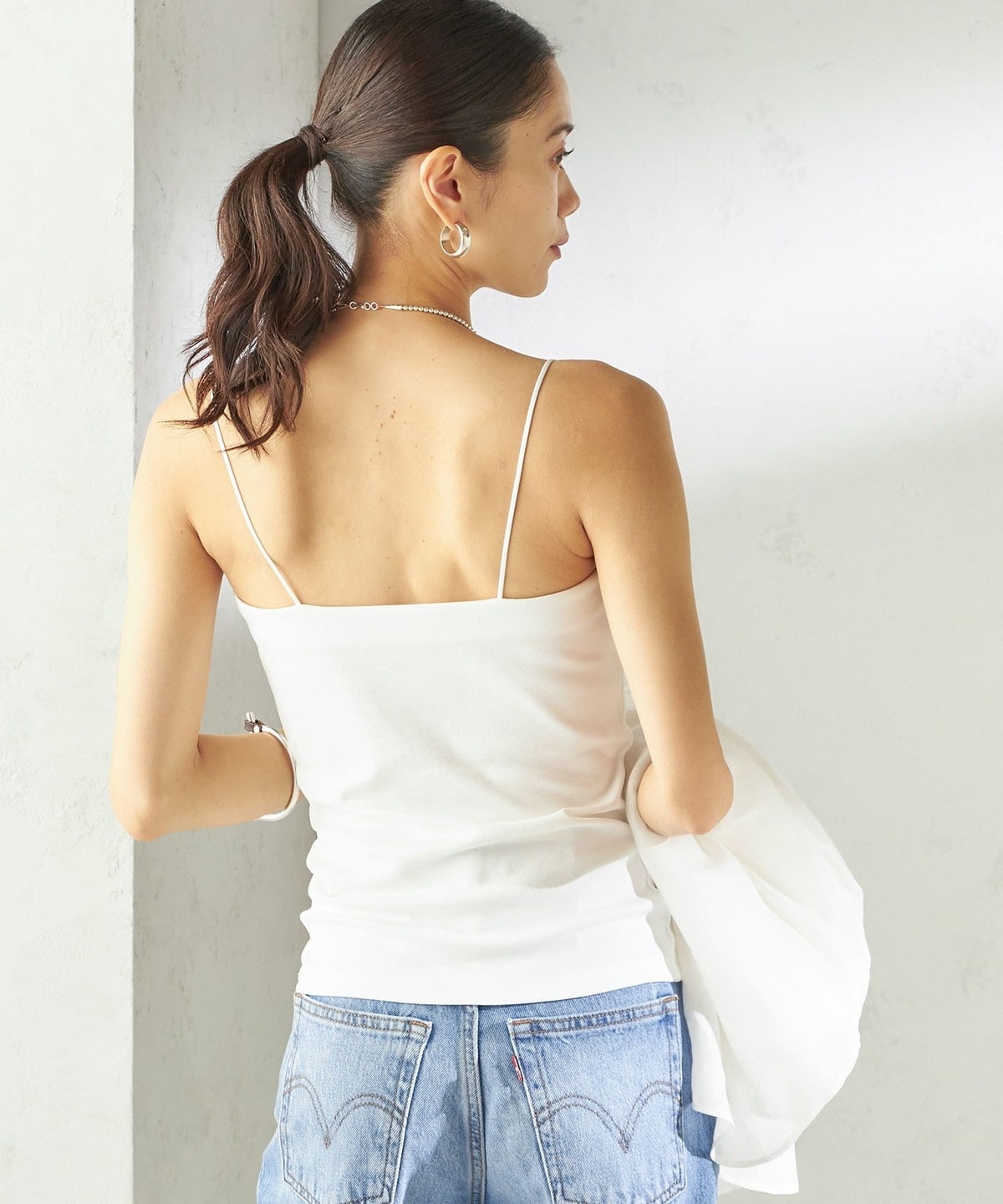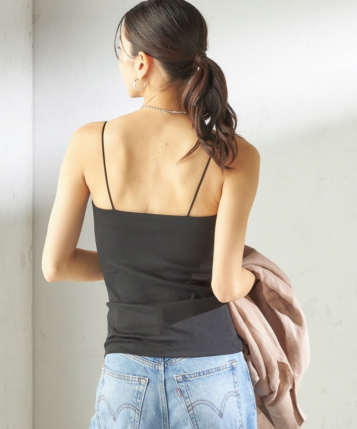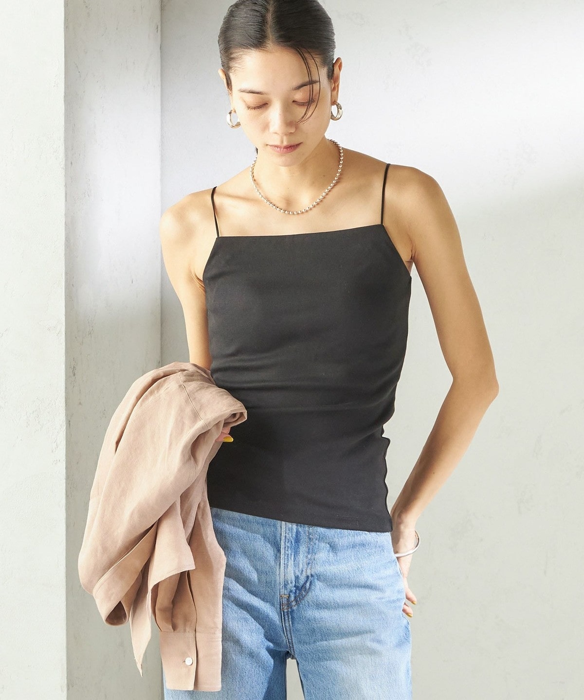 シャツやサマーニットのインナーとしてはもちろん、透け感のあるトップスと合わせてヘルシーな肌見せもおすすめ。