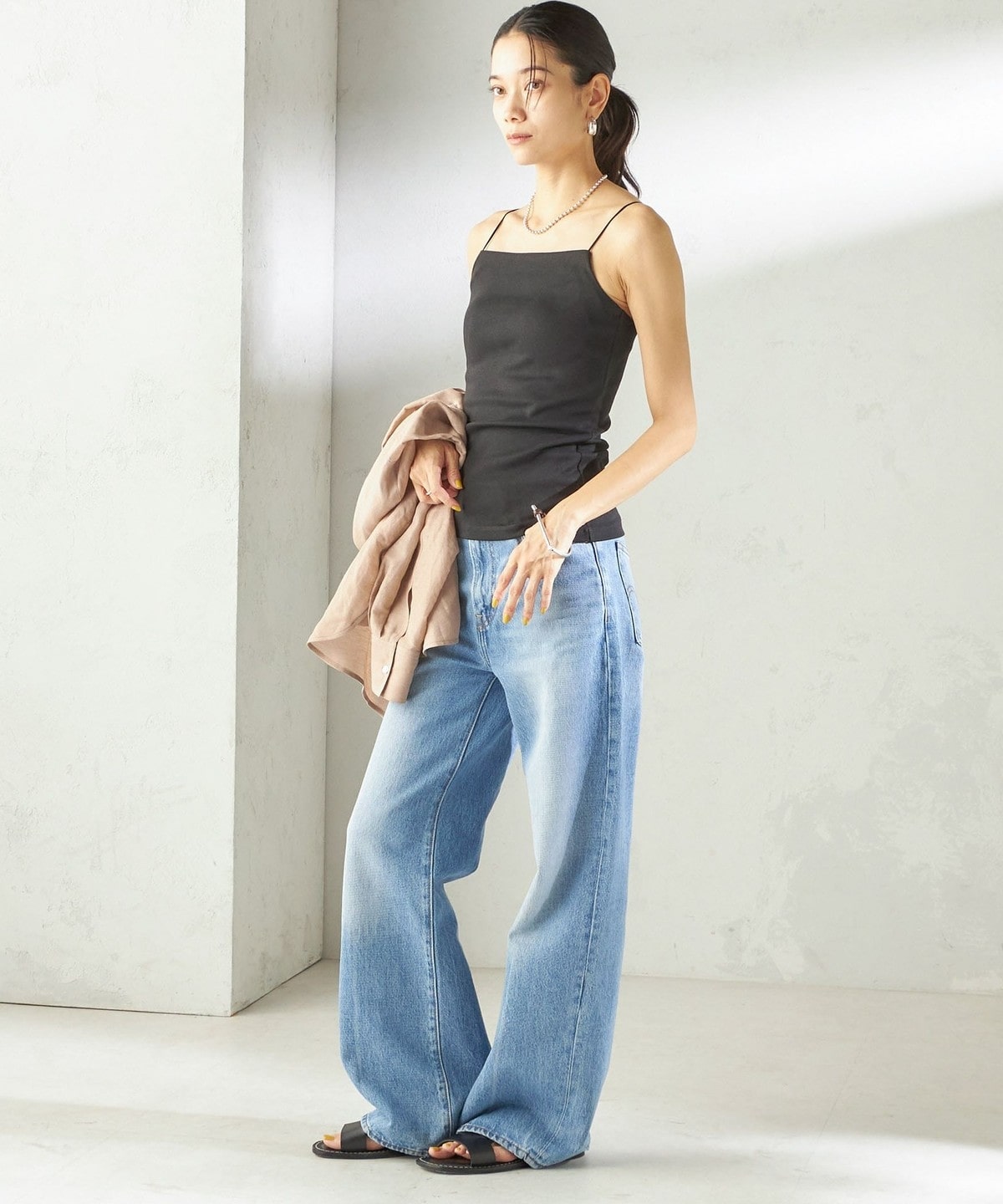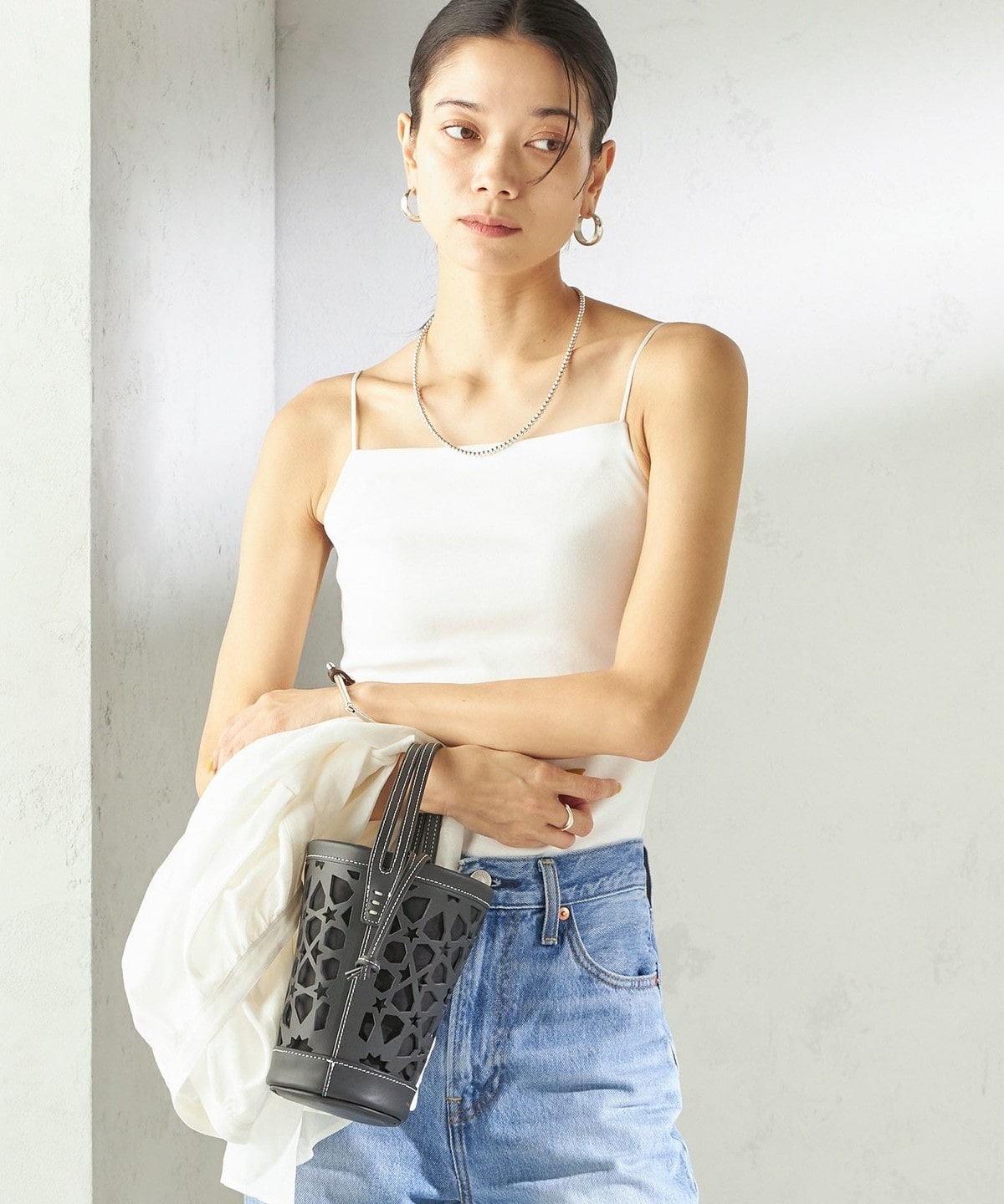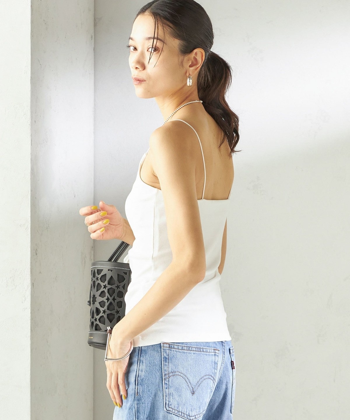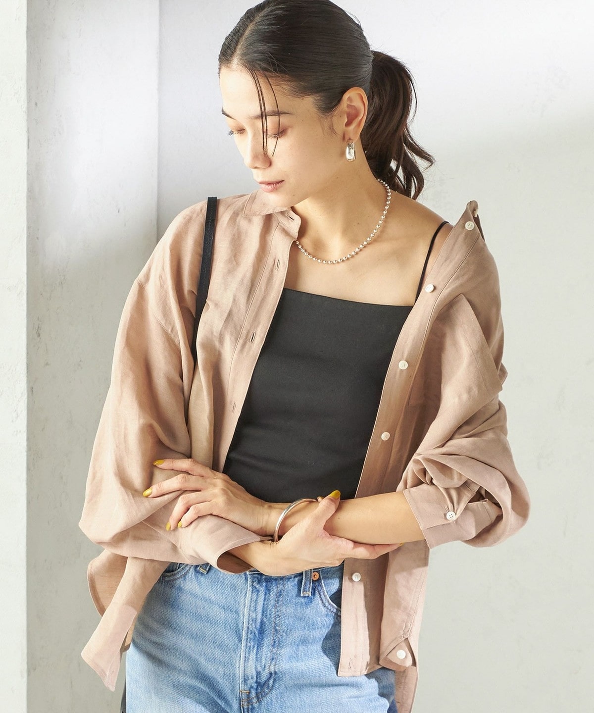 シャツやサマーニットのインナーとしてはもちろん、透け感のあるトップスと合わせてヘルシーな肌見せもおすすめ。