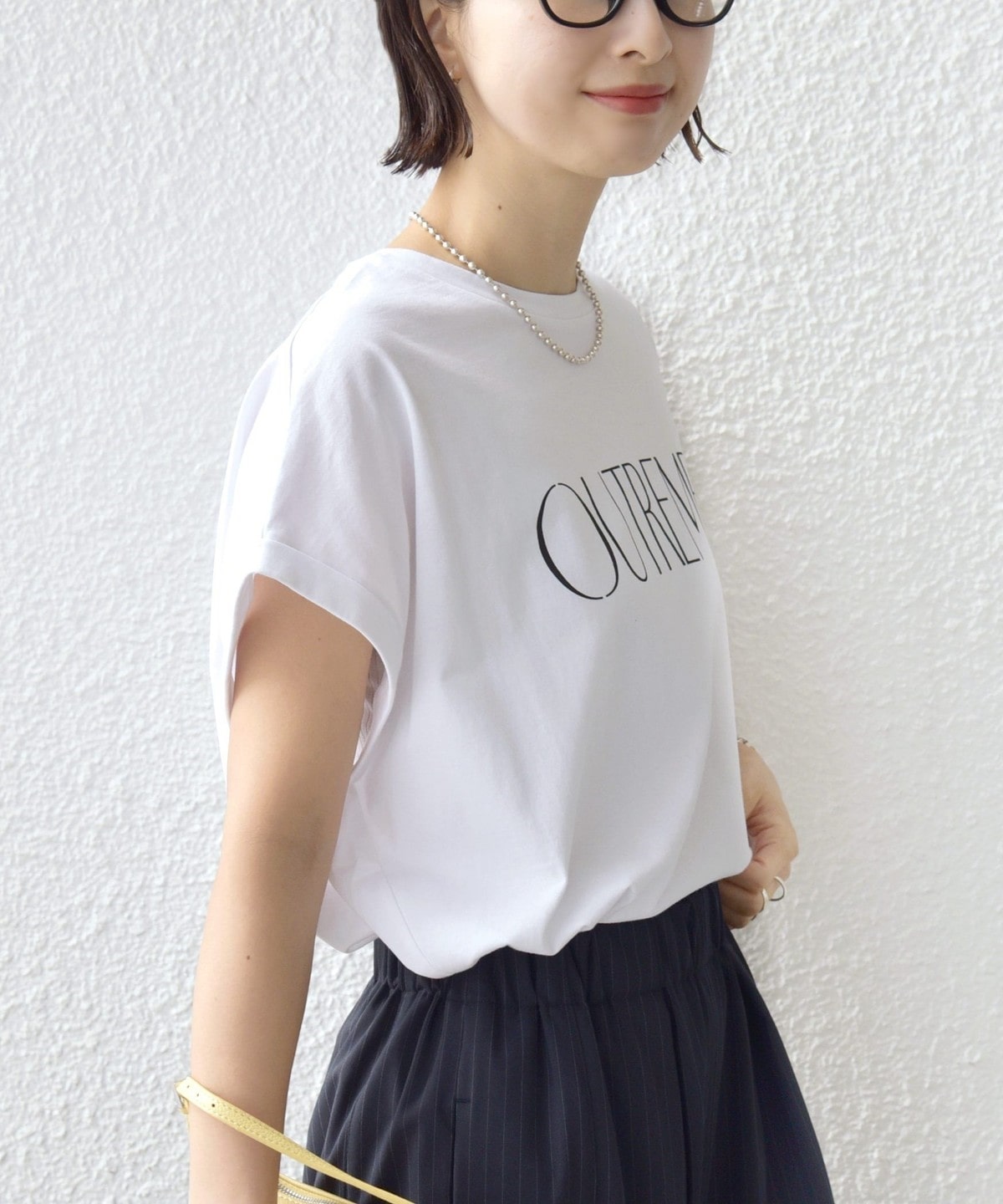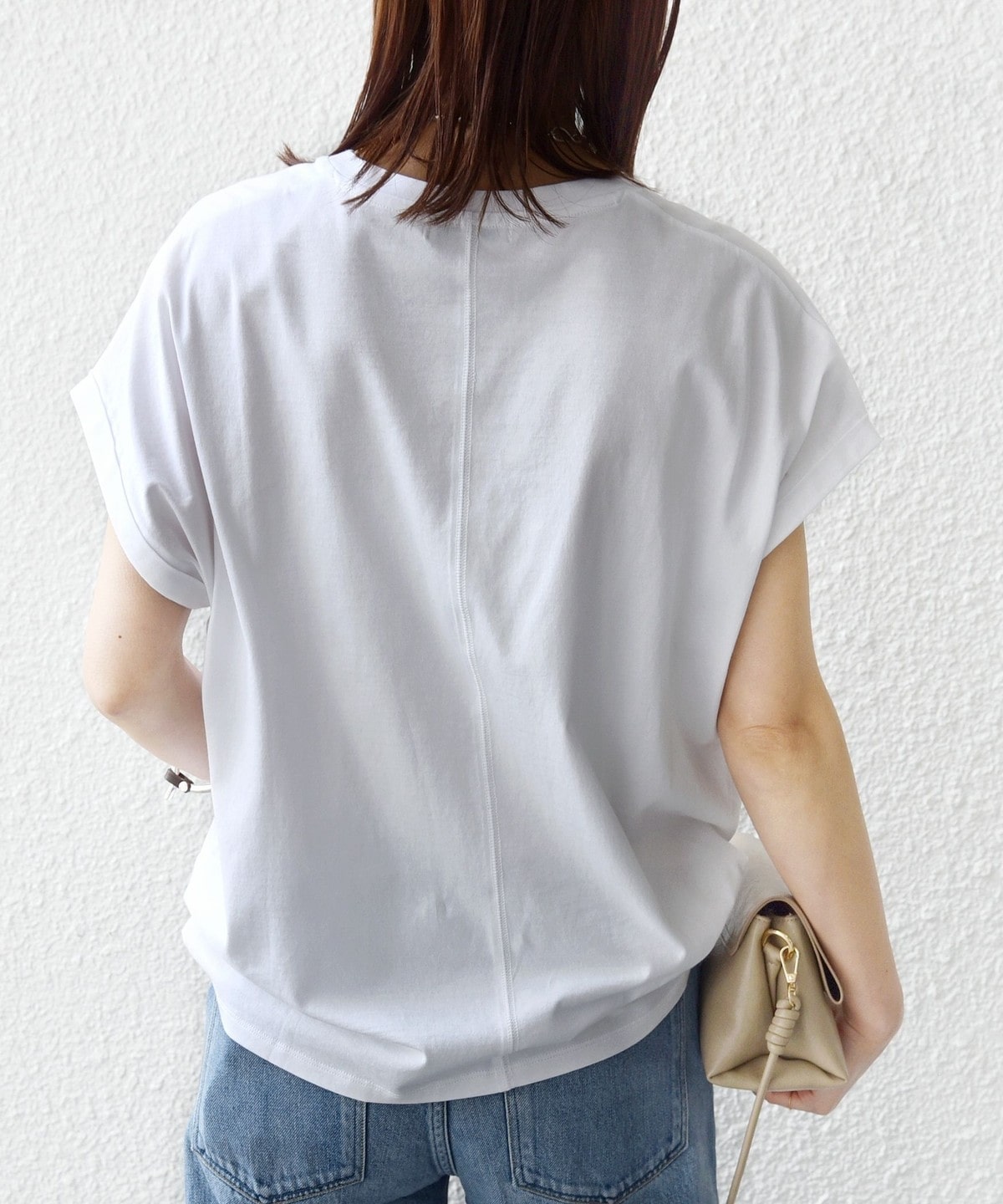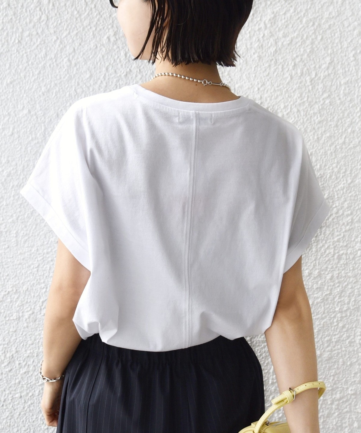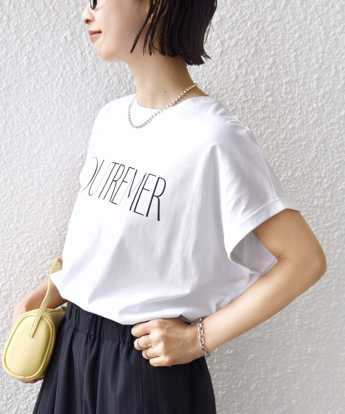 袖を折り返しにしたことでさっぱり見えがちな半袖Tシャツもデザイン性のある見え方に。