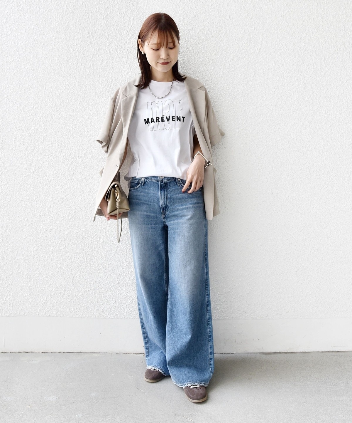 ゆったりしたサイズ感ですが脇線を少し前に振ることにより、スリム効果もプラスされ抜け感も◎。