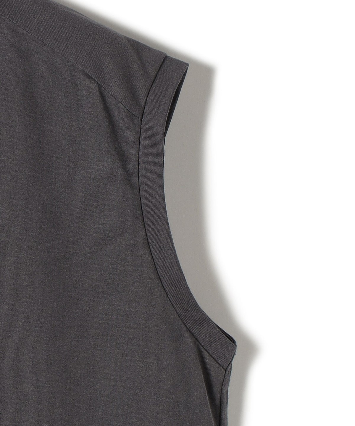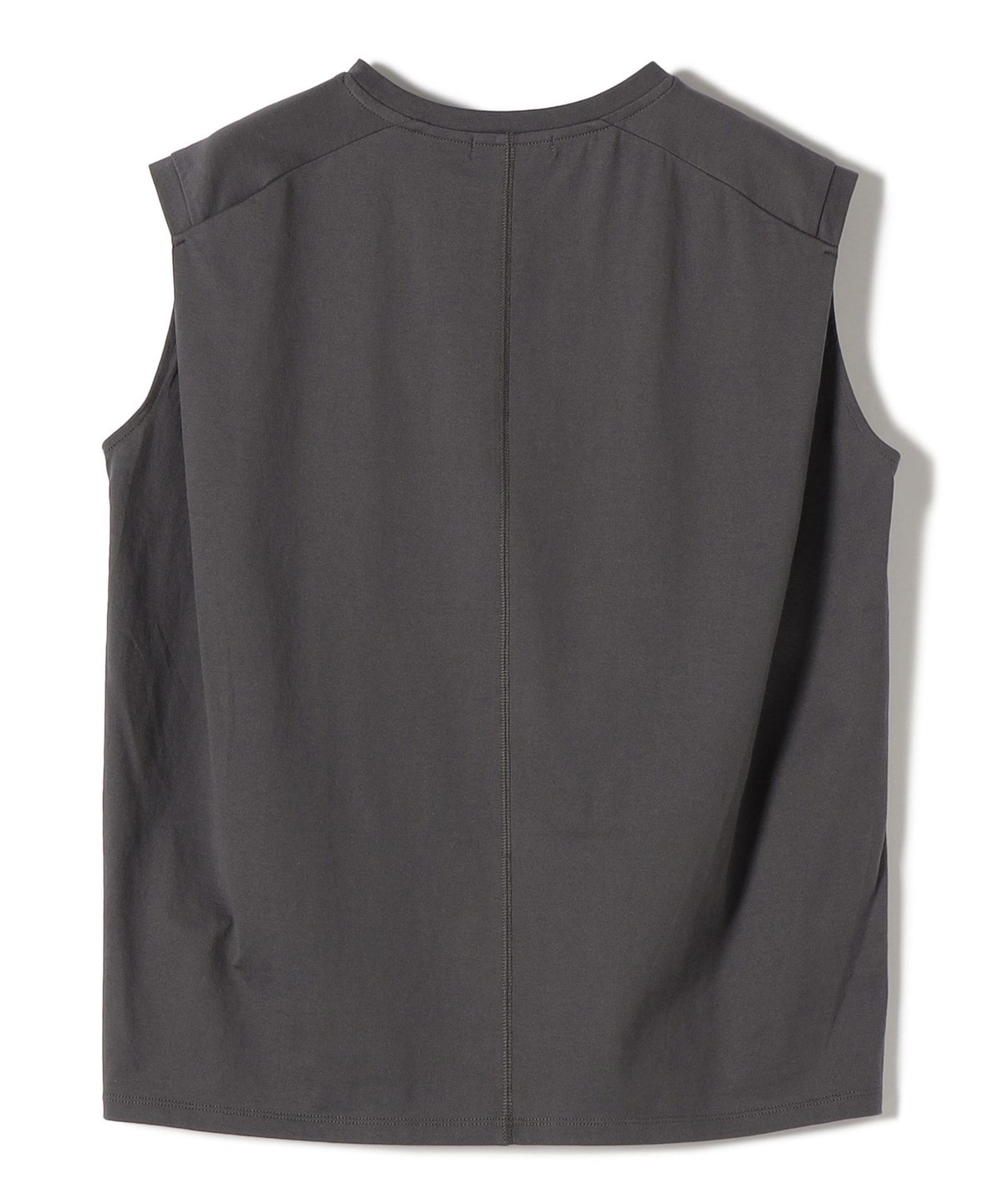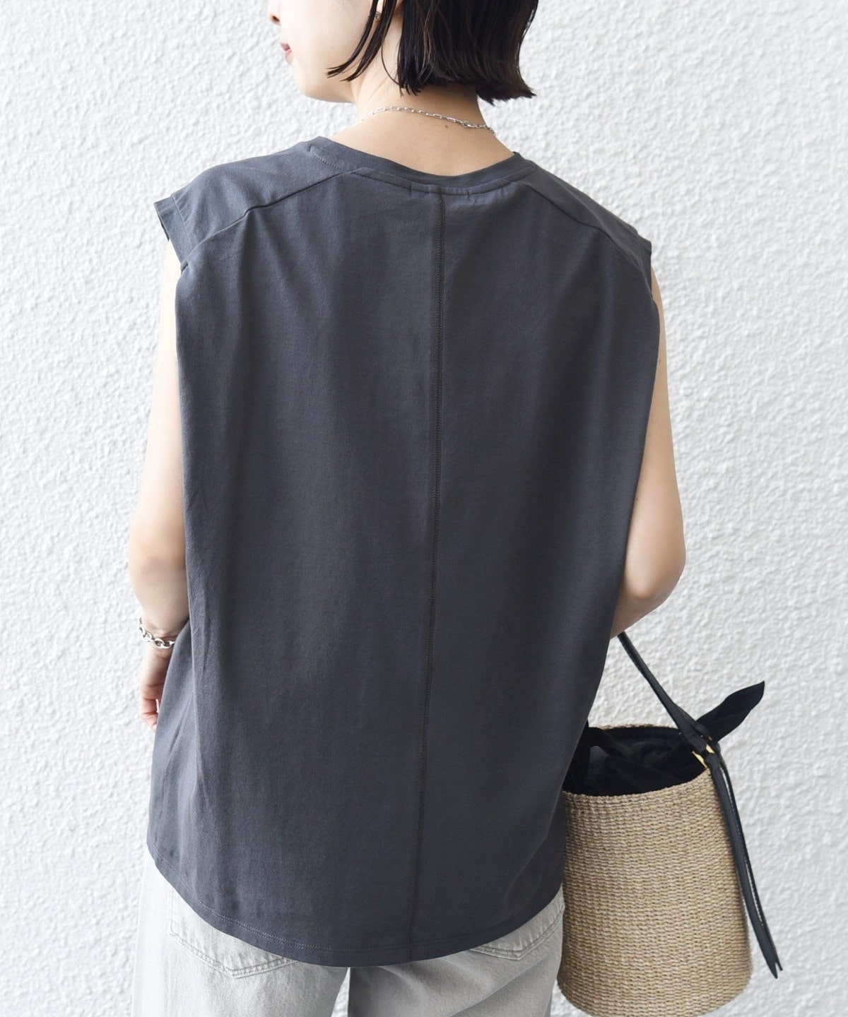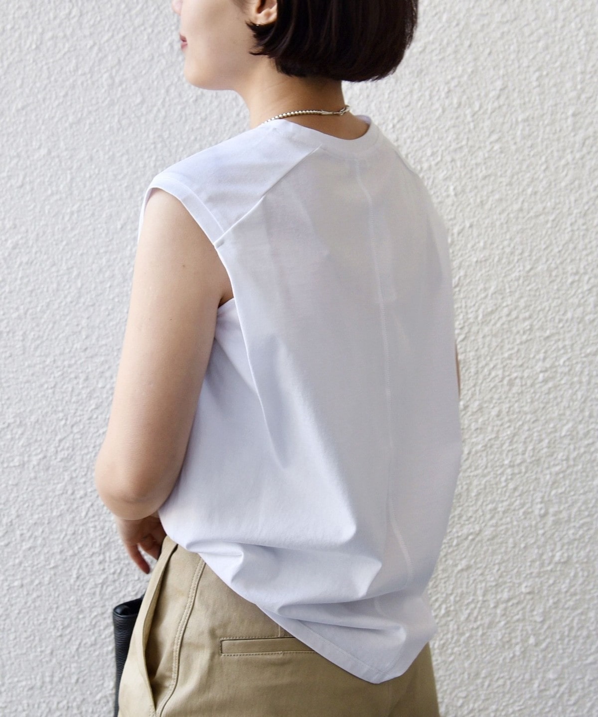 肩先まで掛かるノースリーブデザインで、腕部分は後ろのタックデザインにより、少し立体感が出るシルエットに仕上げています。