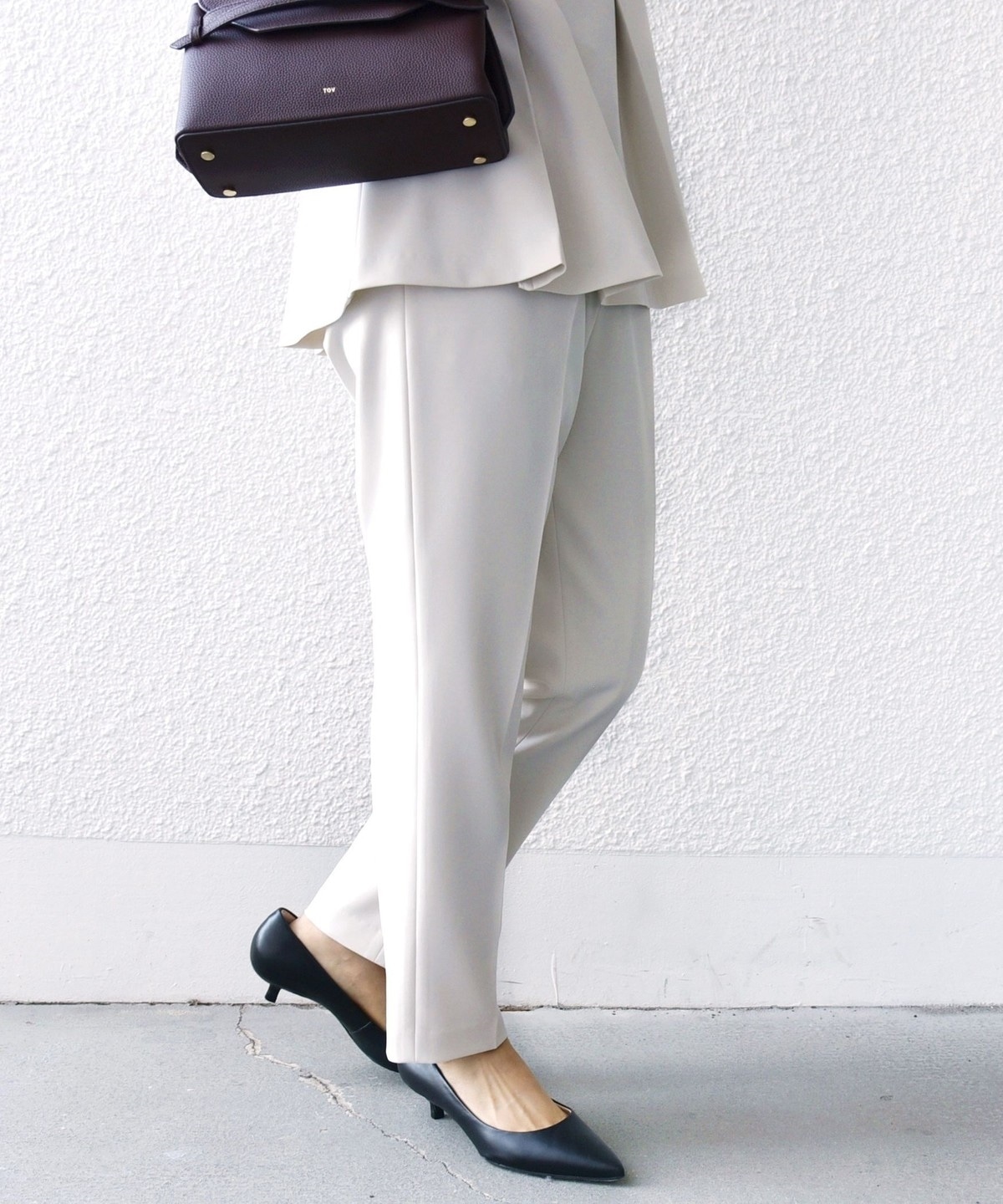 もちろんお手持ちのどんなジャケット・ブラウスとも着ていただけますのでビジネスシーンで1本は持っておきたいベーシックパンツです。