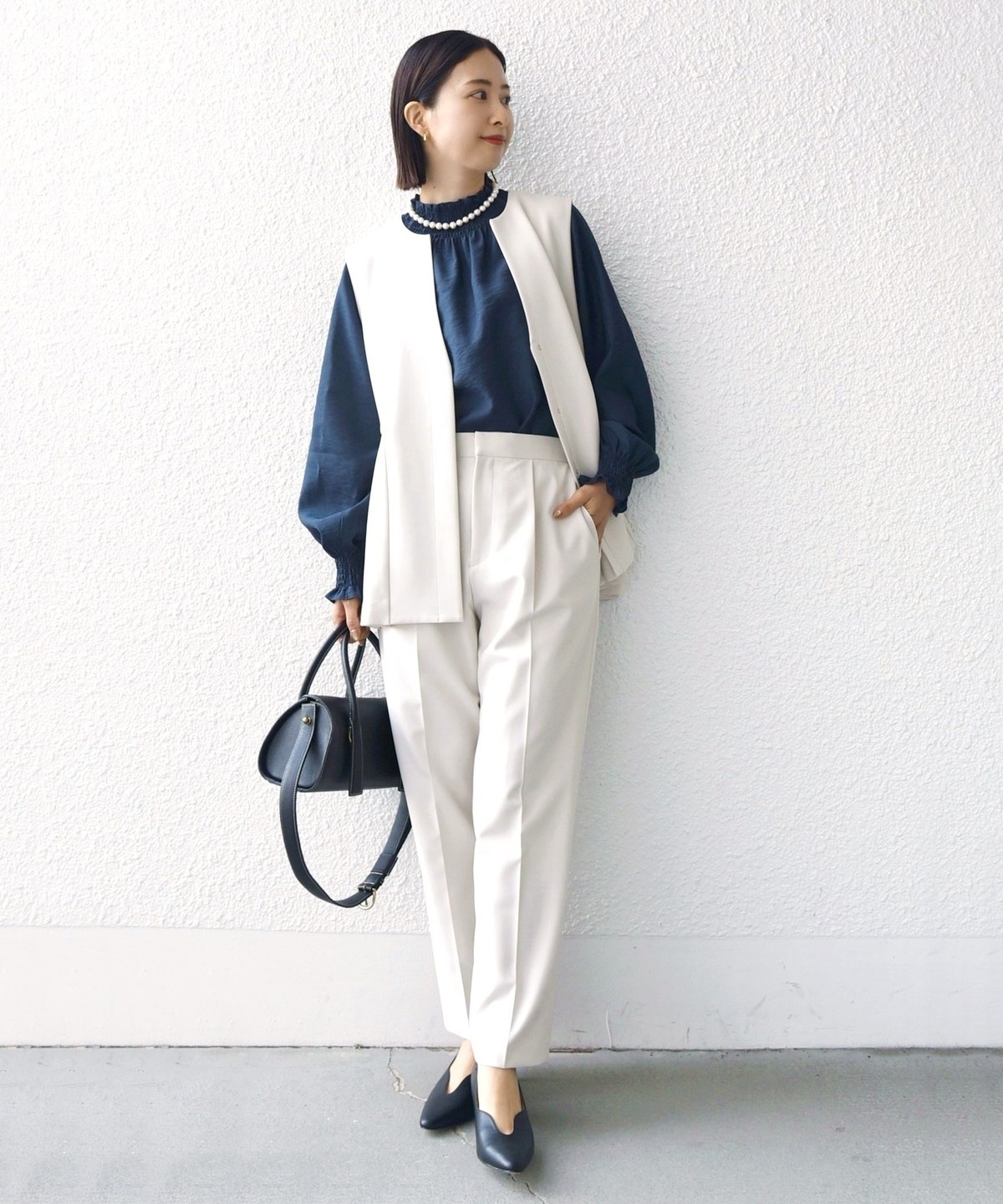 同素材のブラウス、ジレとセットアップで着ていただけます。