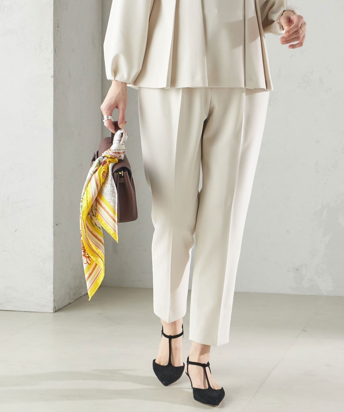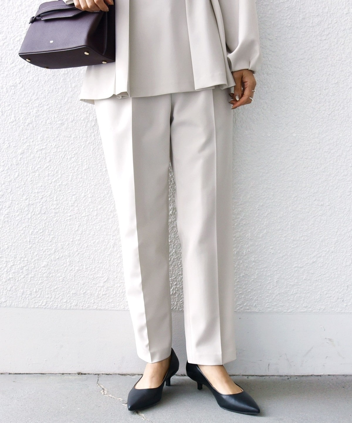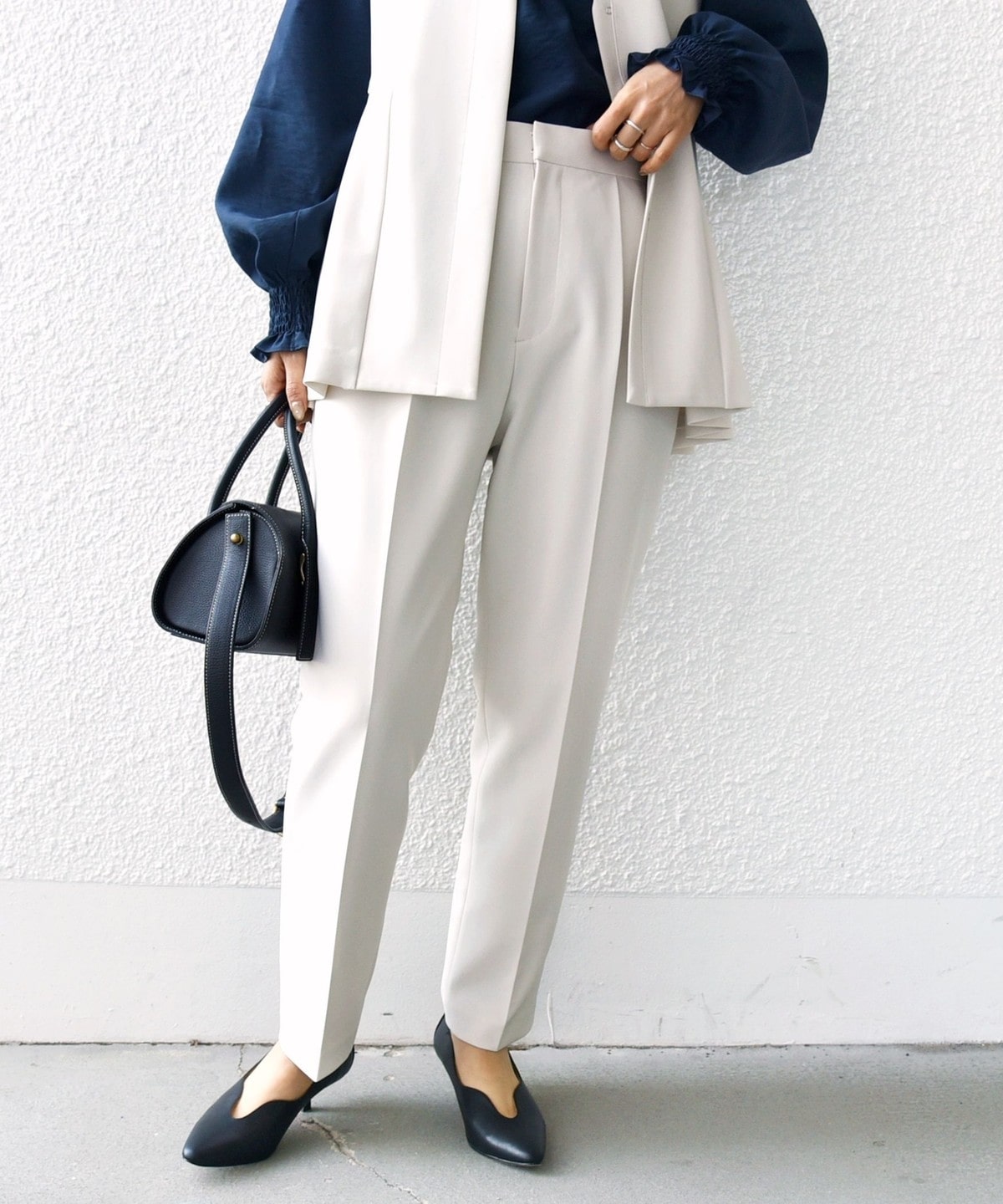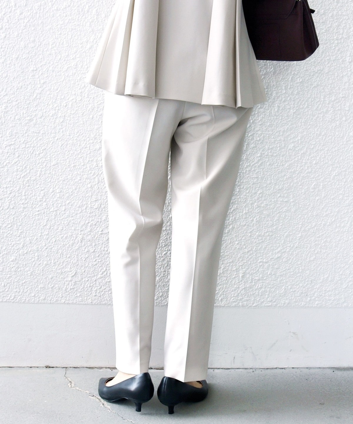 もちろんお手持ちのどんなジャケット・ブラウスとも着ていただけますのでビジネスシーンで1本は持っておきたいベーシックパンツです。