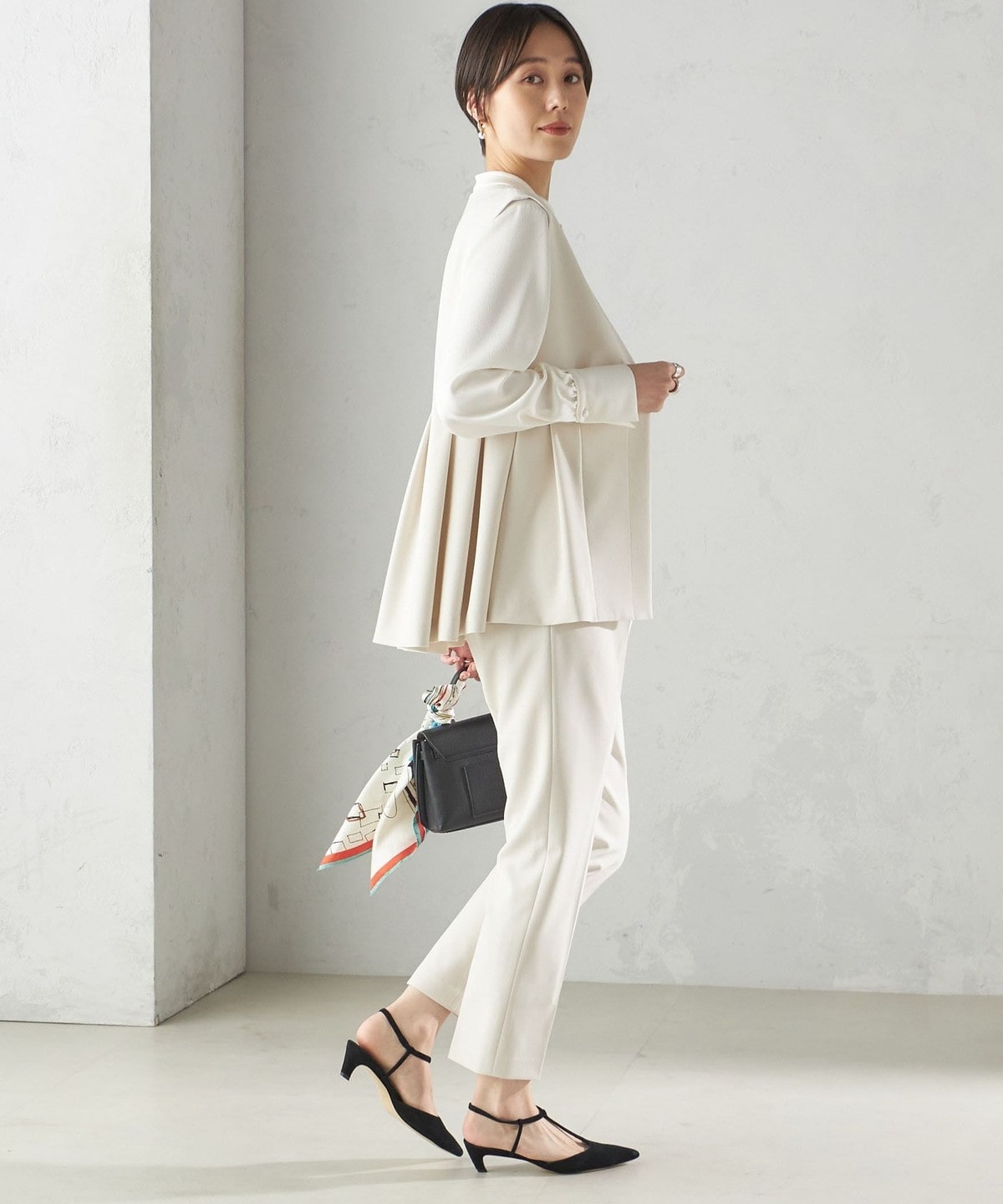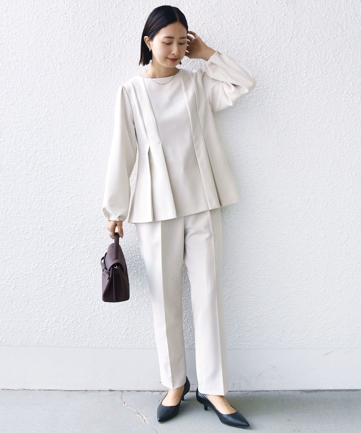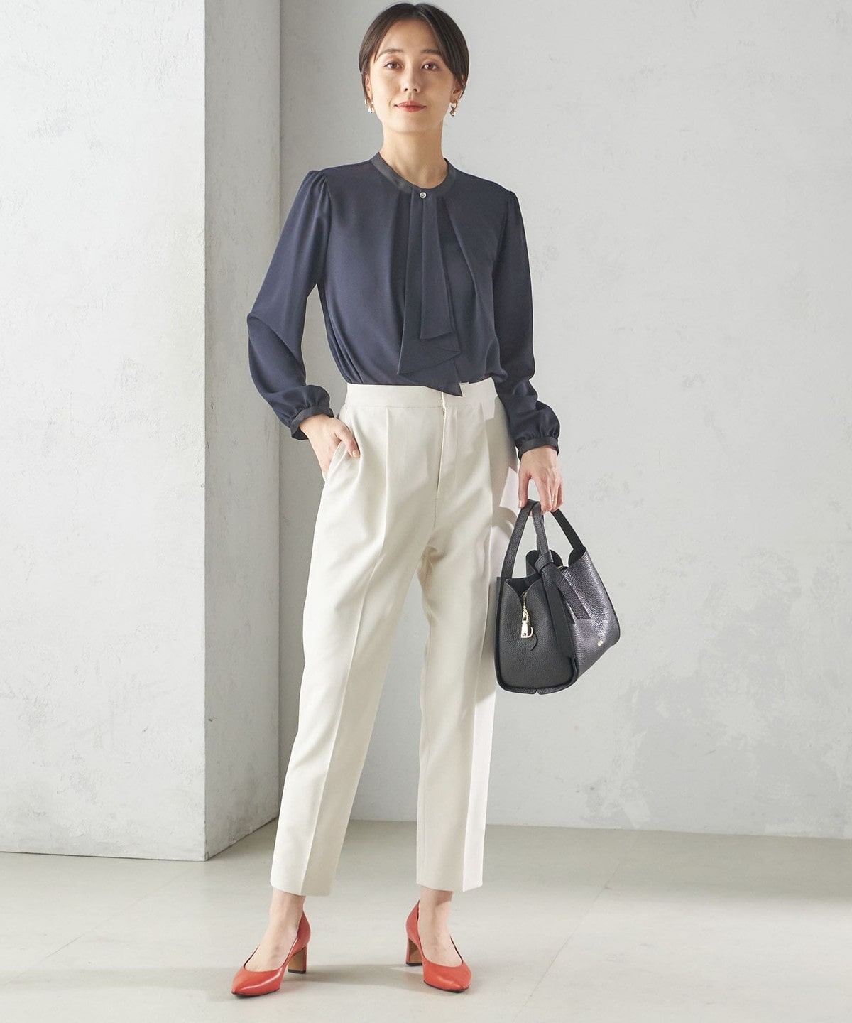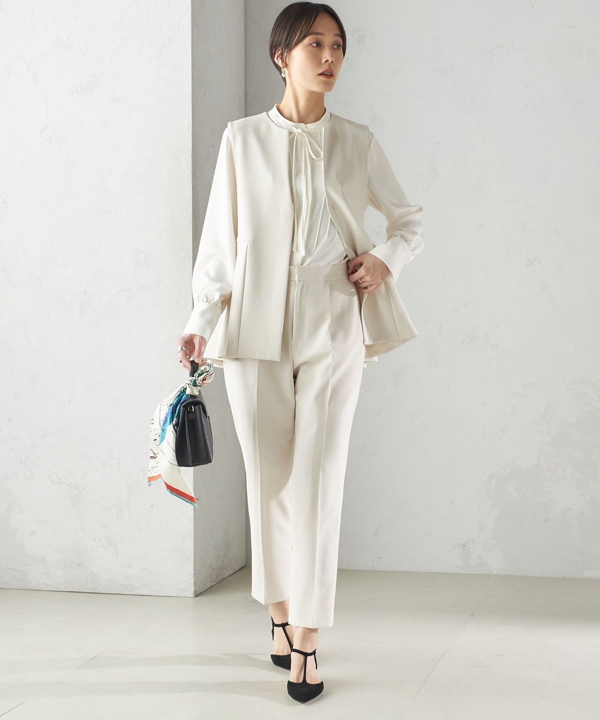 もちろんお手持ちのどんなジャケット・ブラウスとも着ていただけますのでビジネスシーンで1本は持っておきたいベーシックパンツです。