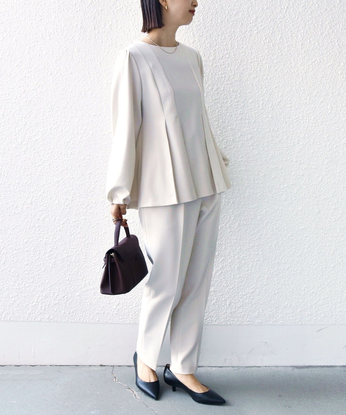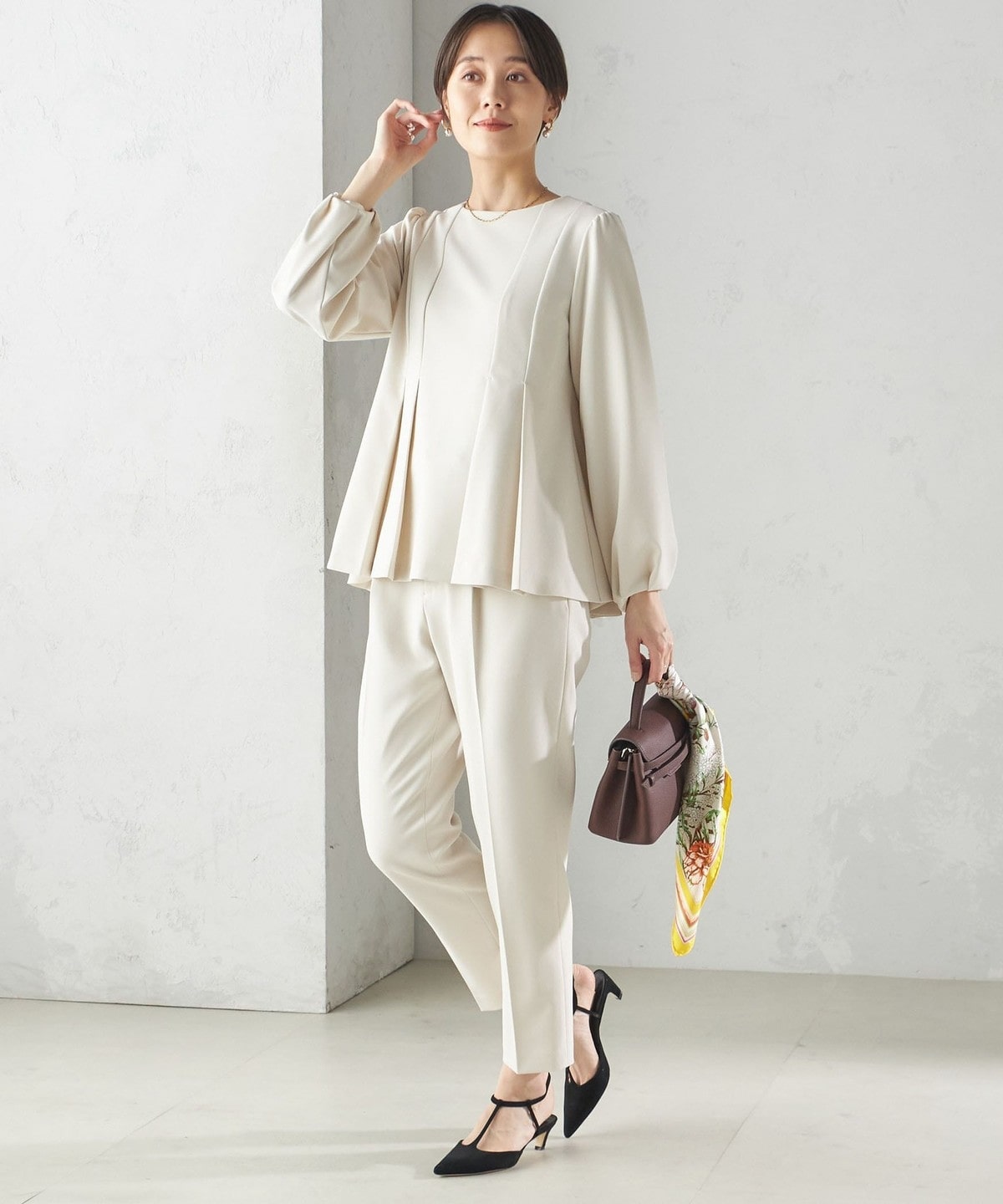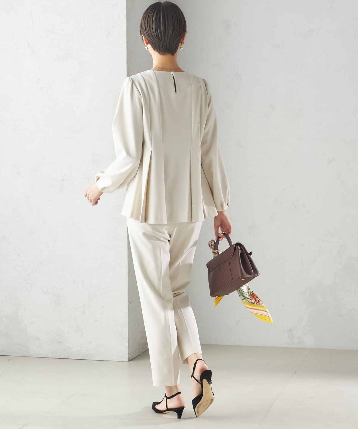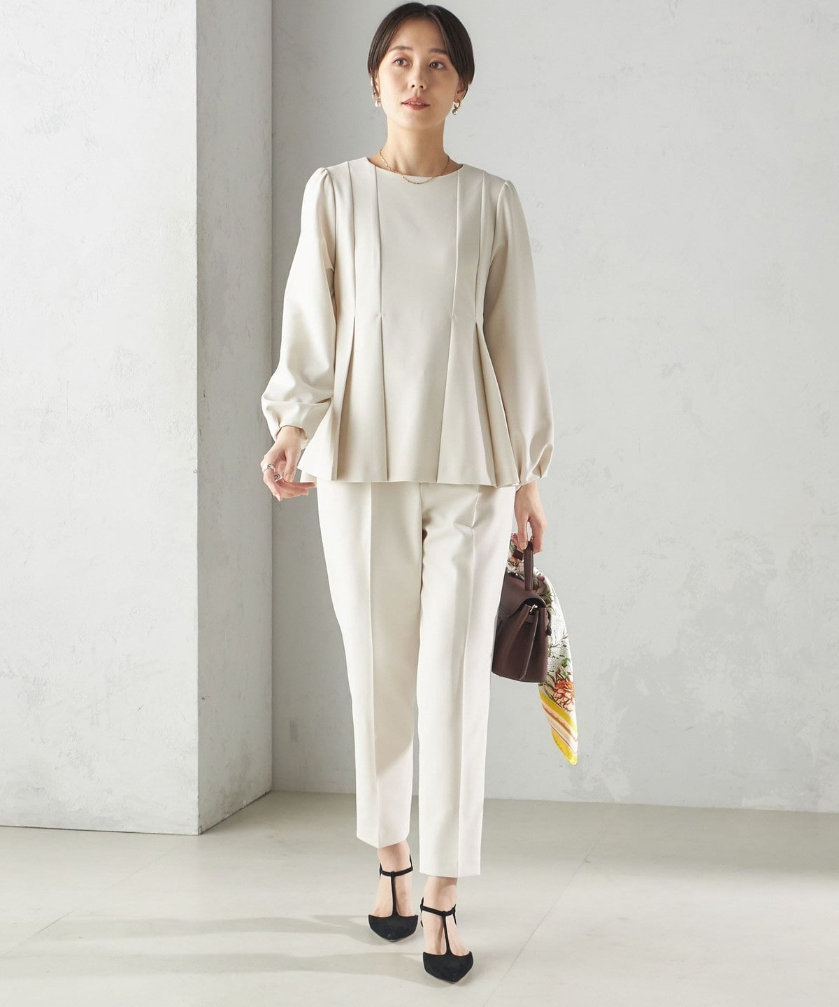 もちろんお手持ちのどんなジャケット・ブラウスとも着ていただけますのでビジネスシーンで1本は持っておきたいベーシックパンツです。