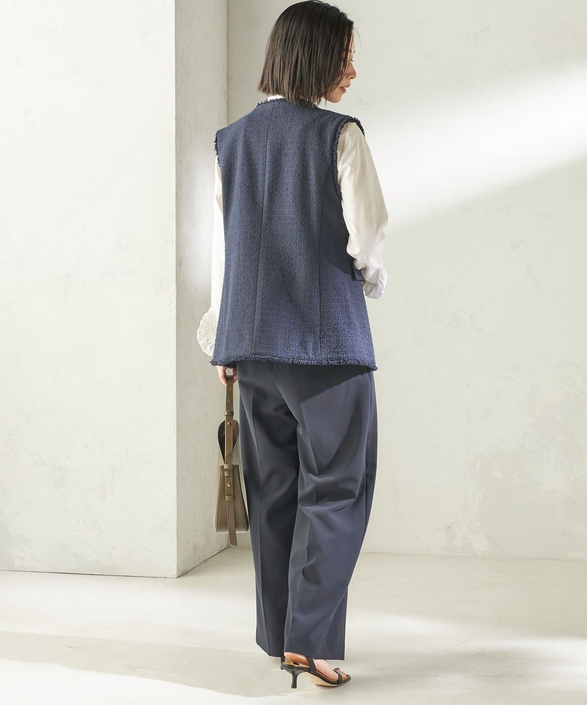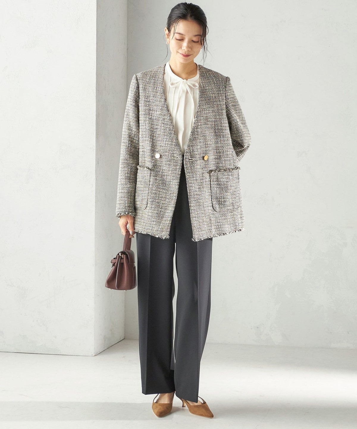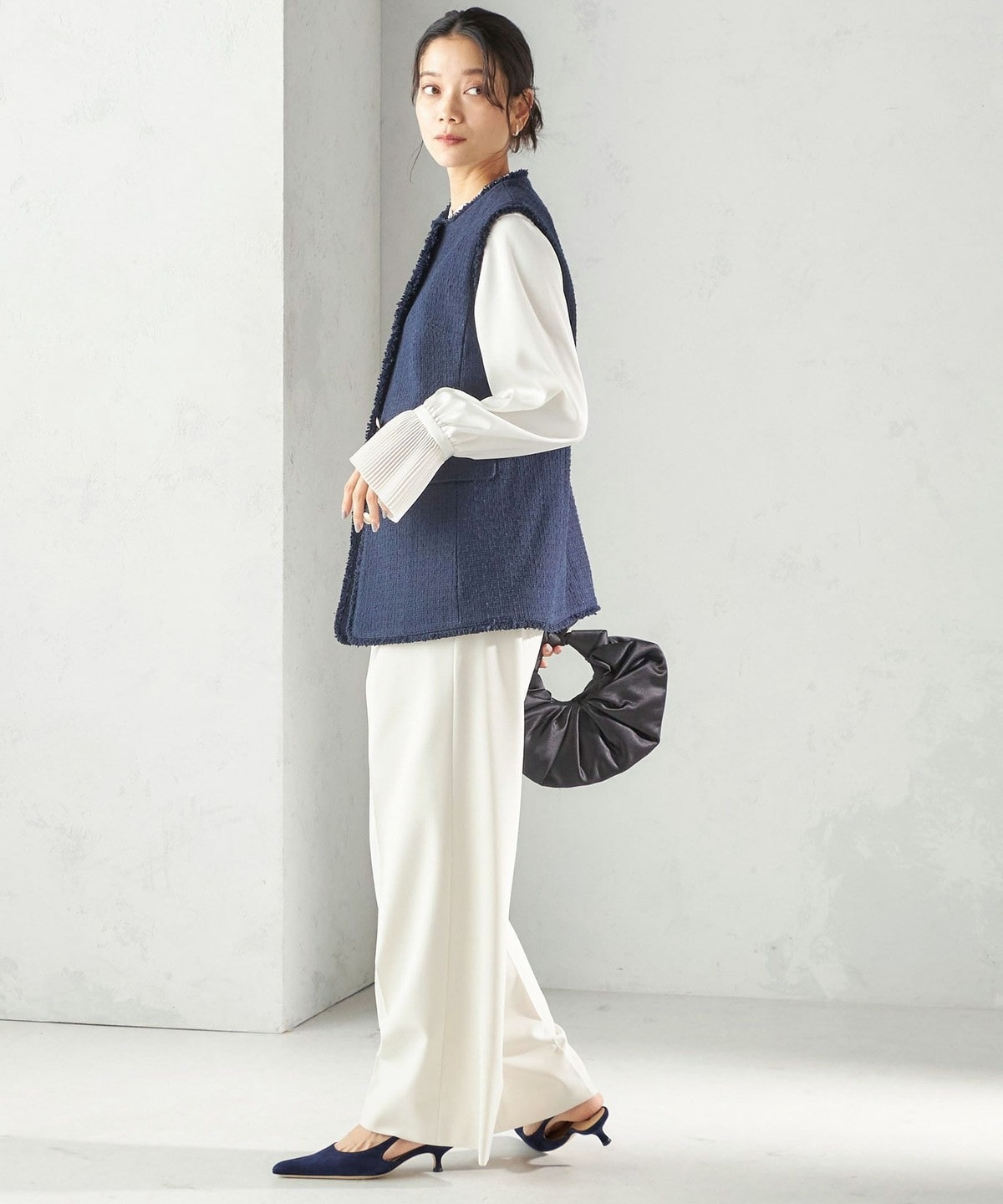 ツイード素材のジレやジャケットとも相性が良い万能なデザインなので、お手持ちのトップスに合わせて幅広くご活用いただけます。