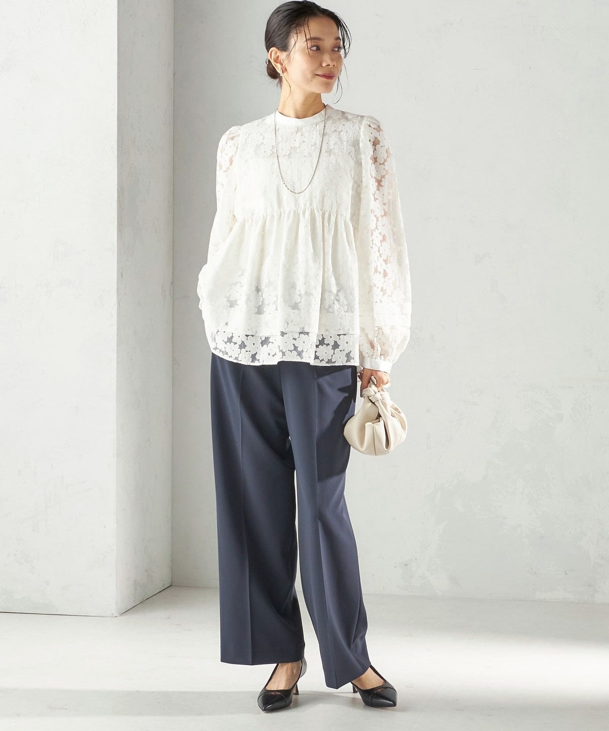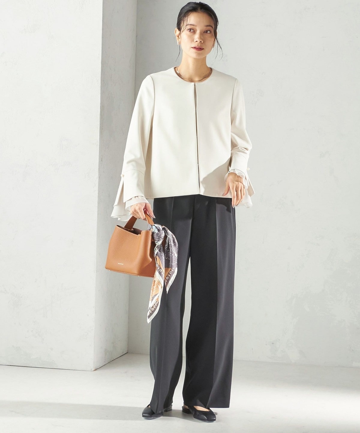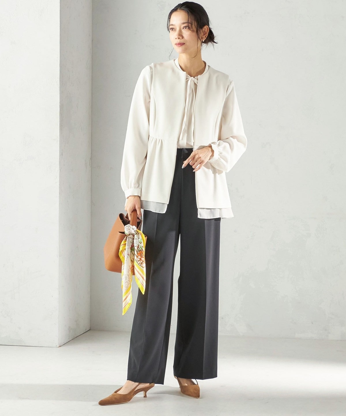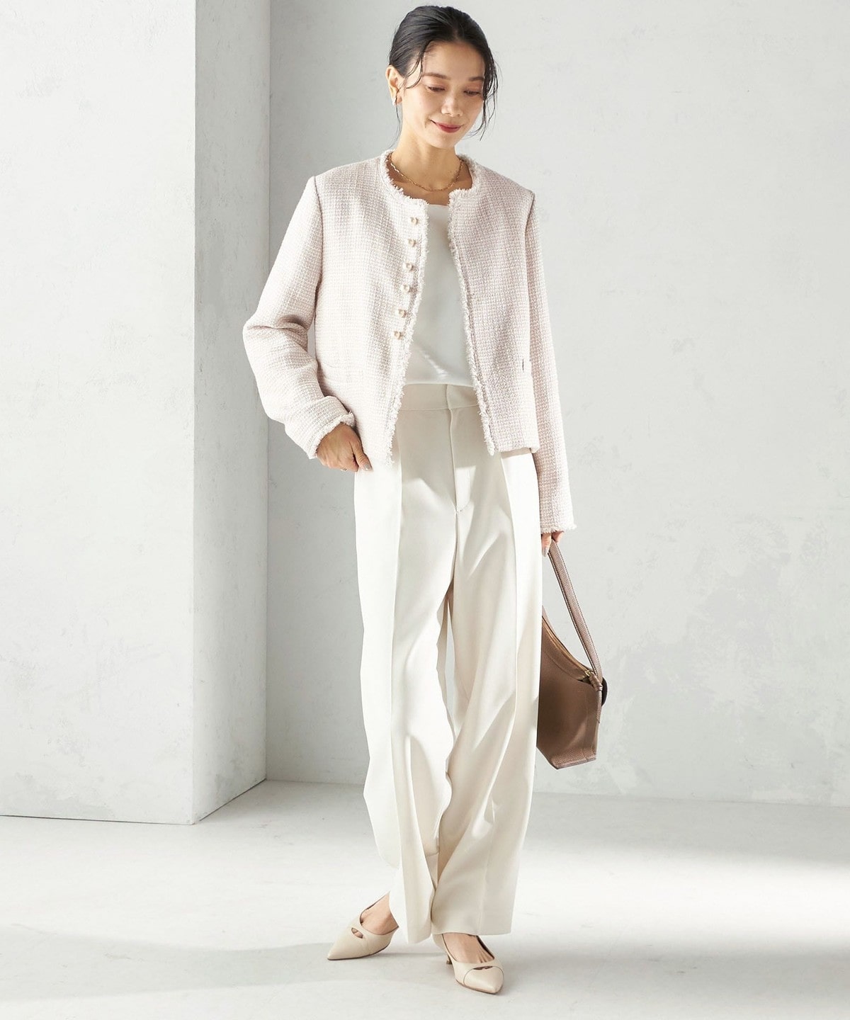 ツイード素材のジレやジャケットとも相性が良い万能なデザインなので、お手持ちのトップスに合わせて幅広くご活用いただけます。