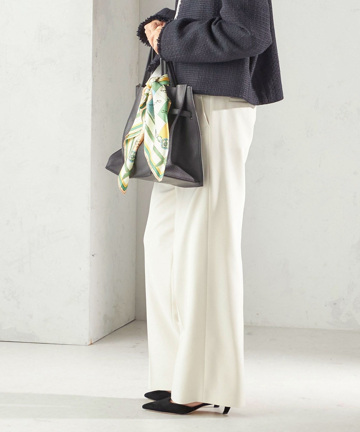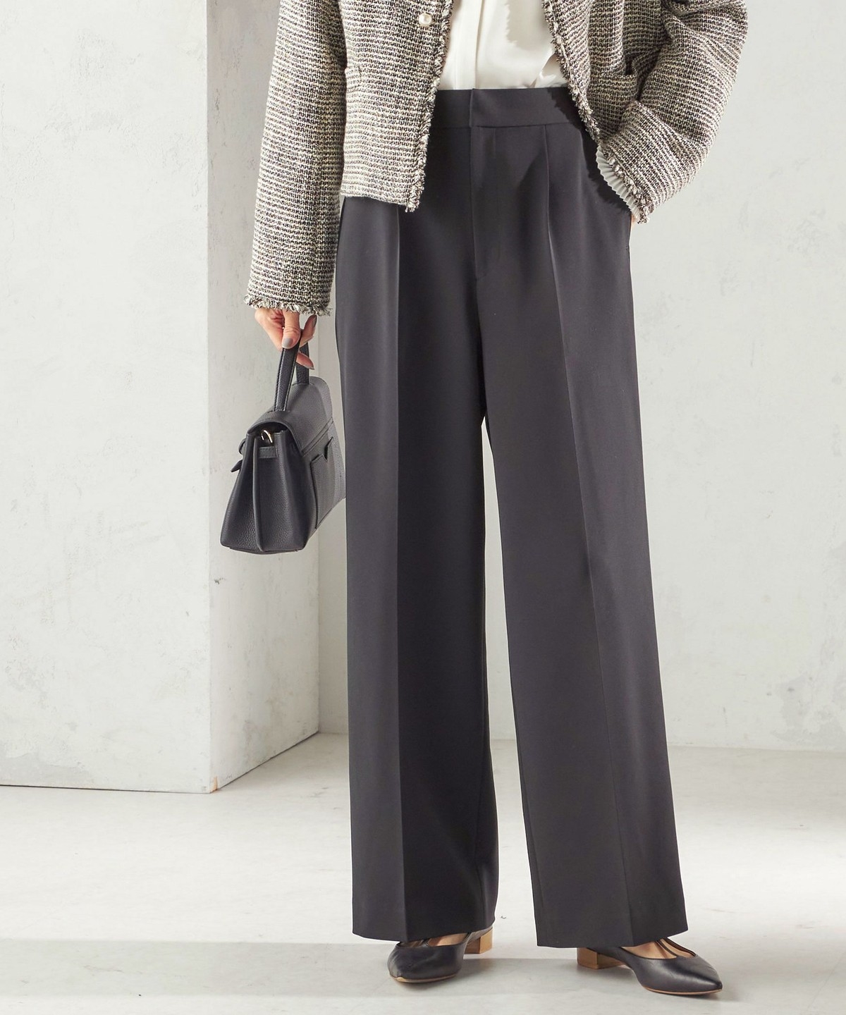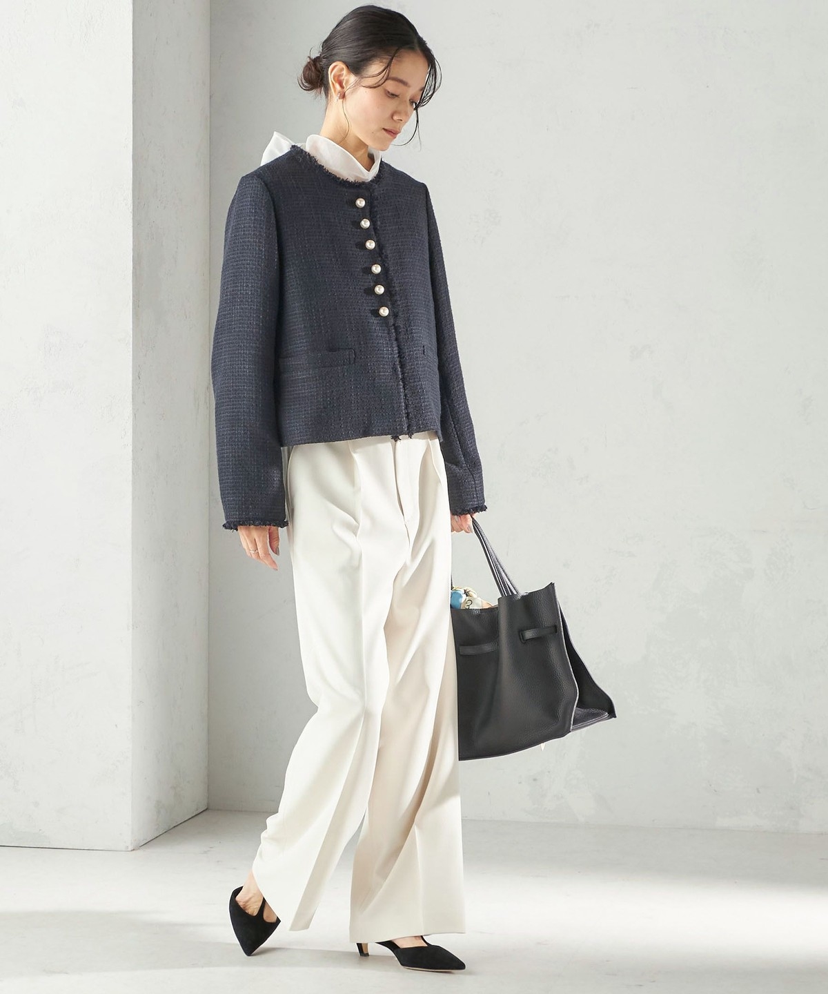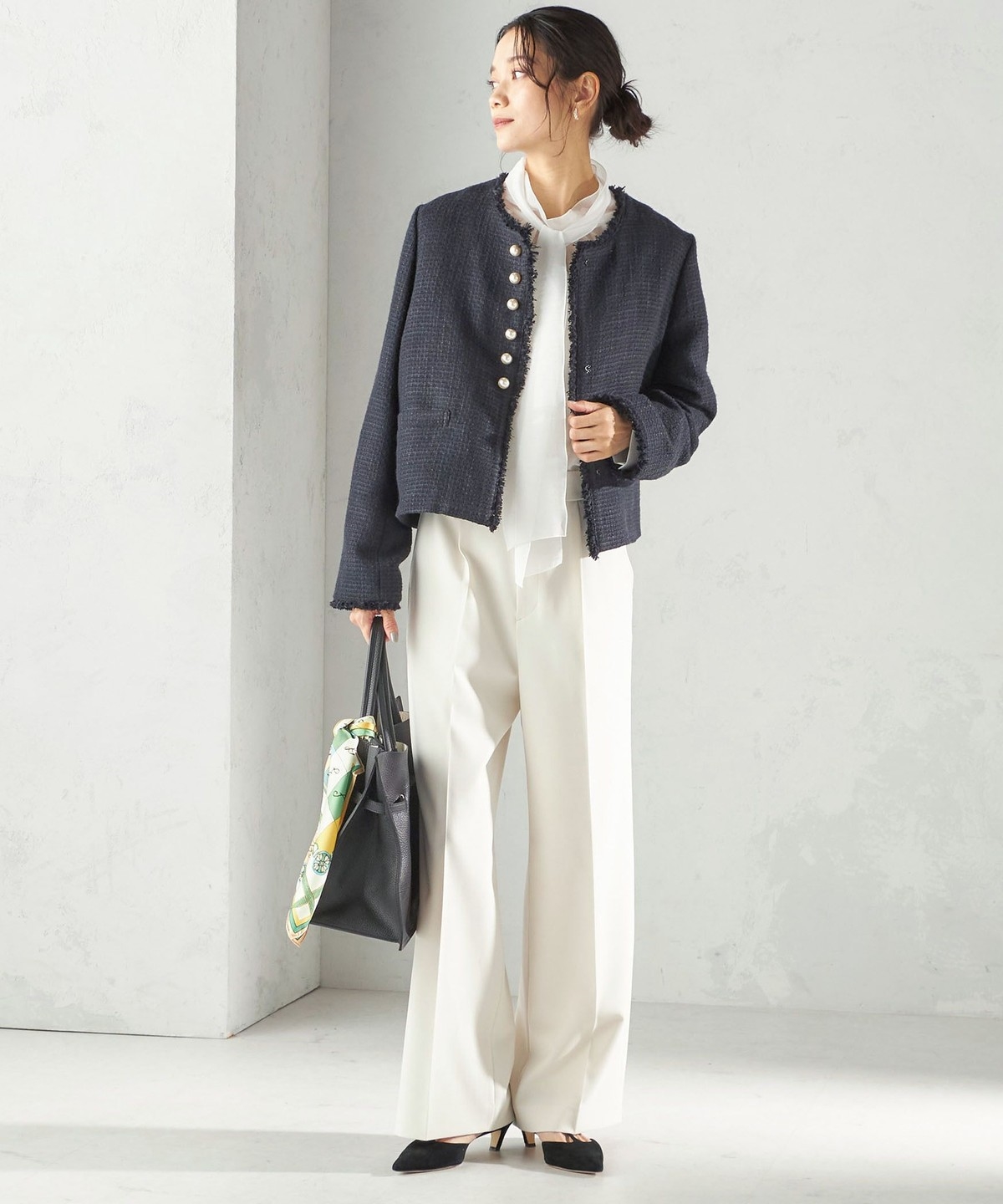 ツイード素材のジレやジャケットとも相性が良い万能なデザインなので、お手持ちのトップスに合わせて幅広くご活用いただけます。