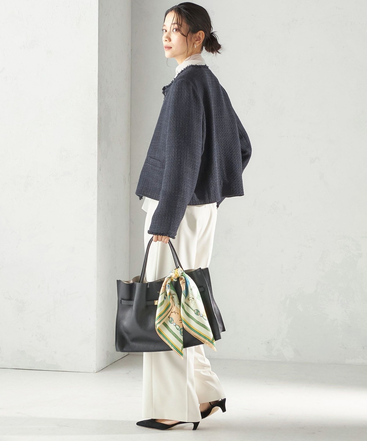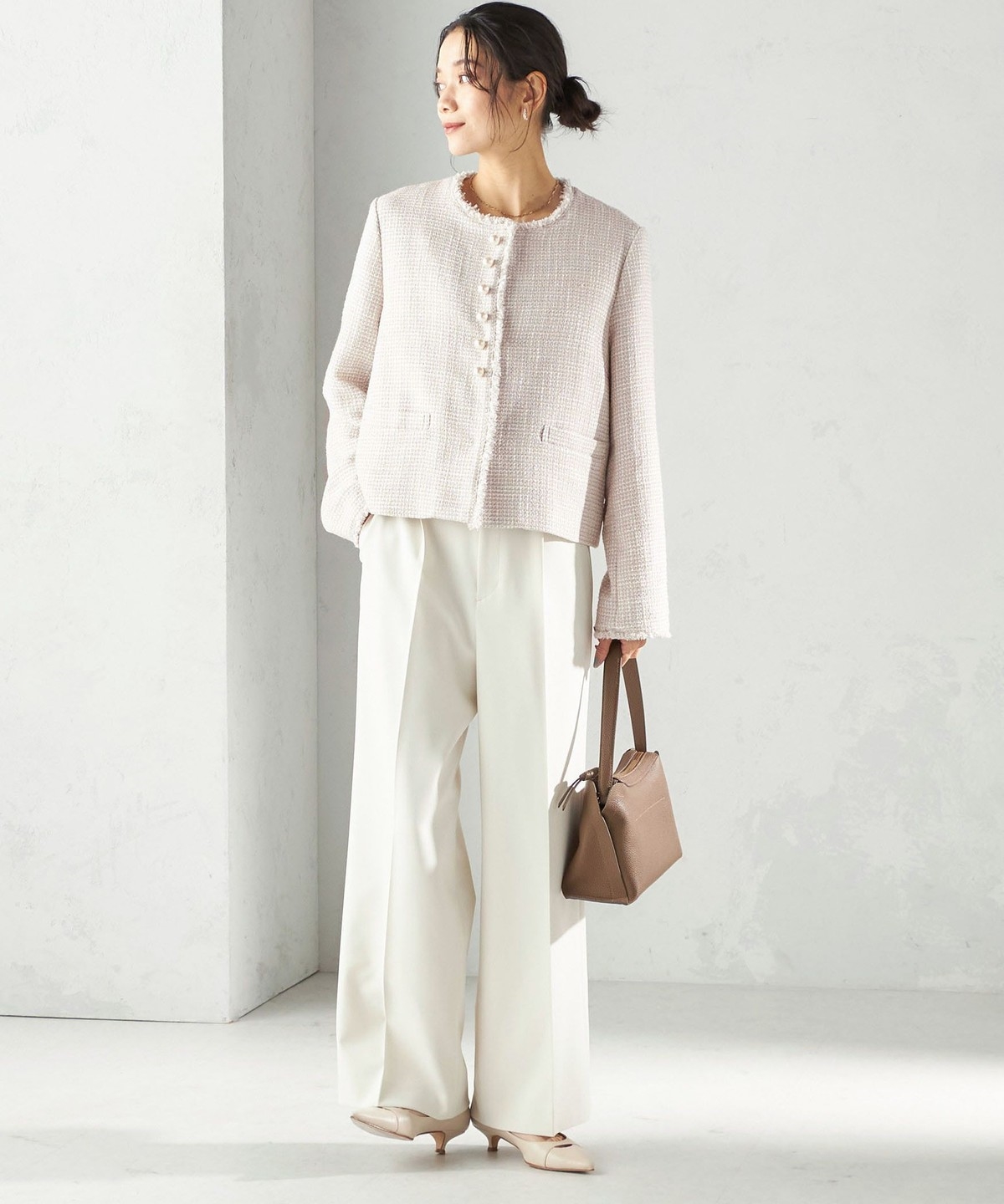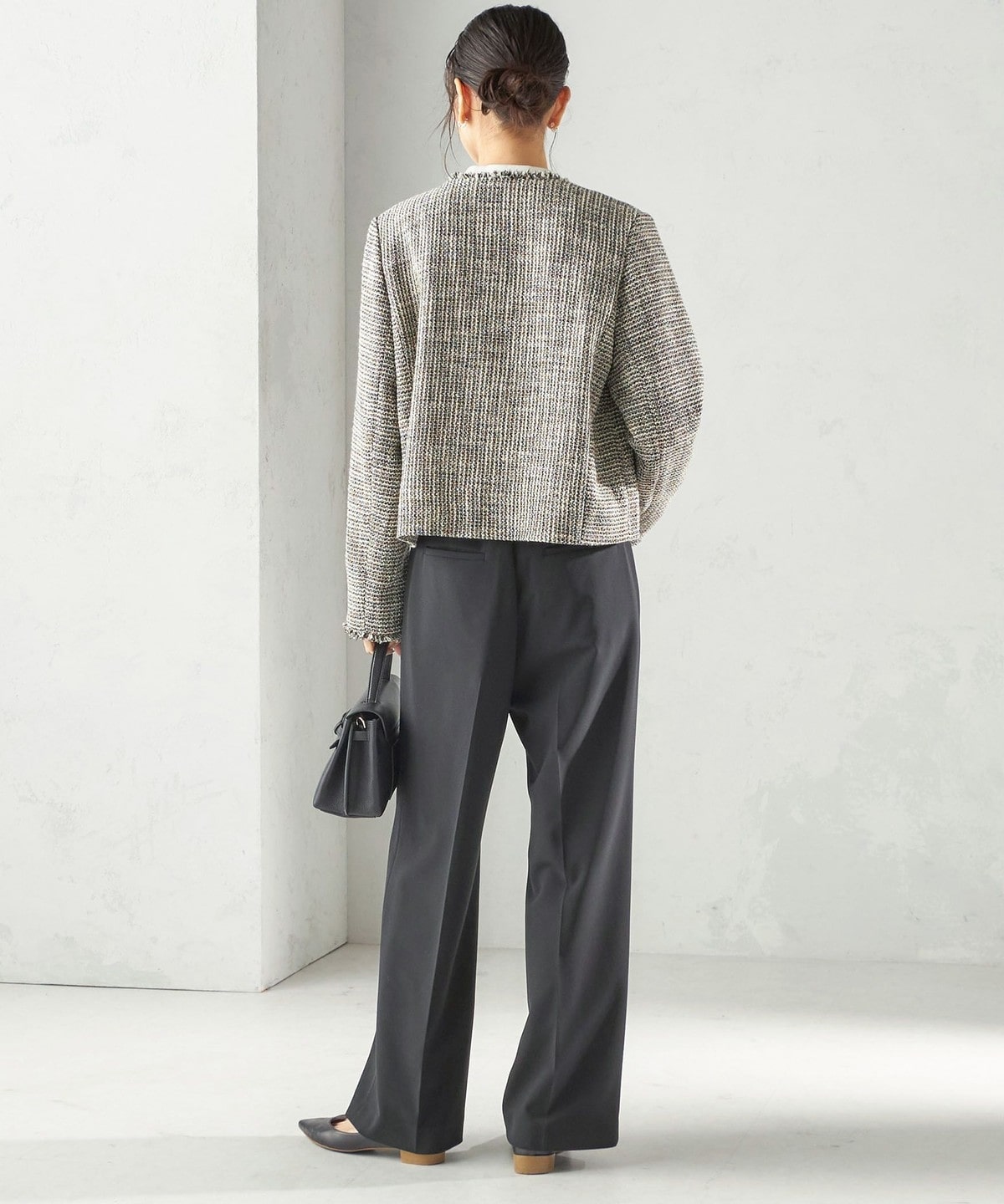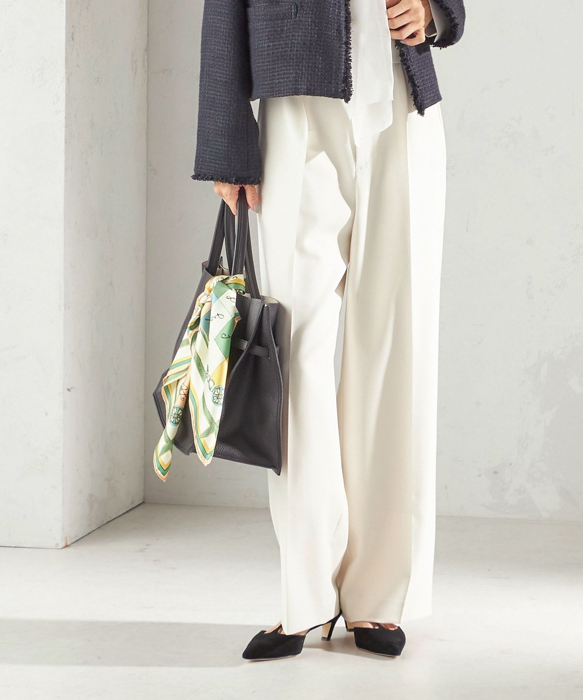 ツイード素材のジレやジャケットとも相性が良い万能なデザインなので、お手持ちのトップスに合わせて幅広くご活用いただけます。