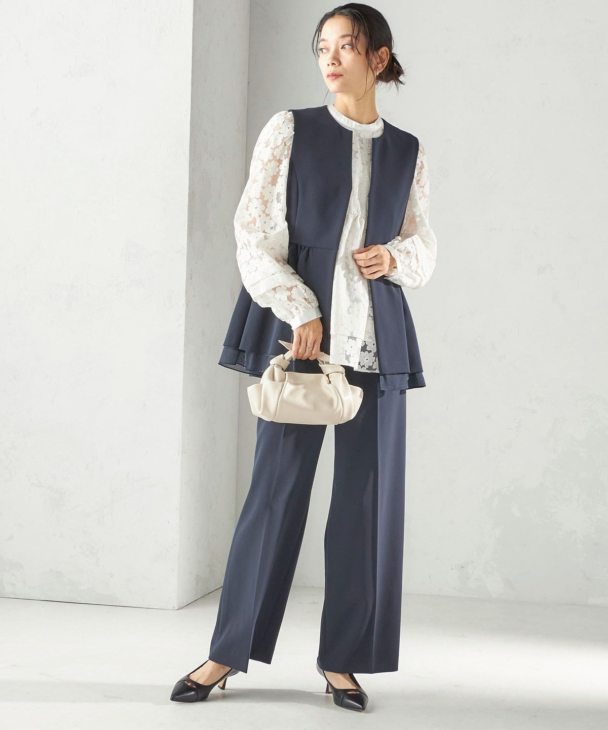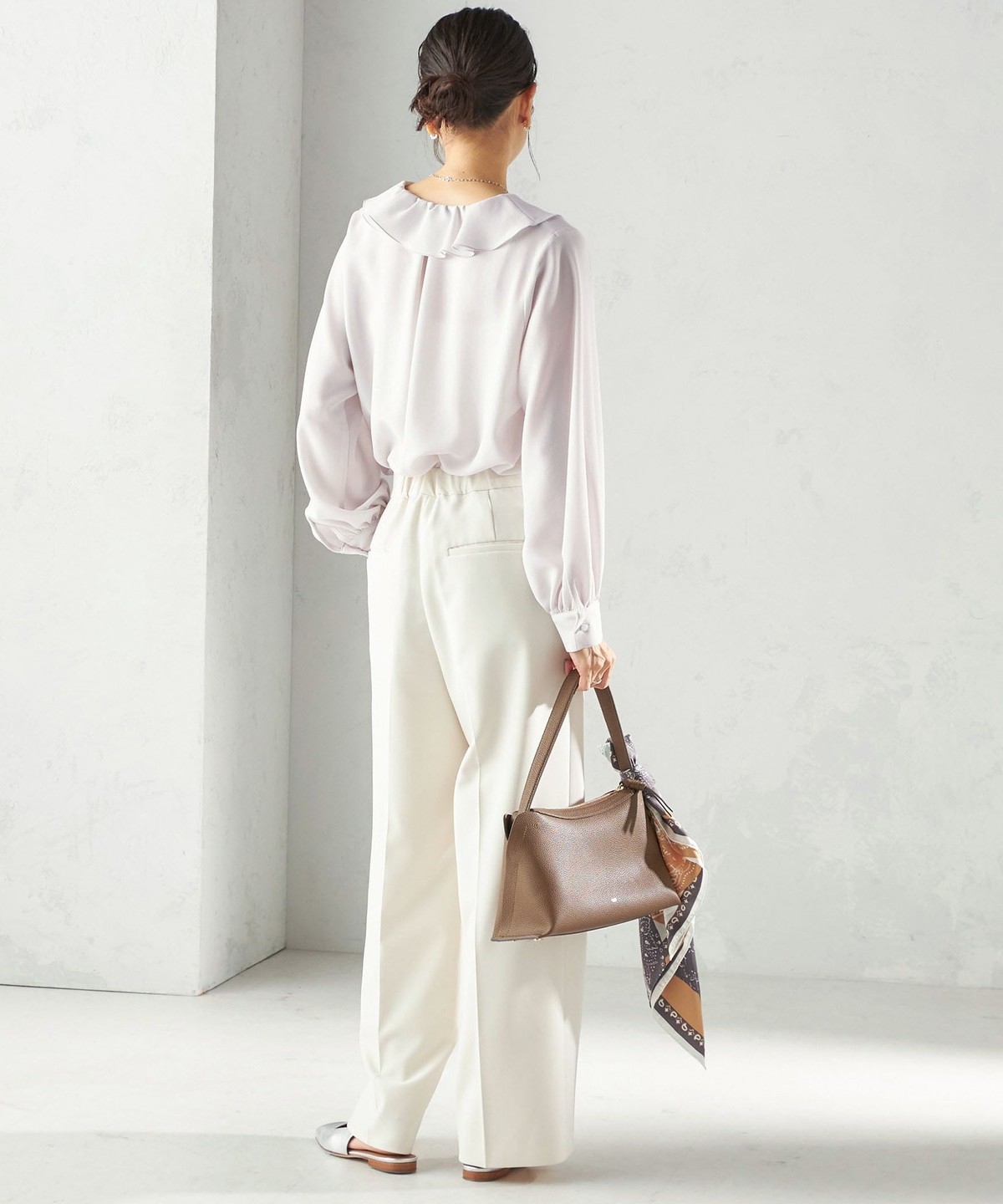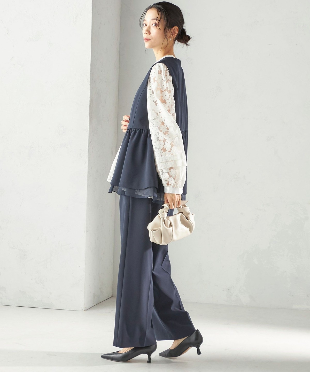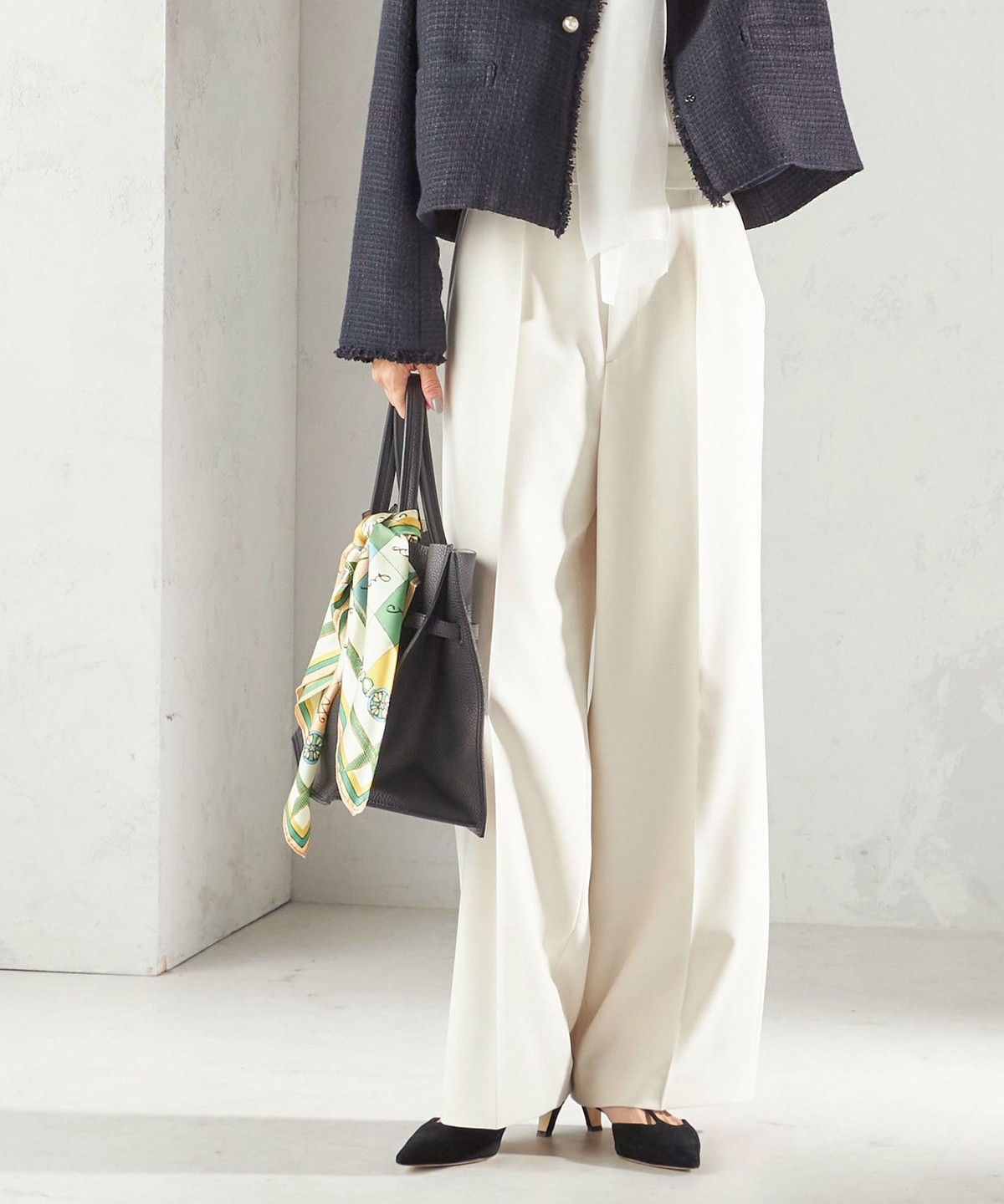 ツイード素材のジレやジャケットとも相性が良い万能なデザインなので、お手持ちのトップスに合わせて幅広くご活用いただけます。