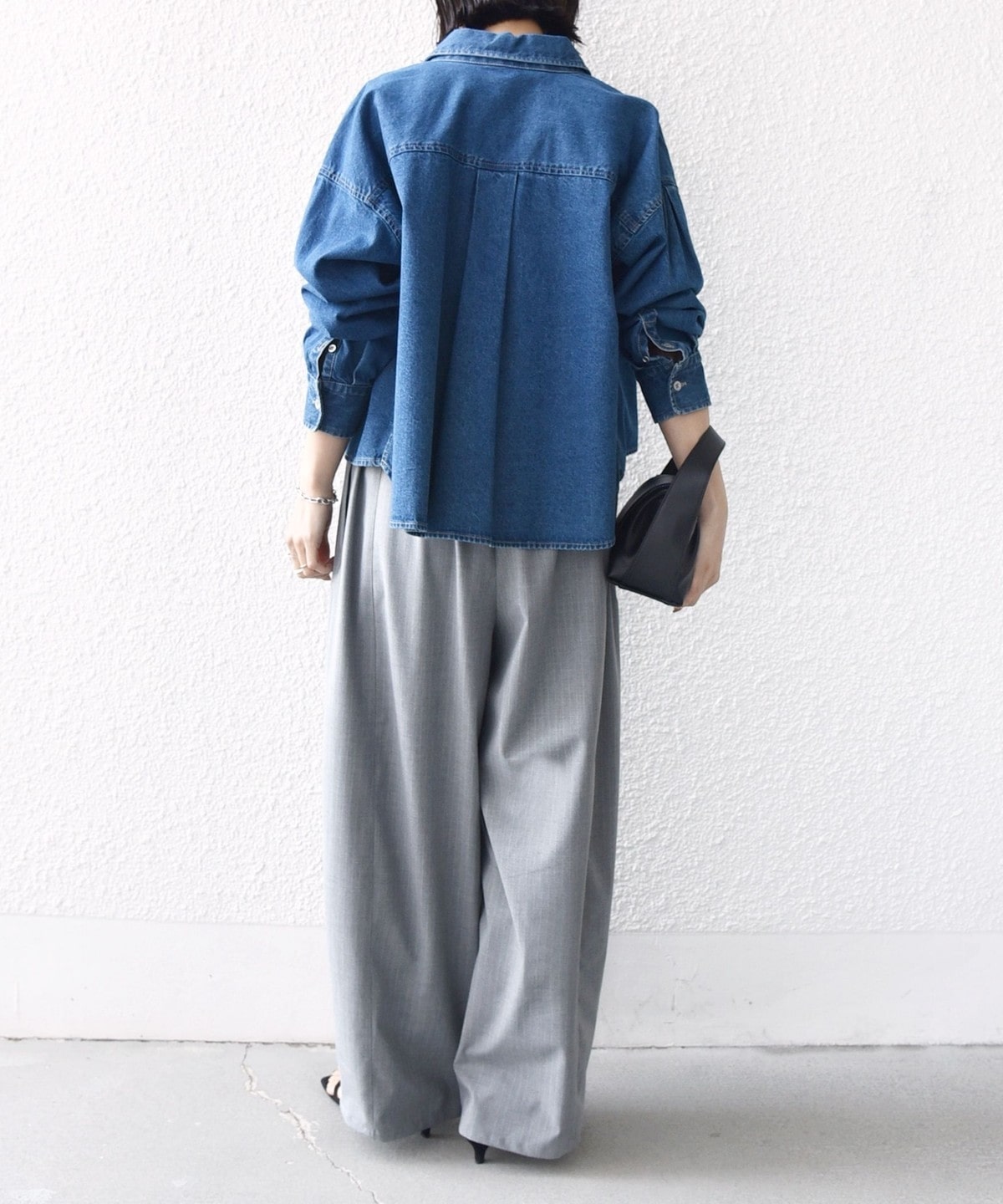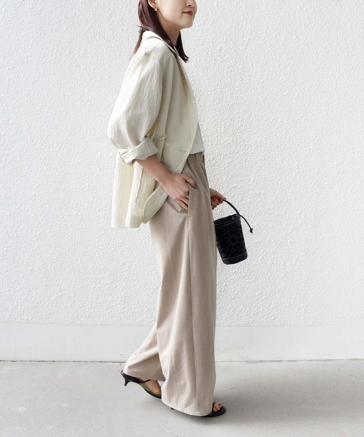 太すぎないカーブシルエットと、落ち感のある素材によってストンときれいに下に落ち、すっきりとした印象に。