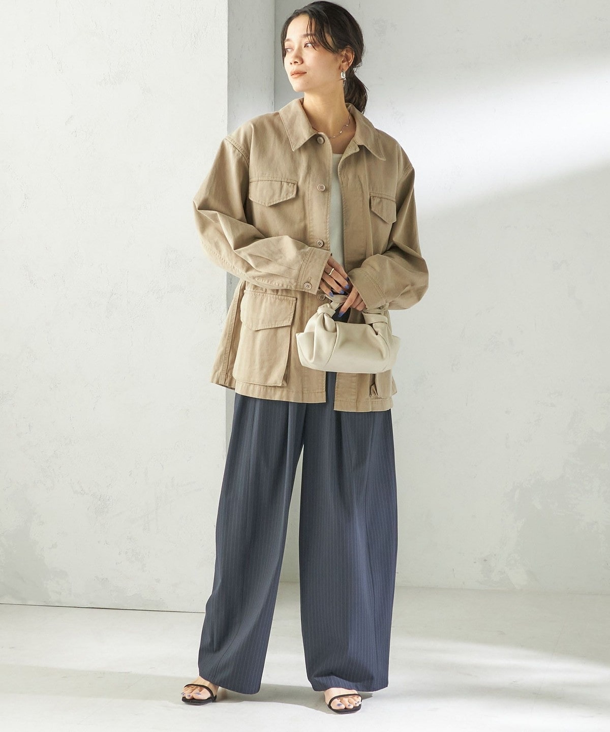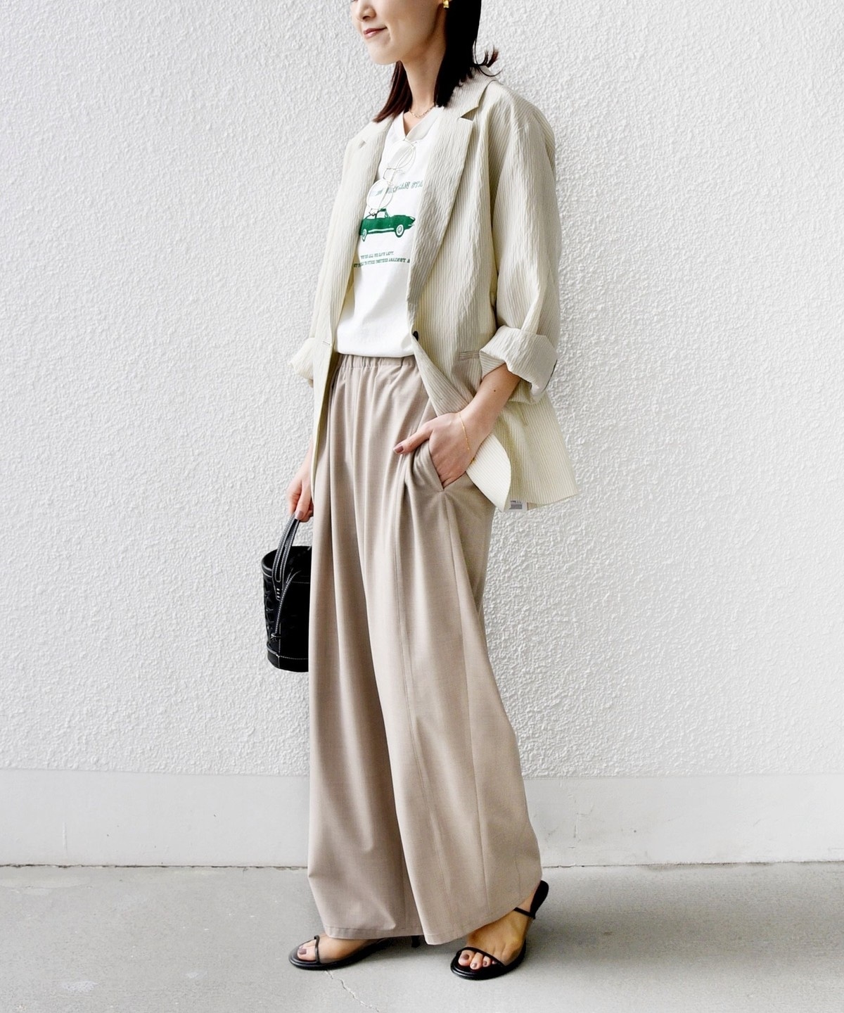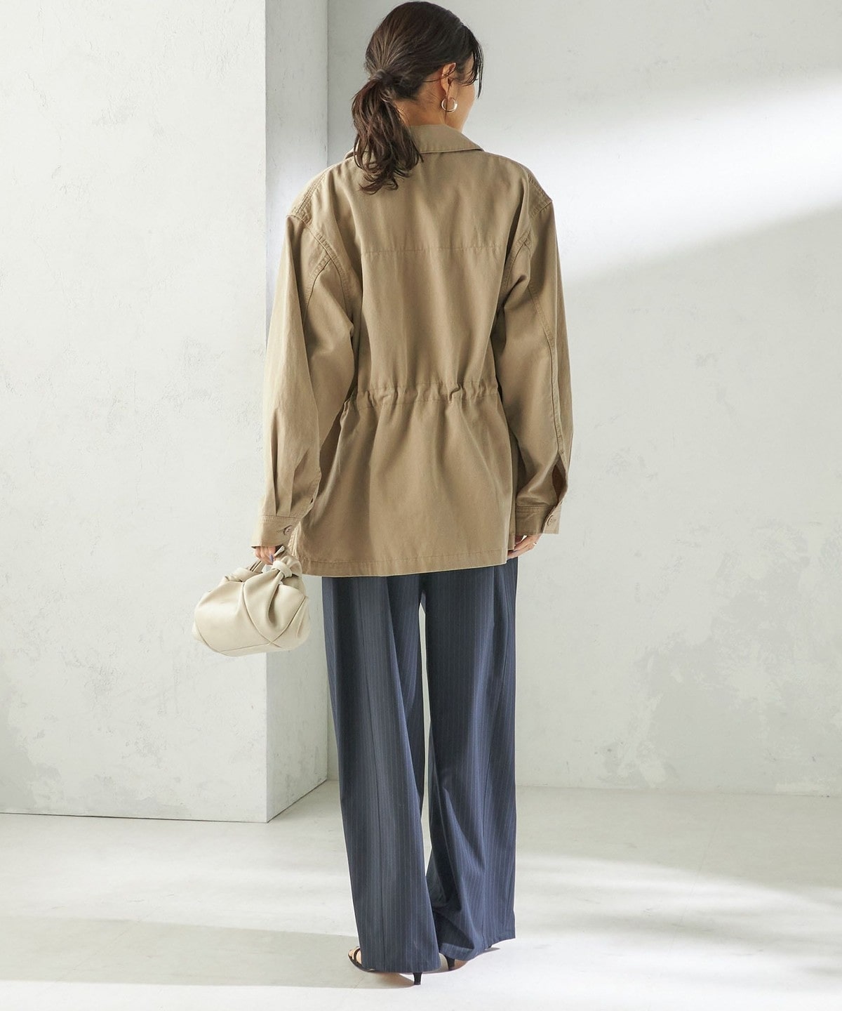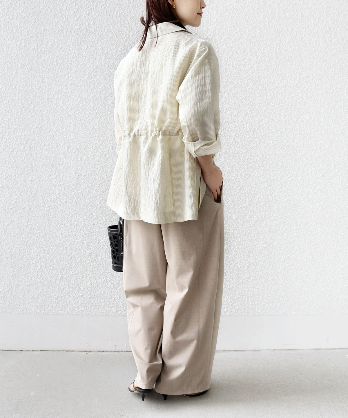 太すぎないカーブシルエットと、落ち感のある素材によってストンときれいに下に落ち、すっきりとした印象に。