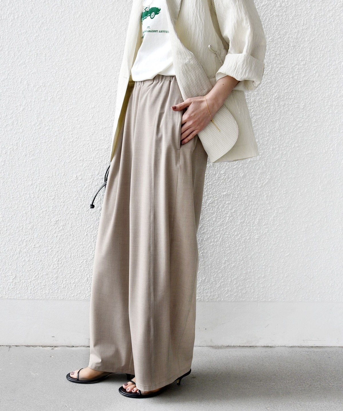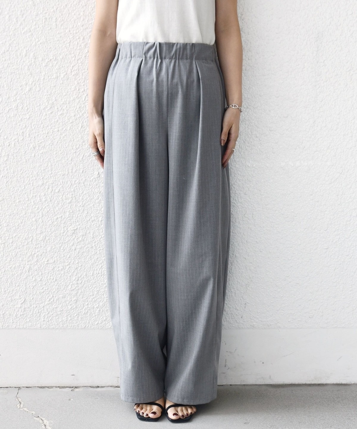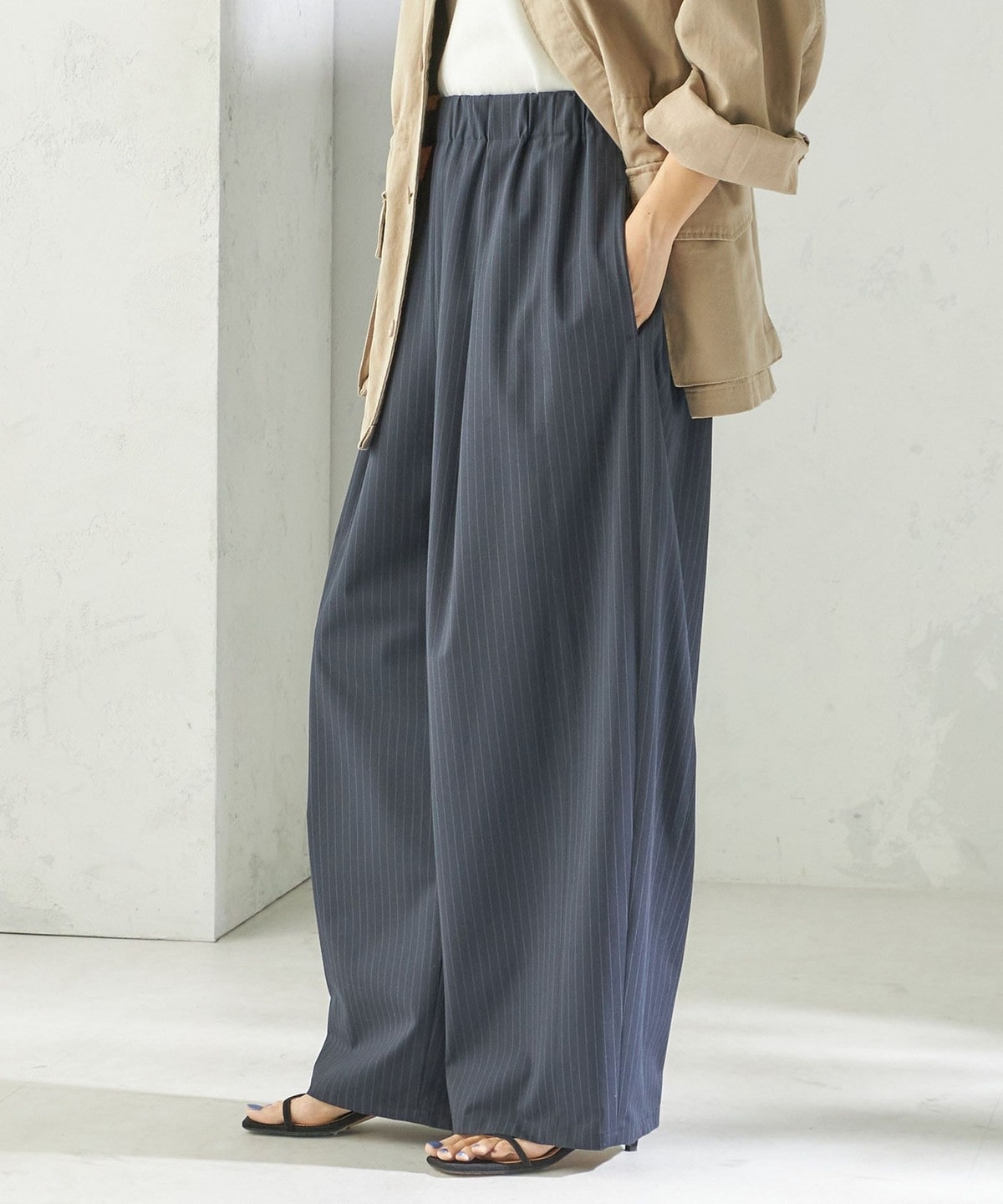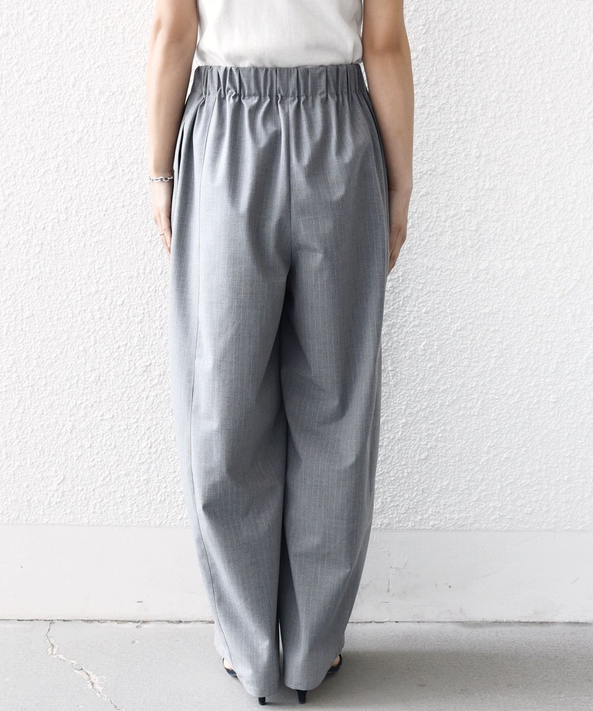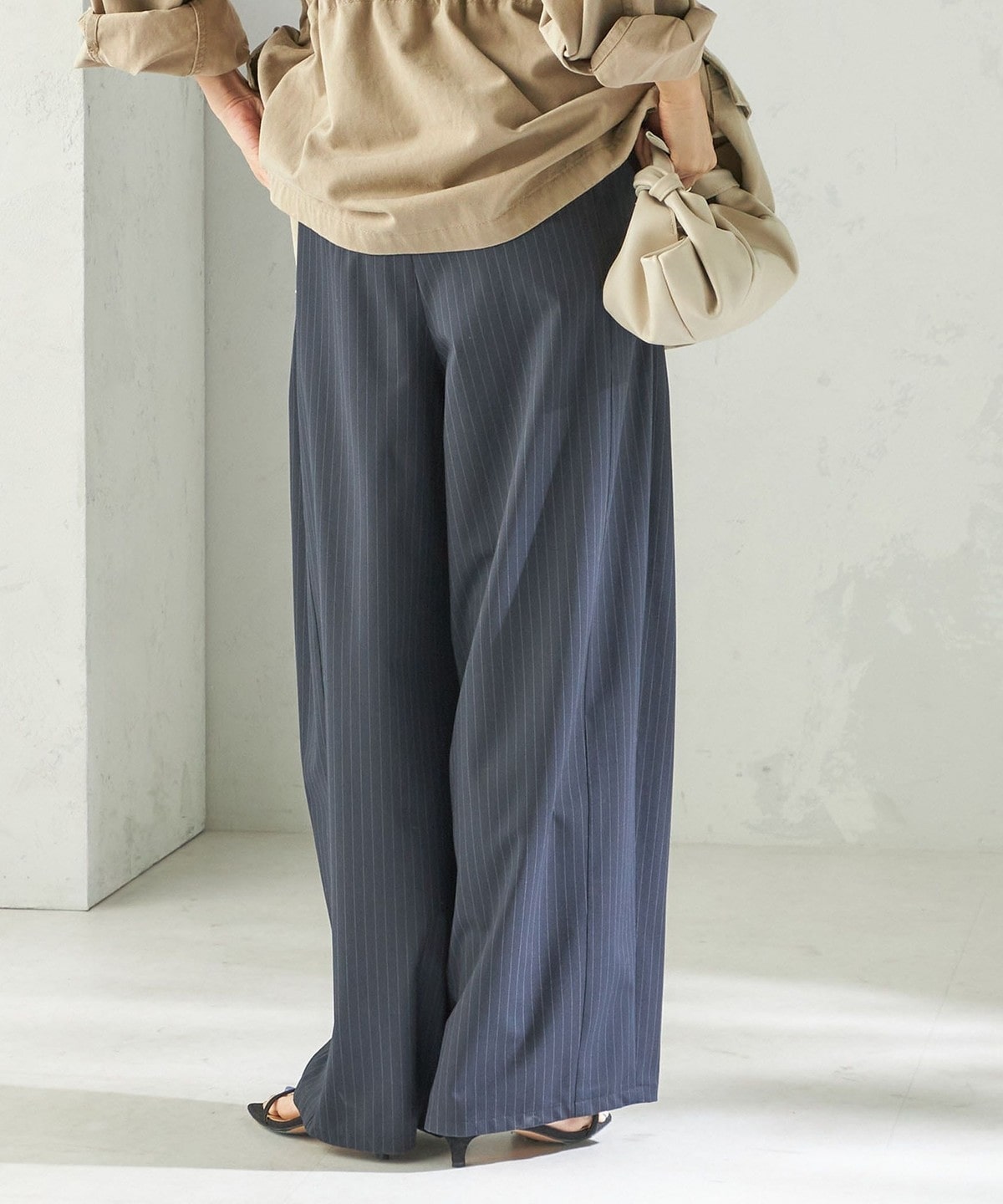 《一部追加予約》〈手洗い可能〉トロ ピン ストライプ ウエスト ギャザー パンツ