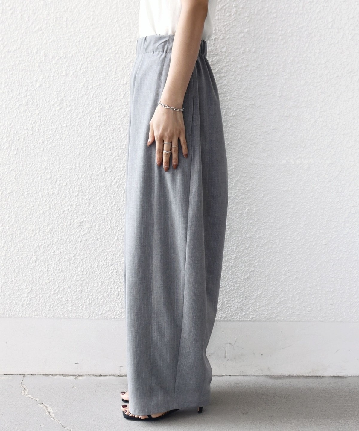 細かなピンストライプが程よいアクセントになり、シンプルなトップス合わせでも上品に決まる一本です。
