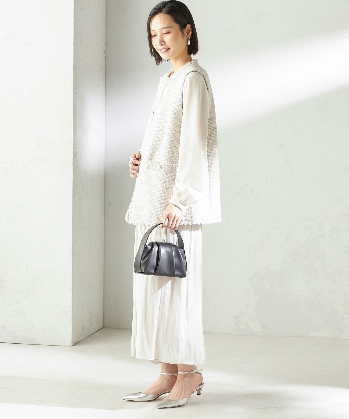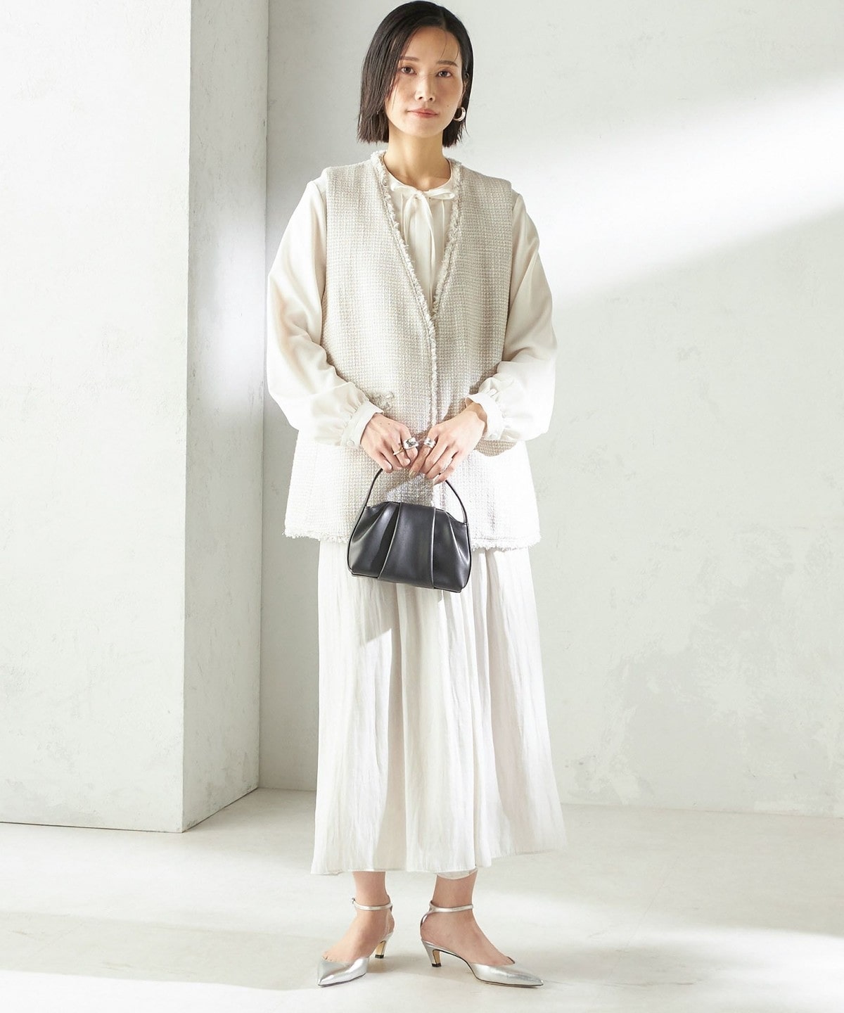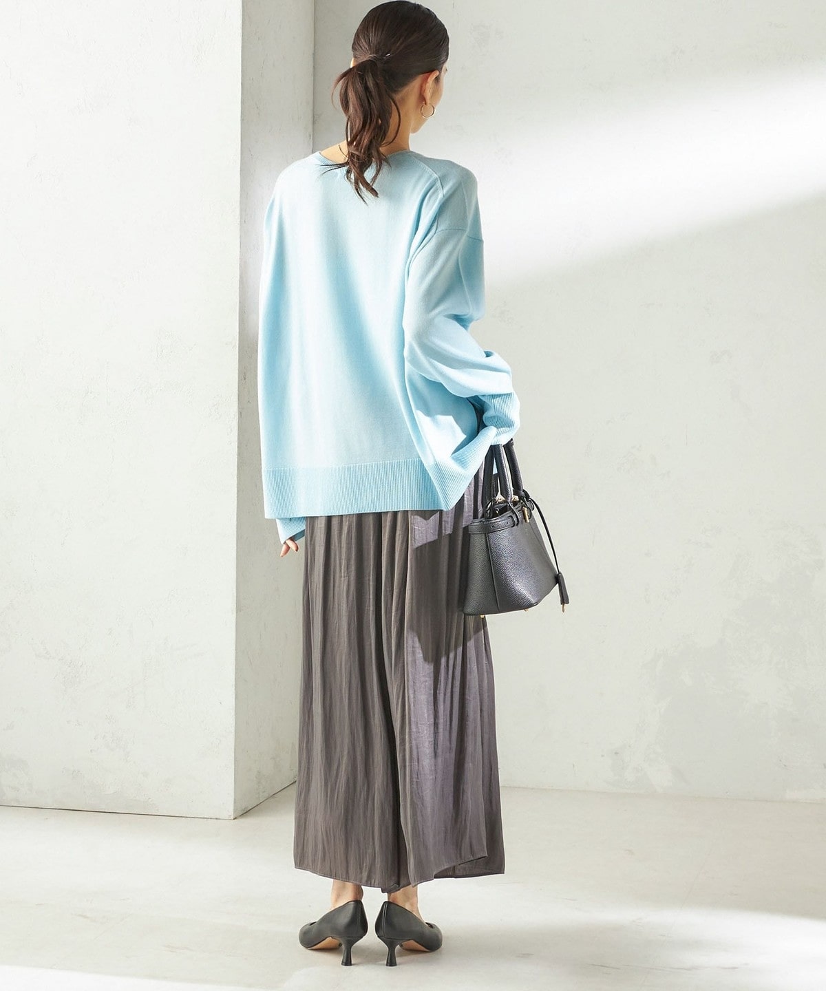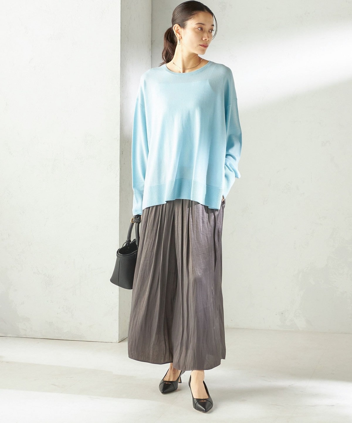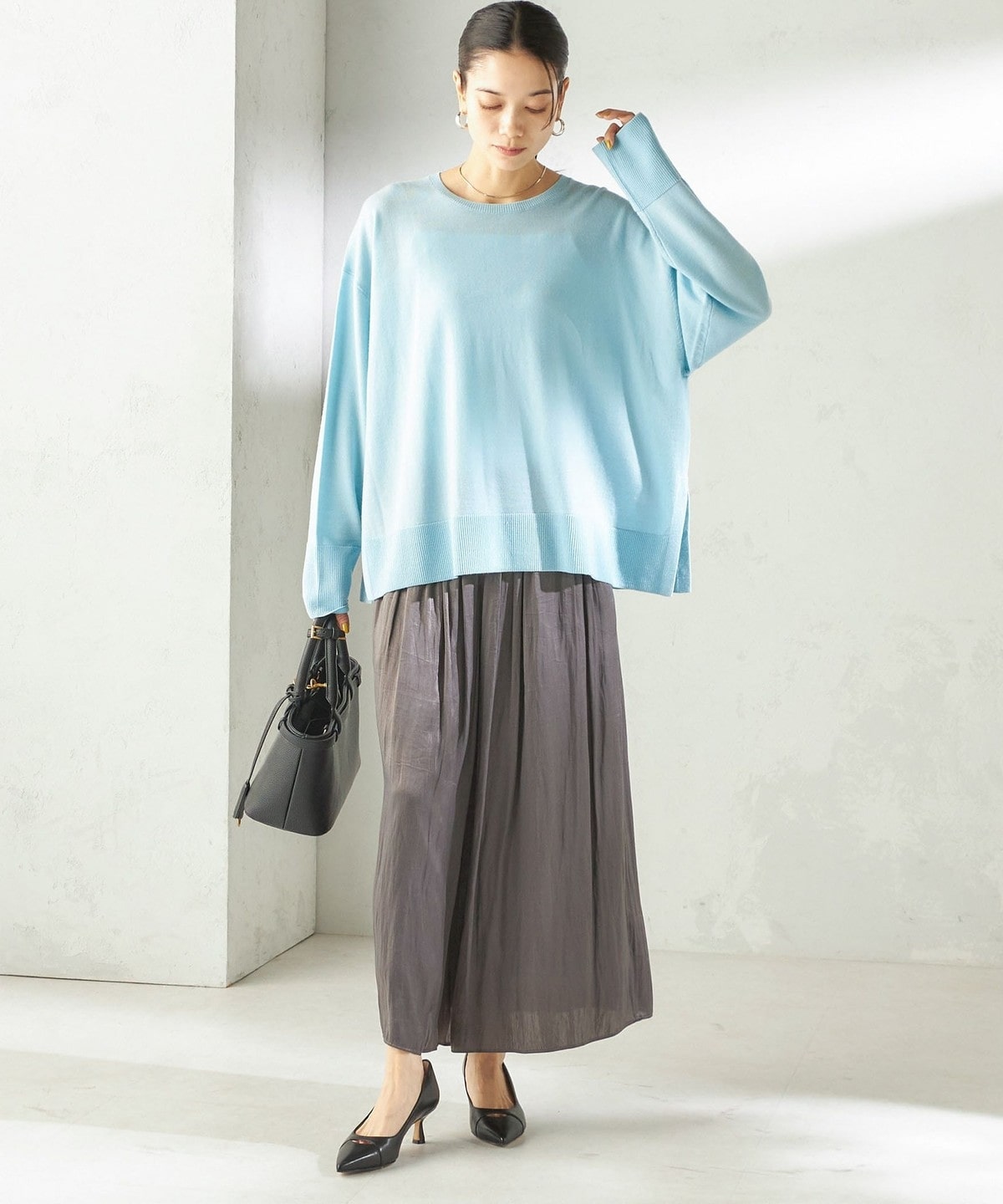 コンパクトなトップスとあわせて、ふんわりとしたシルエットを主役にした着こなしがおすすめです。