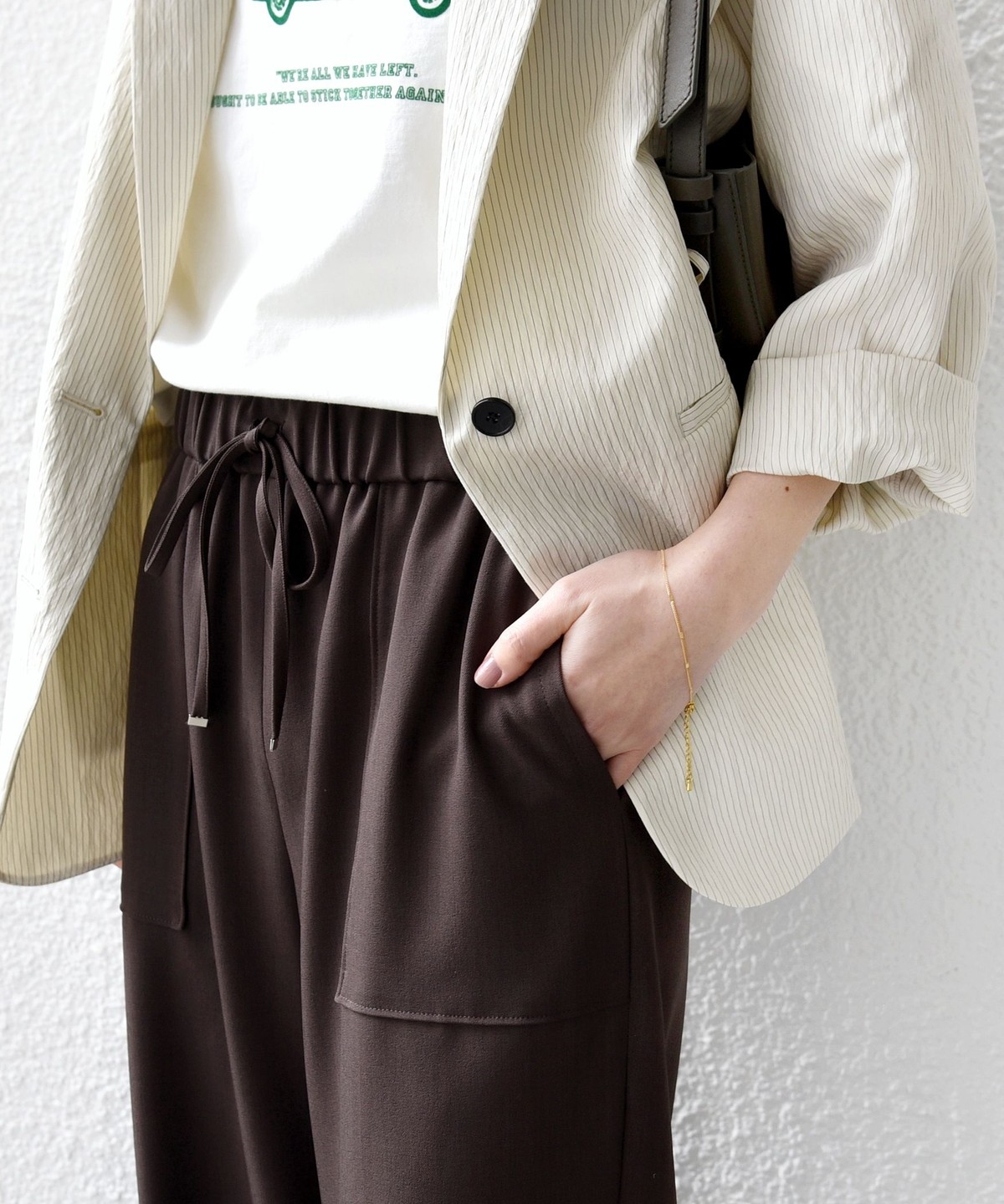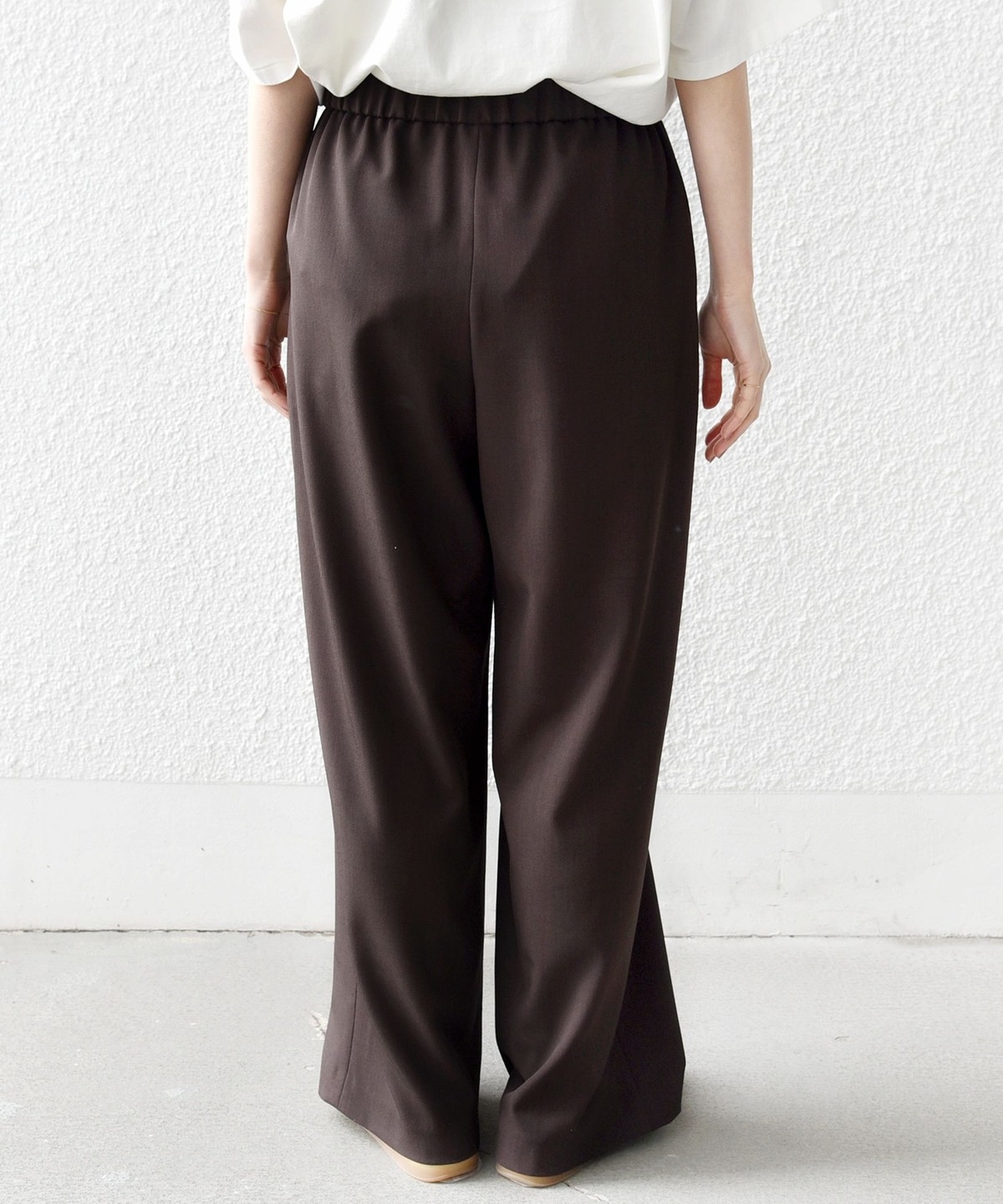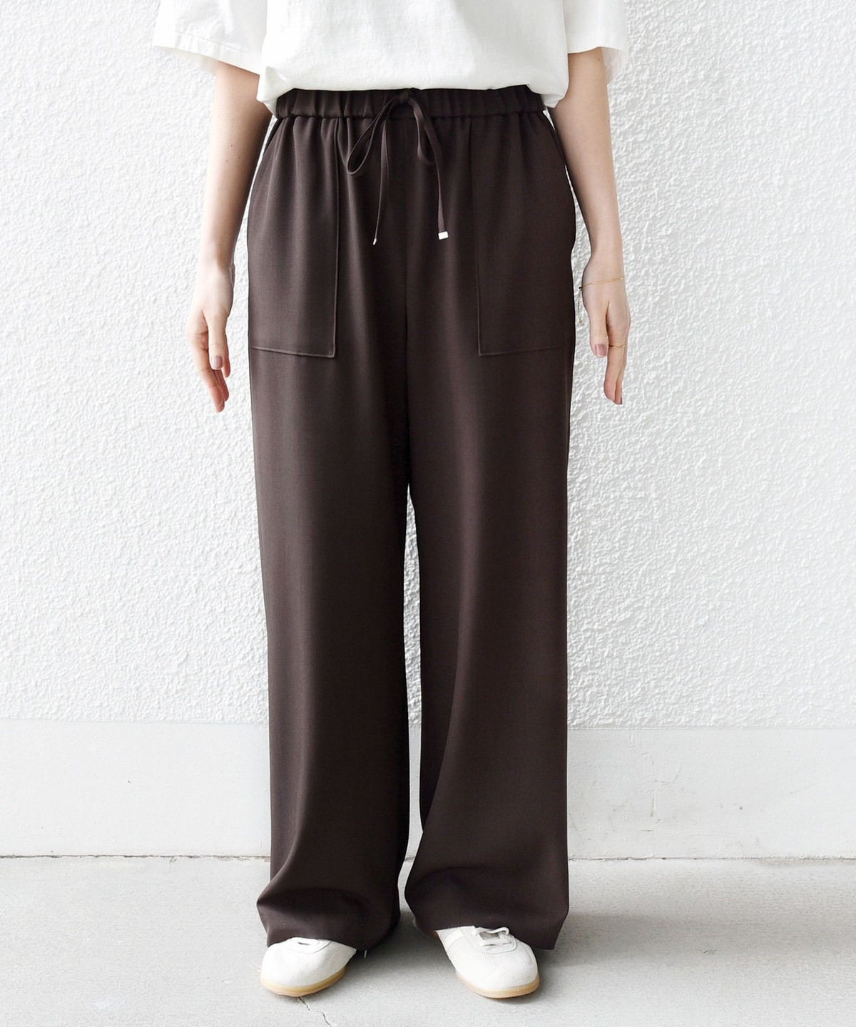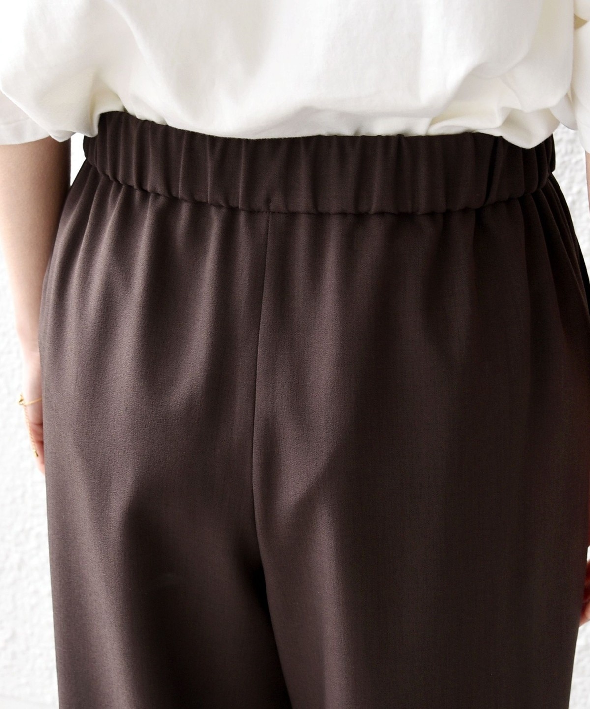ウエストをドロスト仕様にしたリラックス感と女性らしい柔らかさを添えるベイカードロストパンツ。