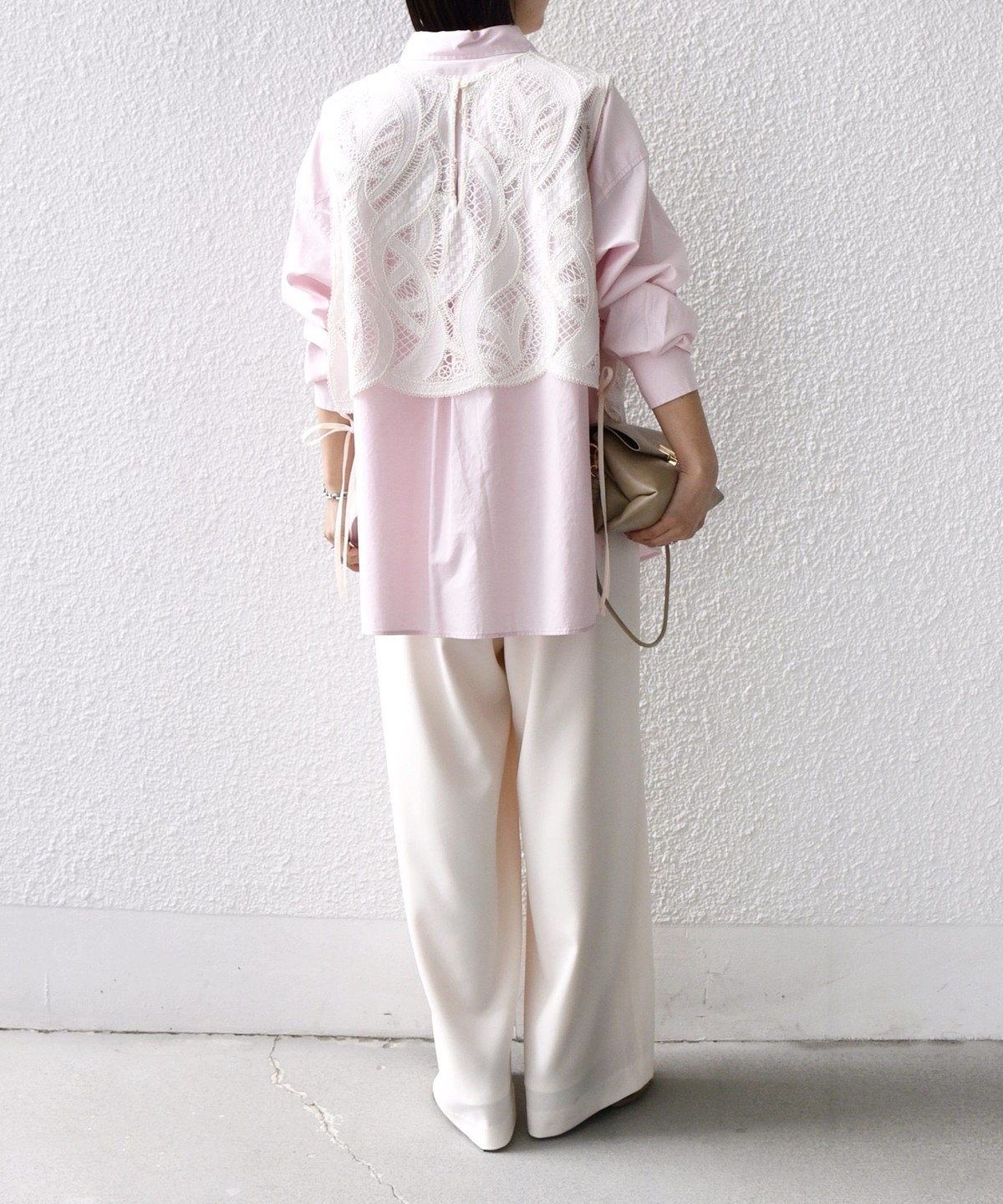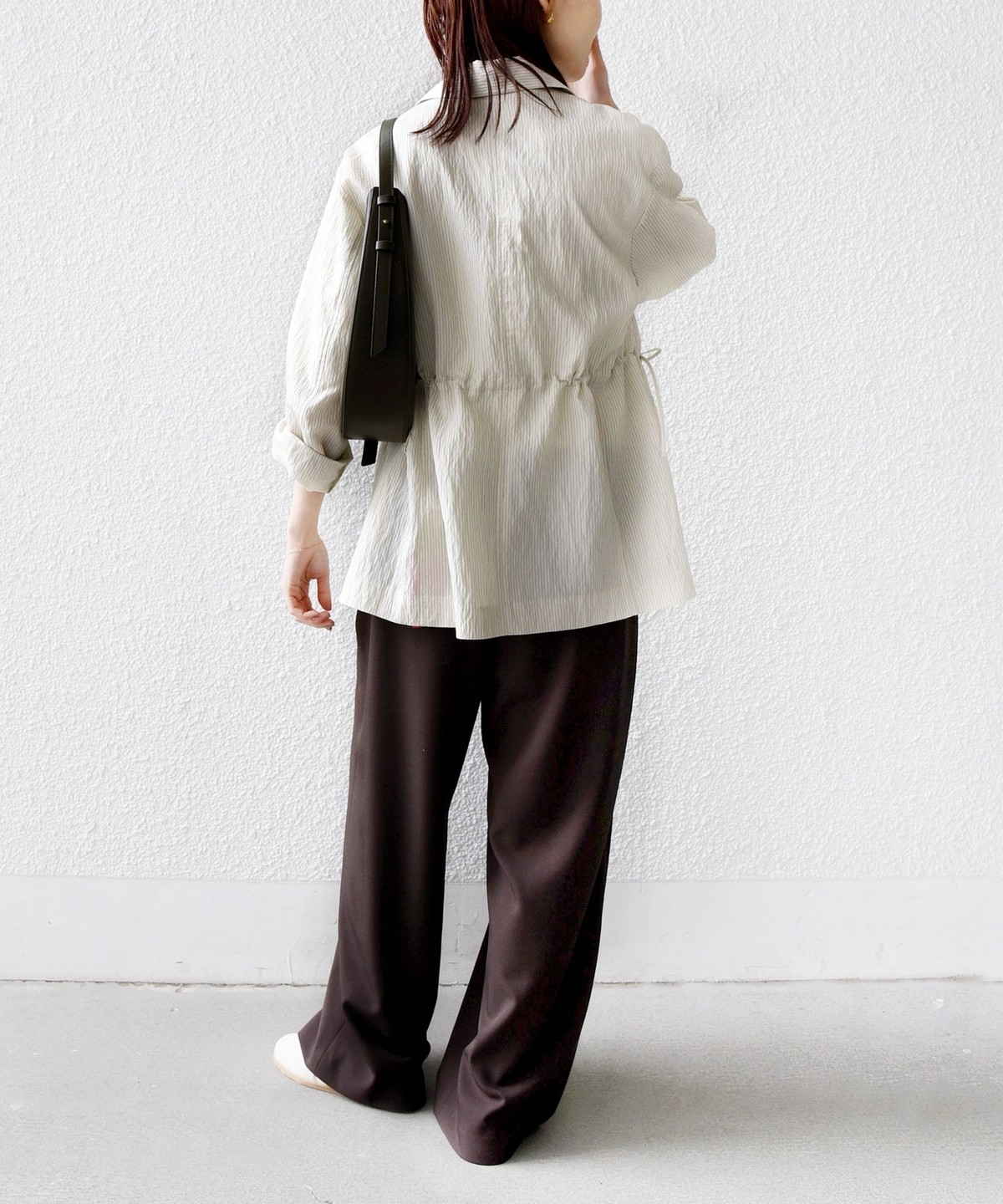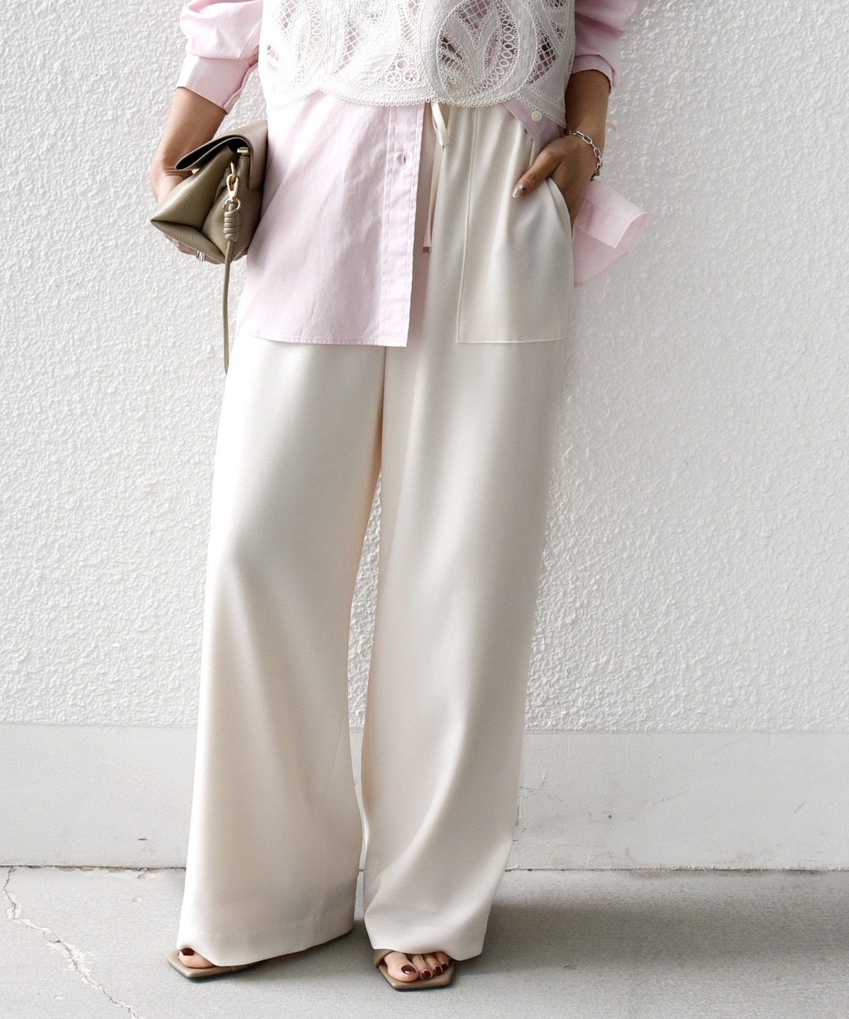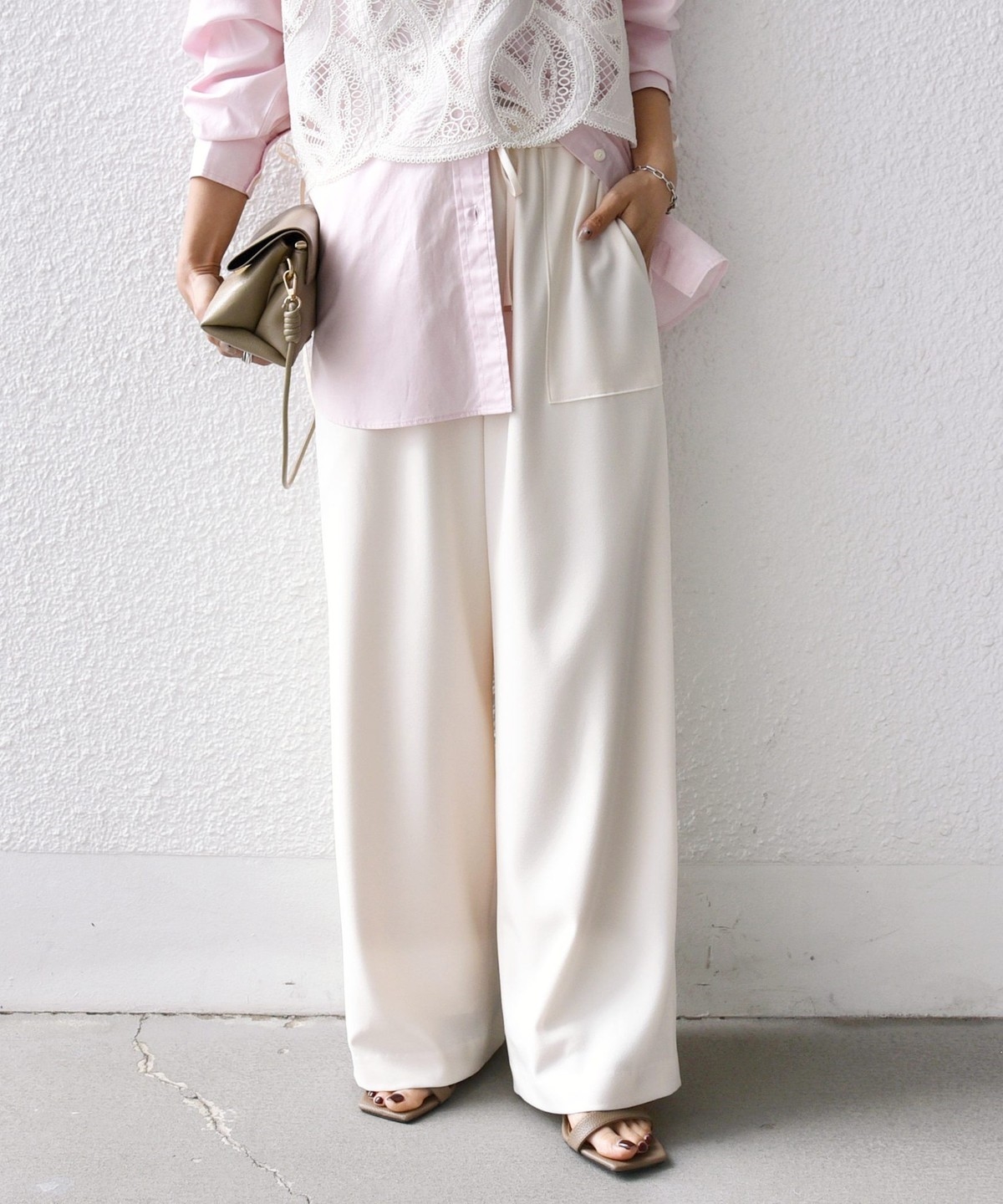 ウエストをドロスト仕様にしたリラックス感と女性らしい柔らかさを添えるベイカードロストパンツ。