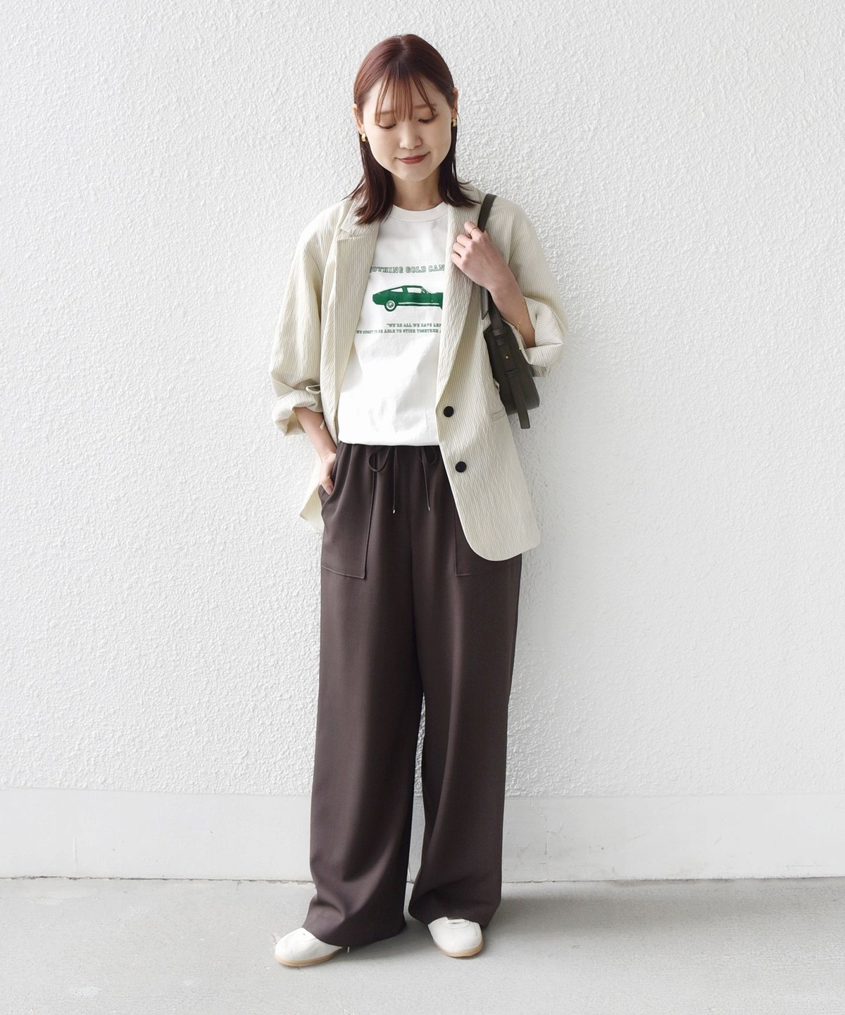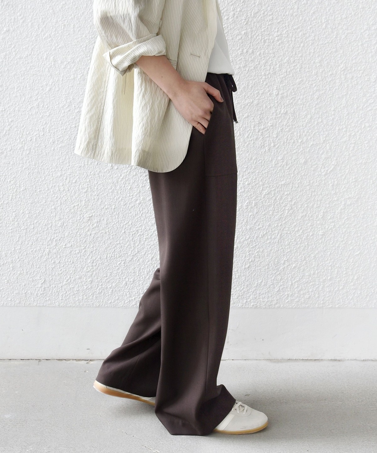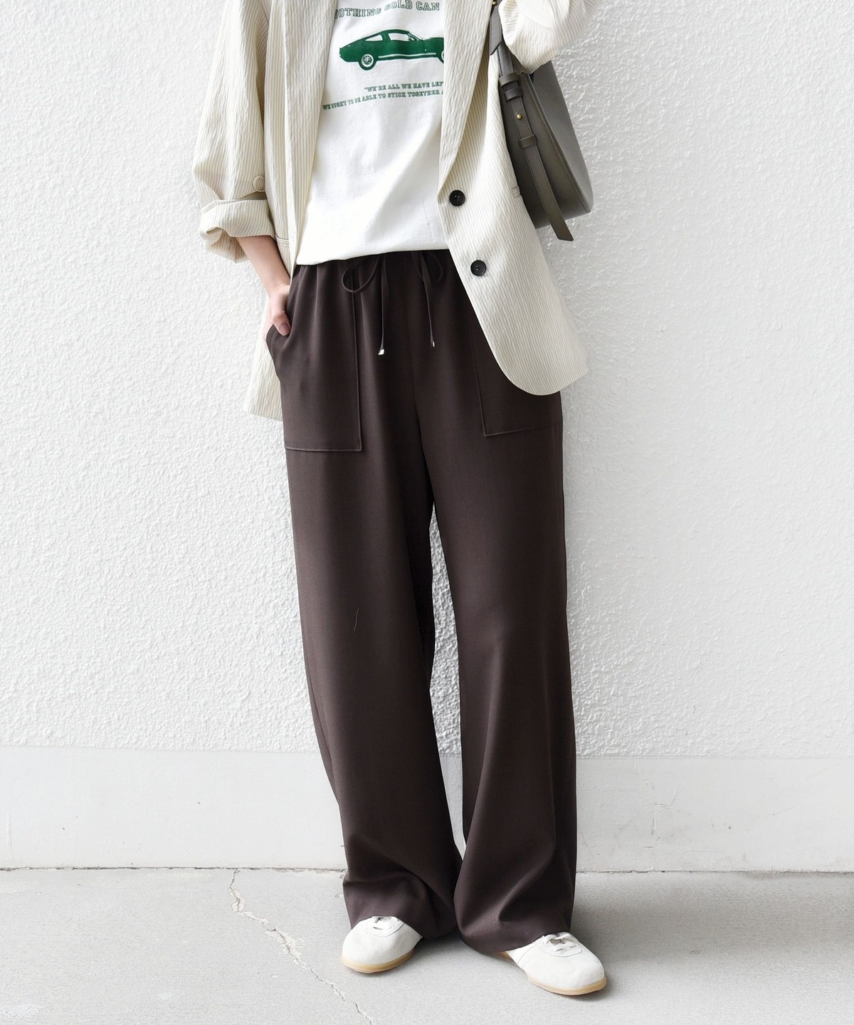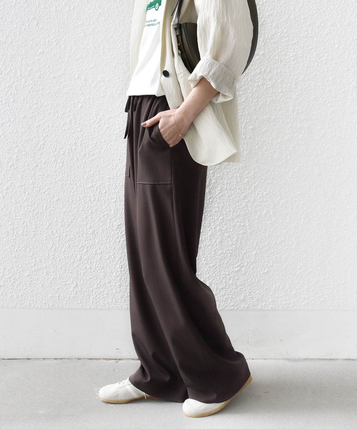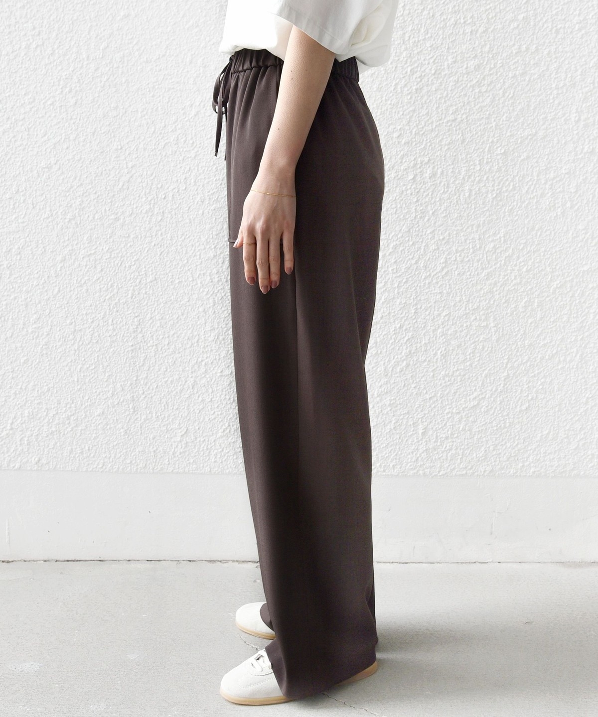 パンツに落ち感がある素材の為、トップスにニットやカットソーなど合わせるとコーディネートに素材の対比がでておしゃれ見えします。
