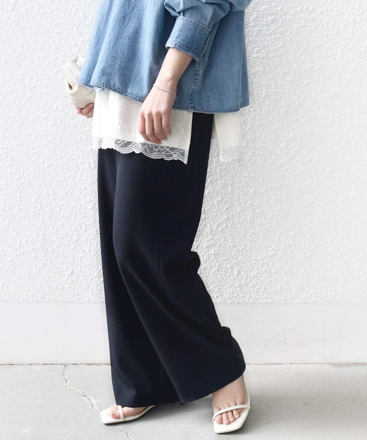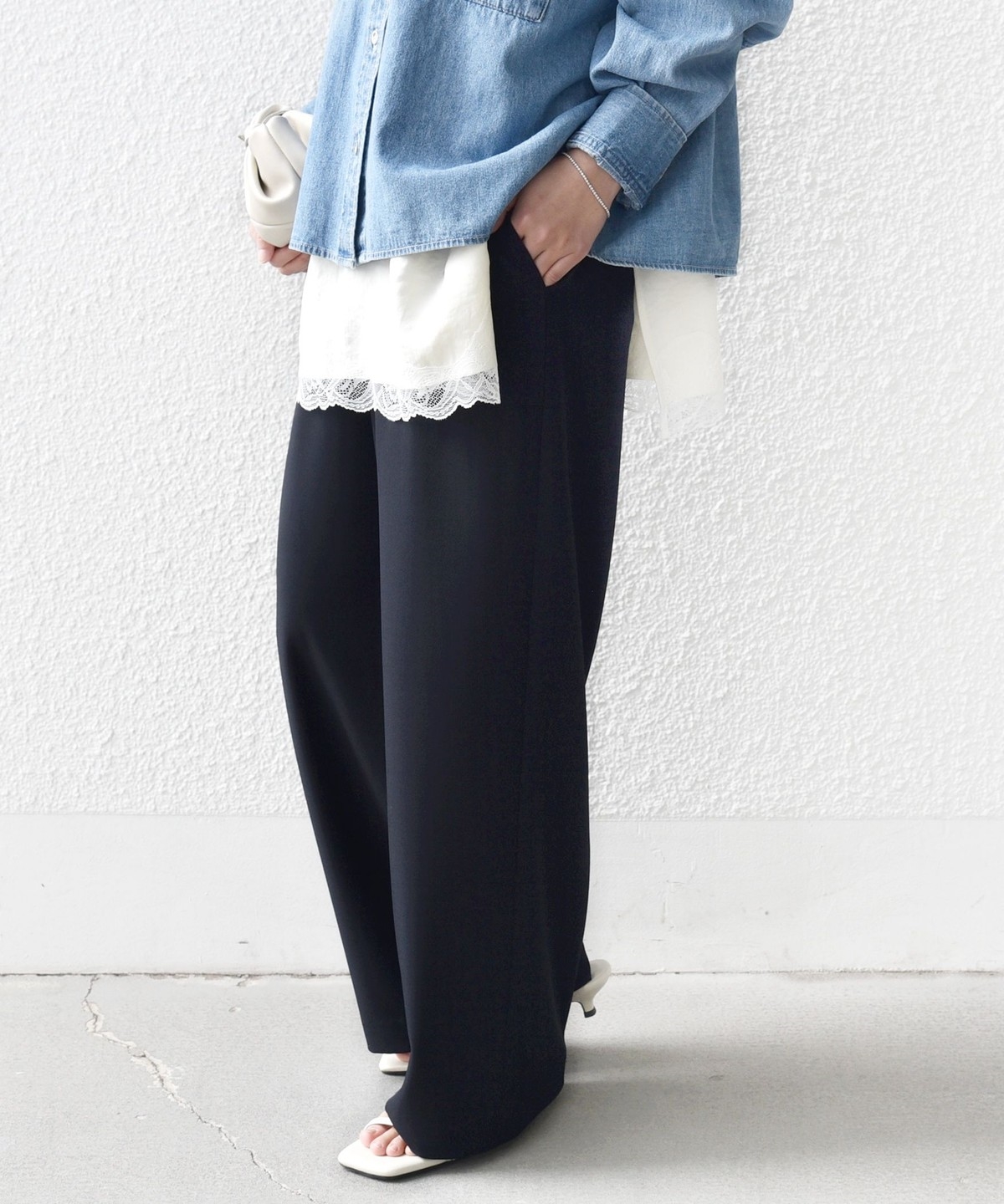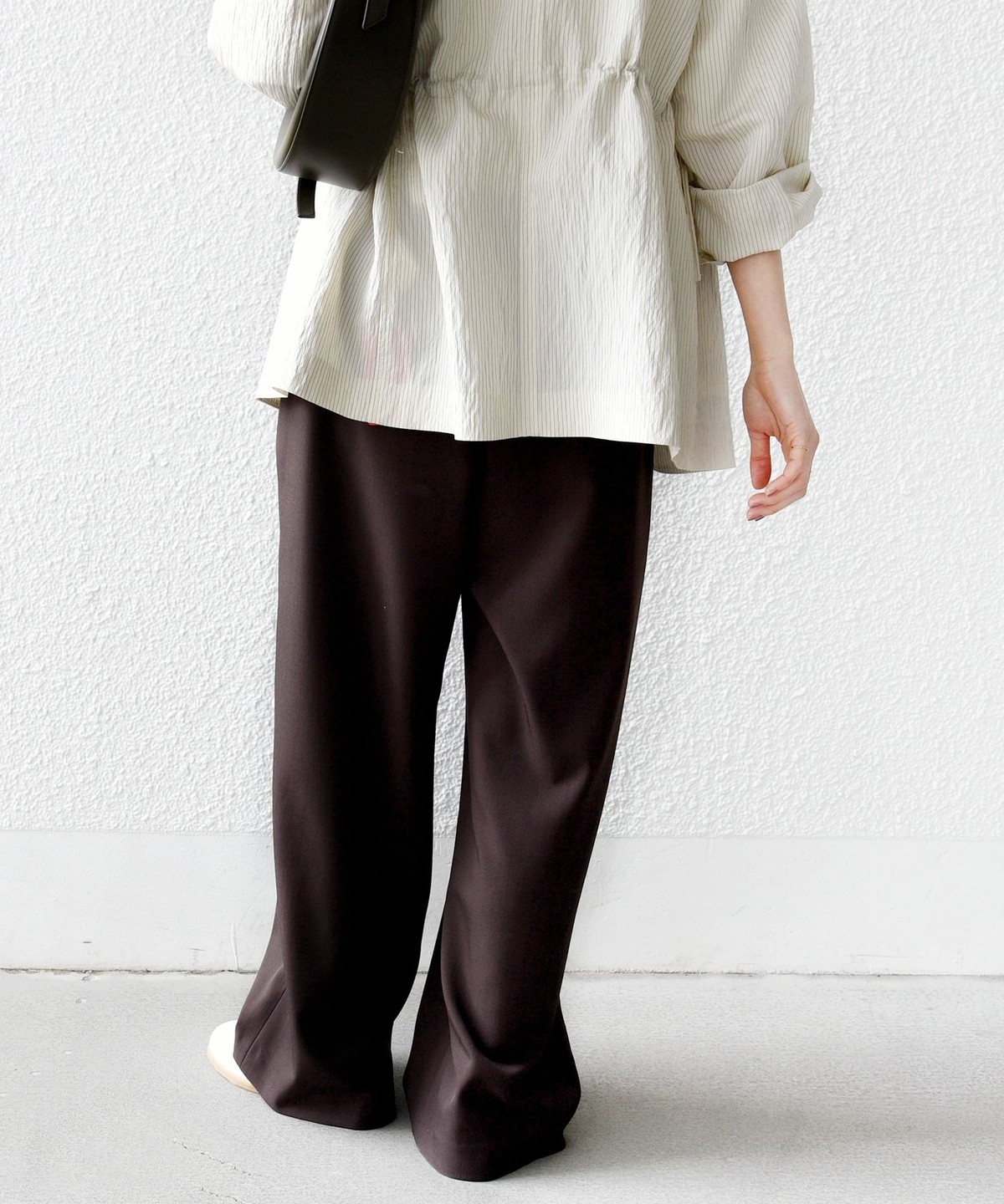 シンプルなドレープがきれいにでるパンツなので、きれいめなコーディネートに取り入れると大人のリラックス感を演出することができます。