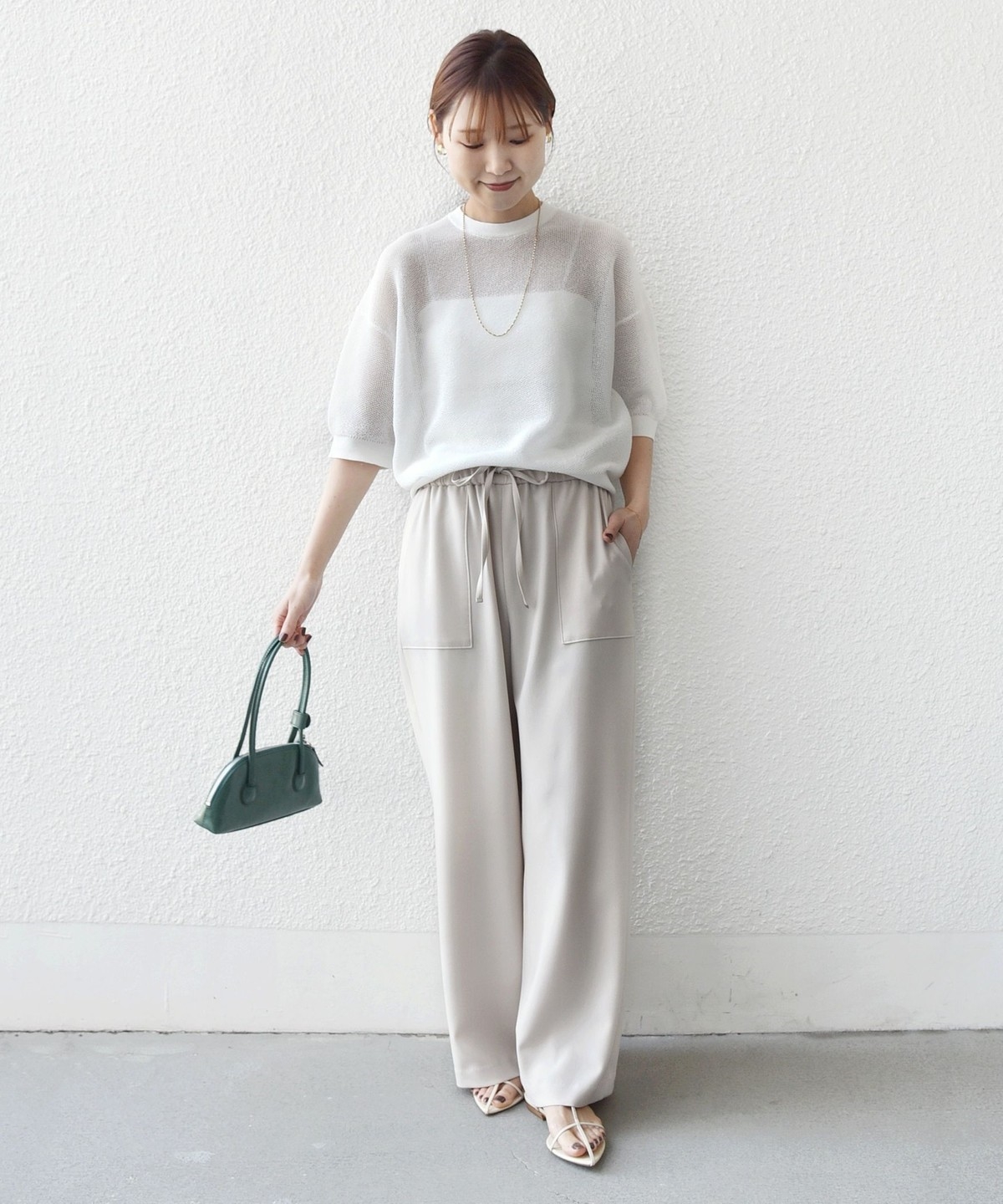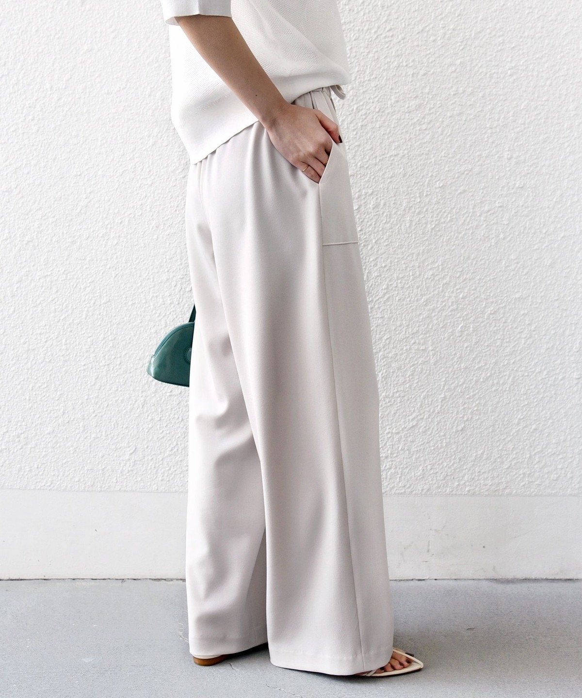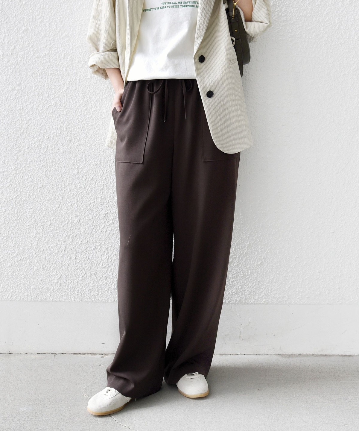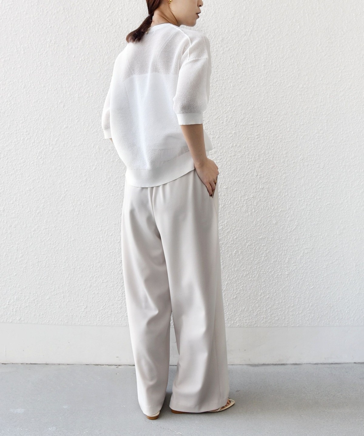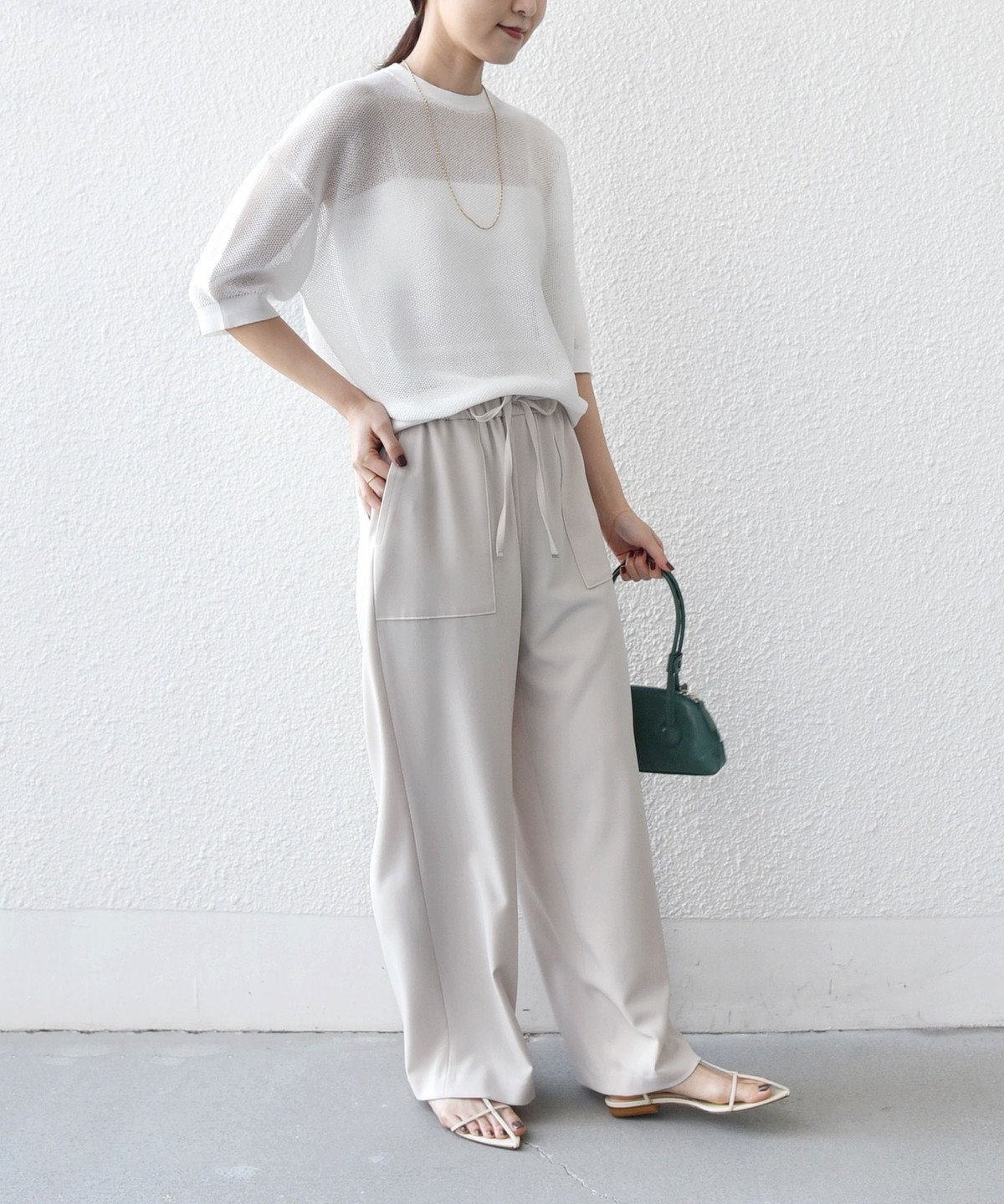 パンツに落ち感がある素材の為、トップスにニットやカットソーなど合わせるとコーディネートに素材の対比がでておしゃれ見えします。