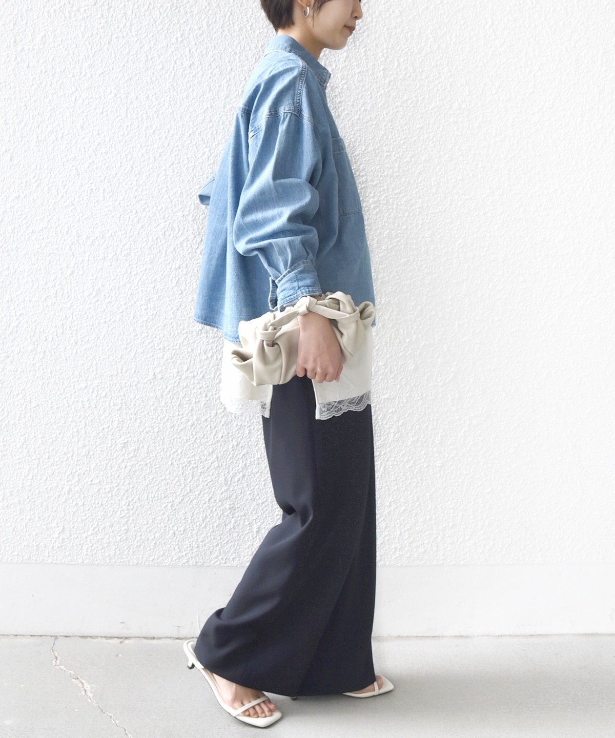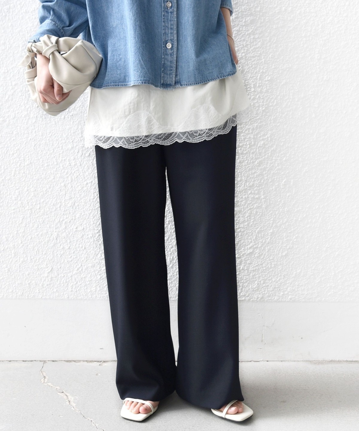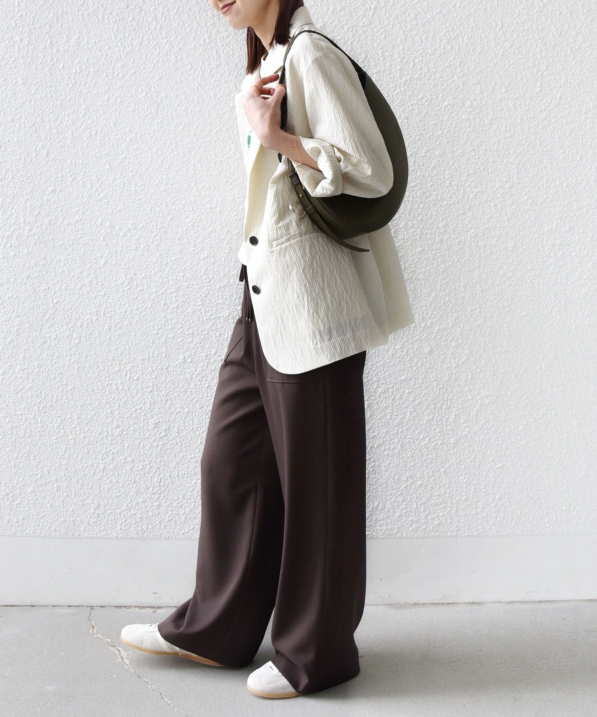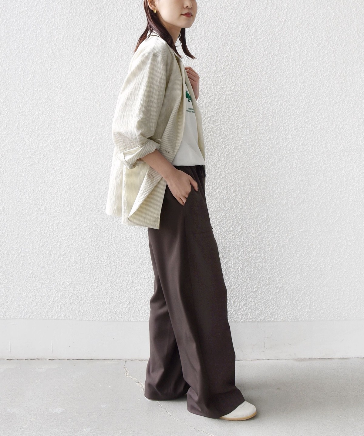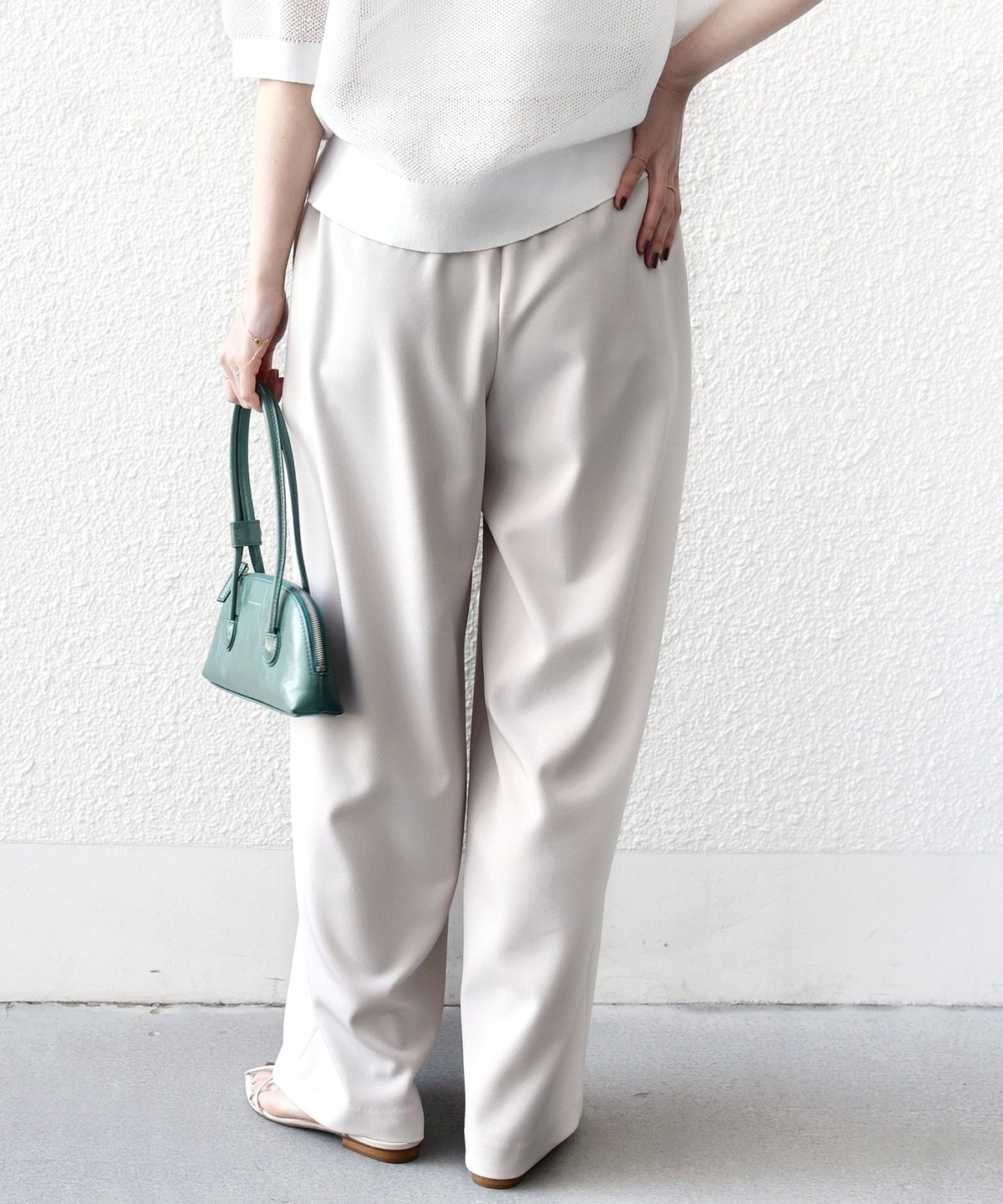 シンプルなドレープがきれいにでるパンツなので、きれいめなコーディネートに取り入れると大人のリラックス感を演出することができます。