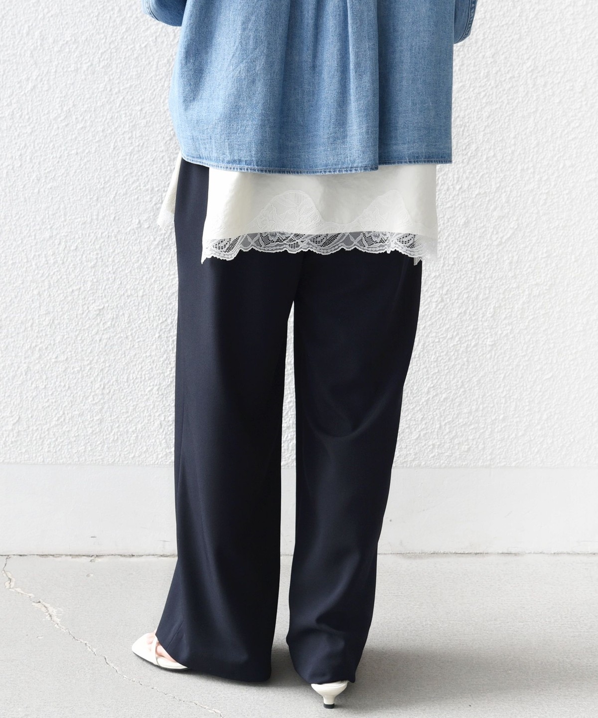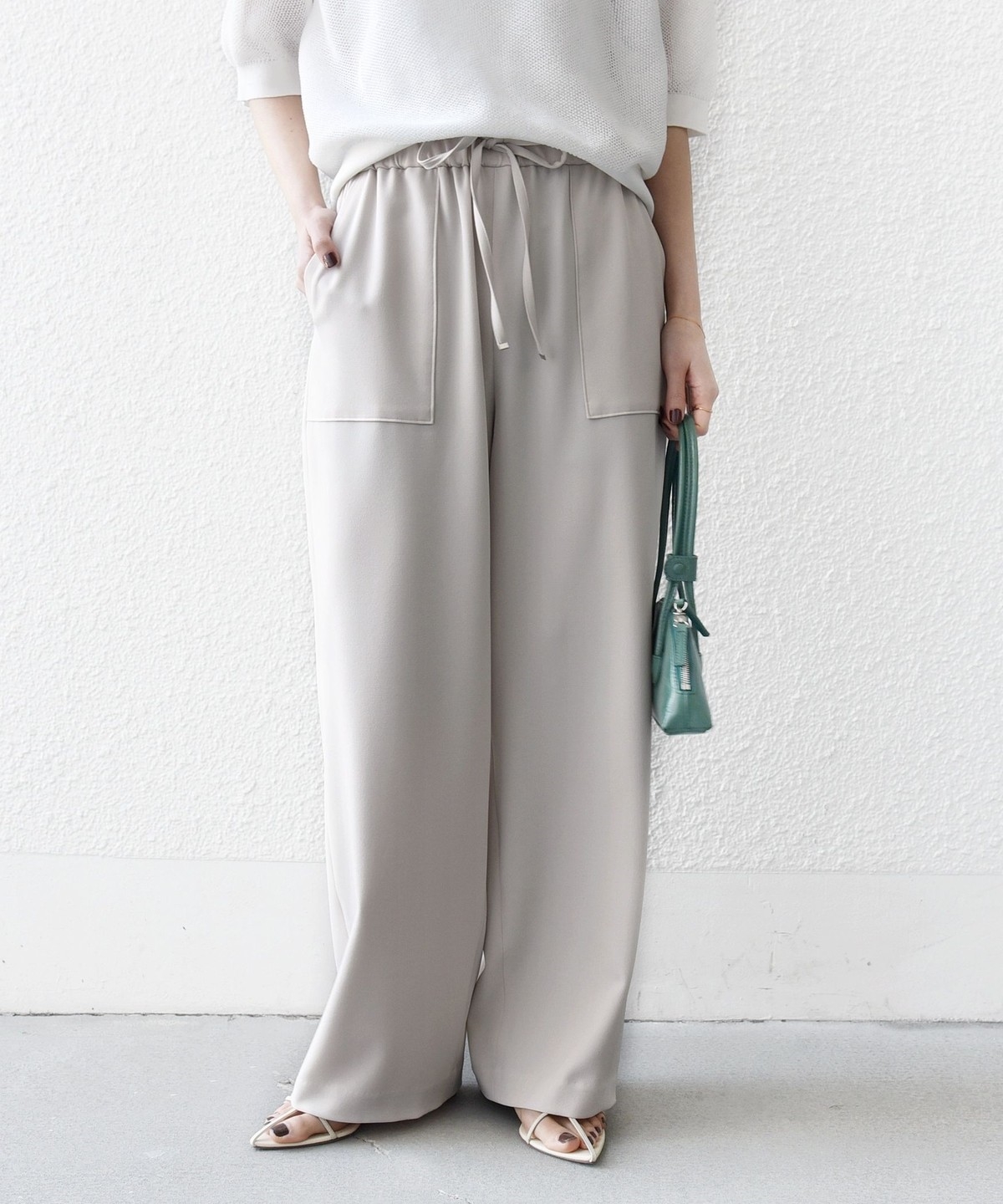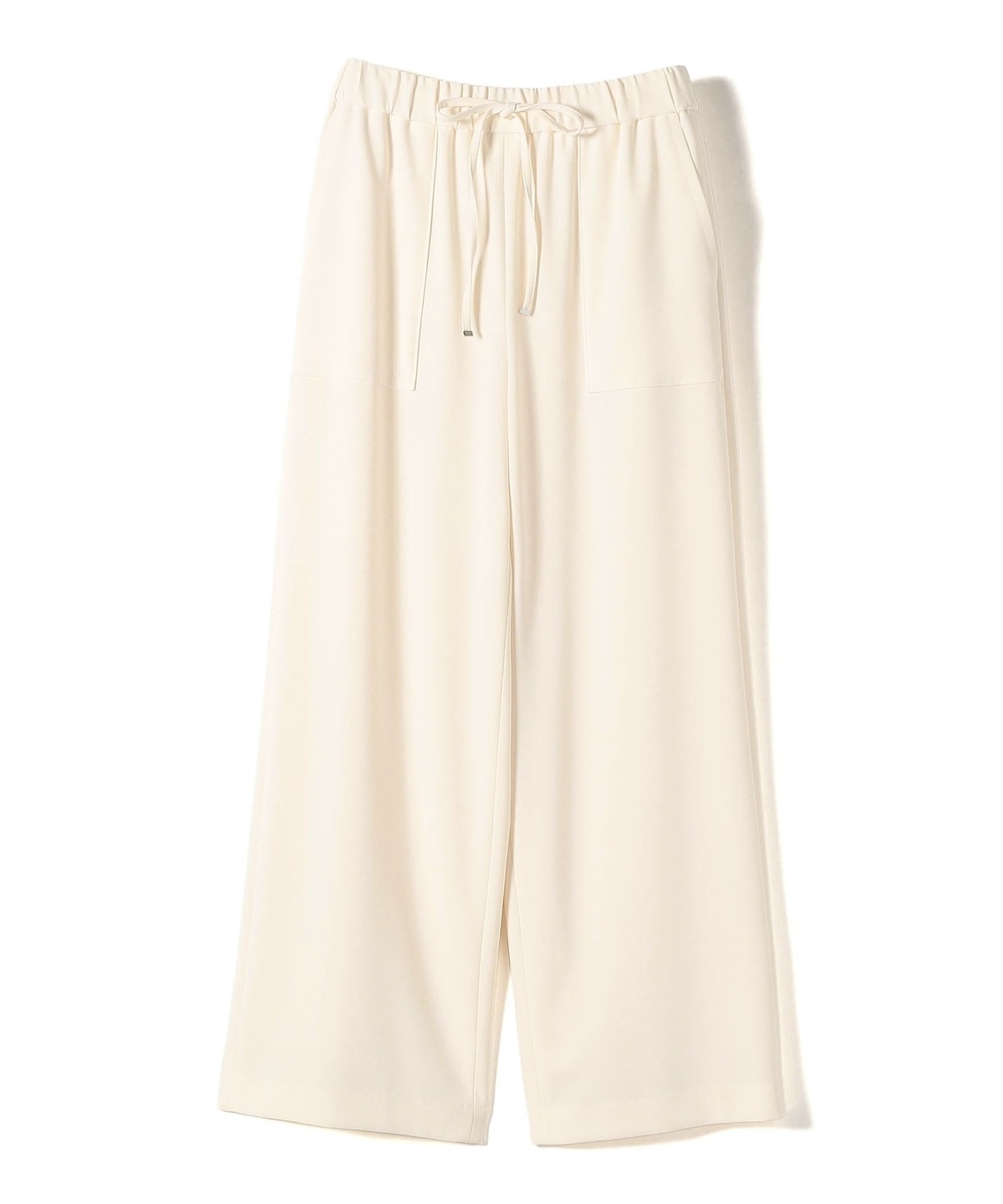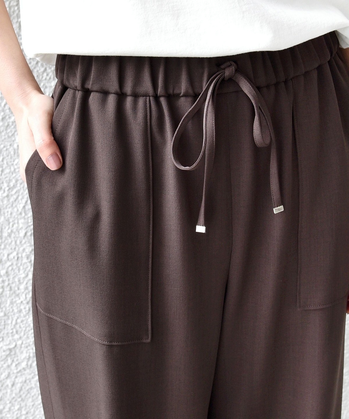 ウエストをドロスト仕様にしたリラックス感と女性らしい柔らかさを添えるベイカードロストパンツ。