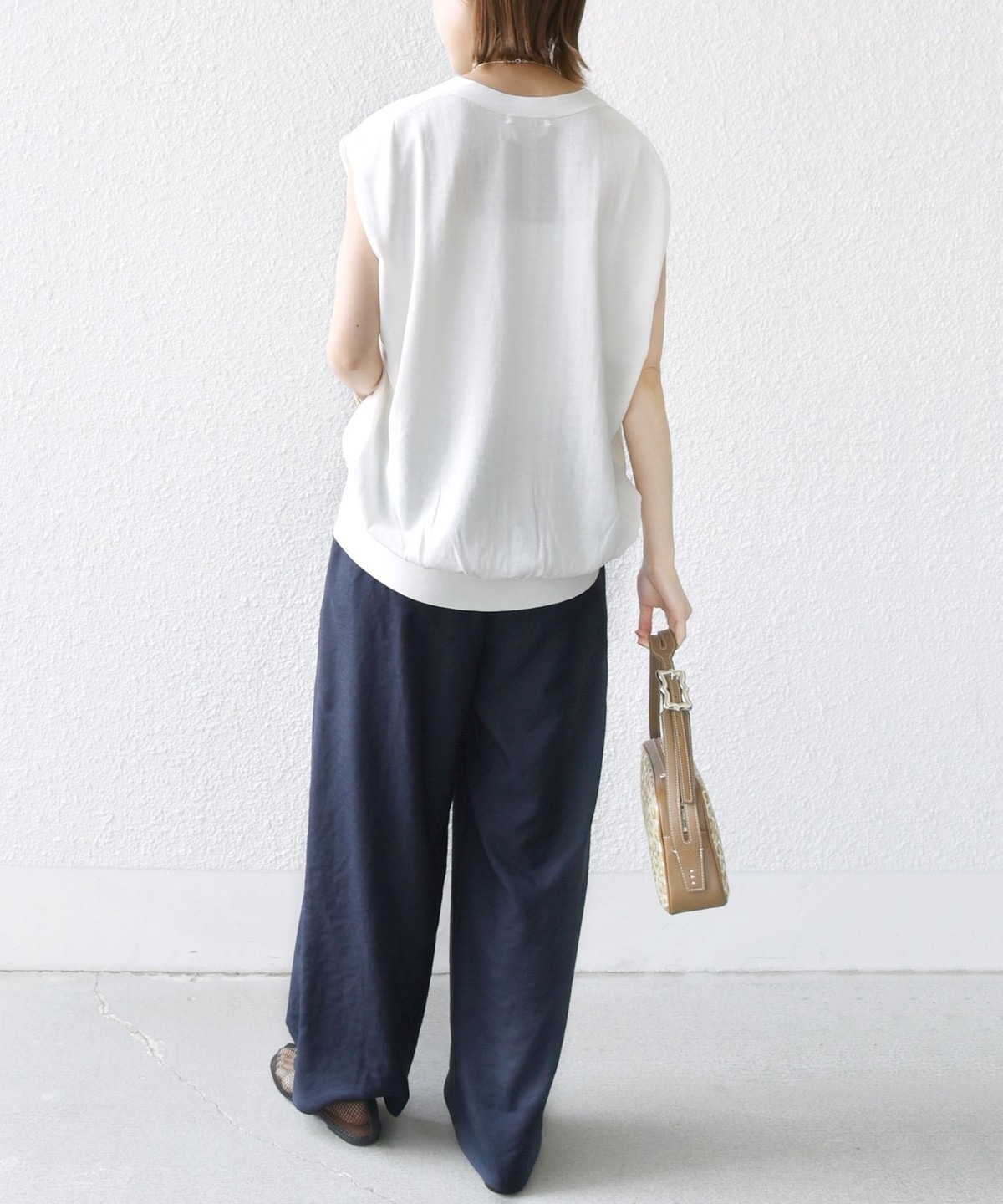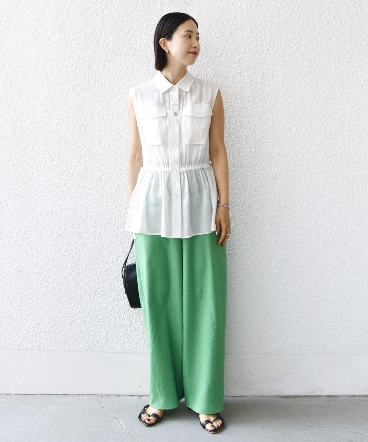 絶妙なギャザー分量でウエスト周りがかさ張らないので、ワンピースと合わせるスタイリングもおすすめです。