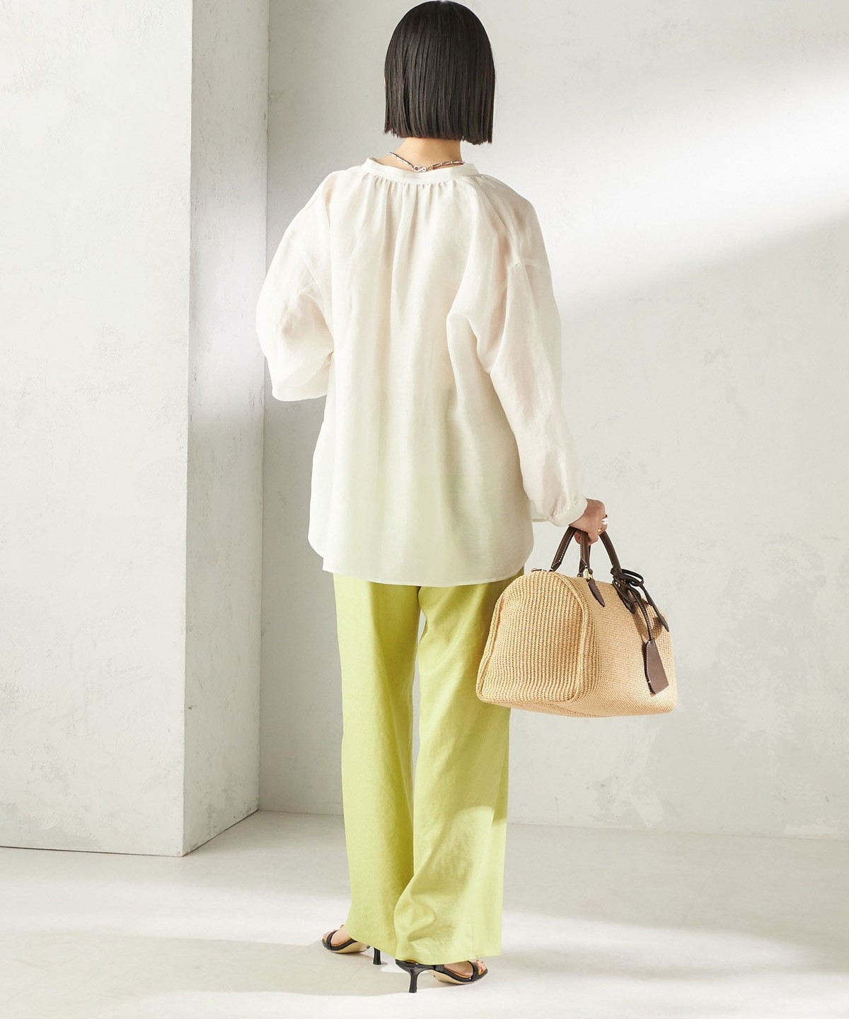 絶妙なギャザー分量でウエスト周りがかさ張らないので、ワンピースと合わせるスタイリングもおすすめです。