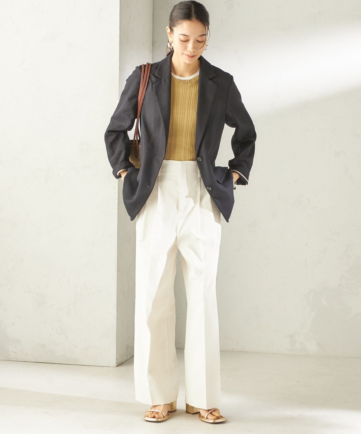 トップスイン×ベルトで女性らしい印象に、トップスアウトでリラックスしたスタイリングもおすすめ。