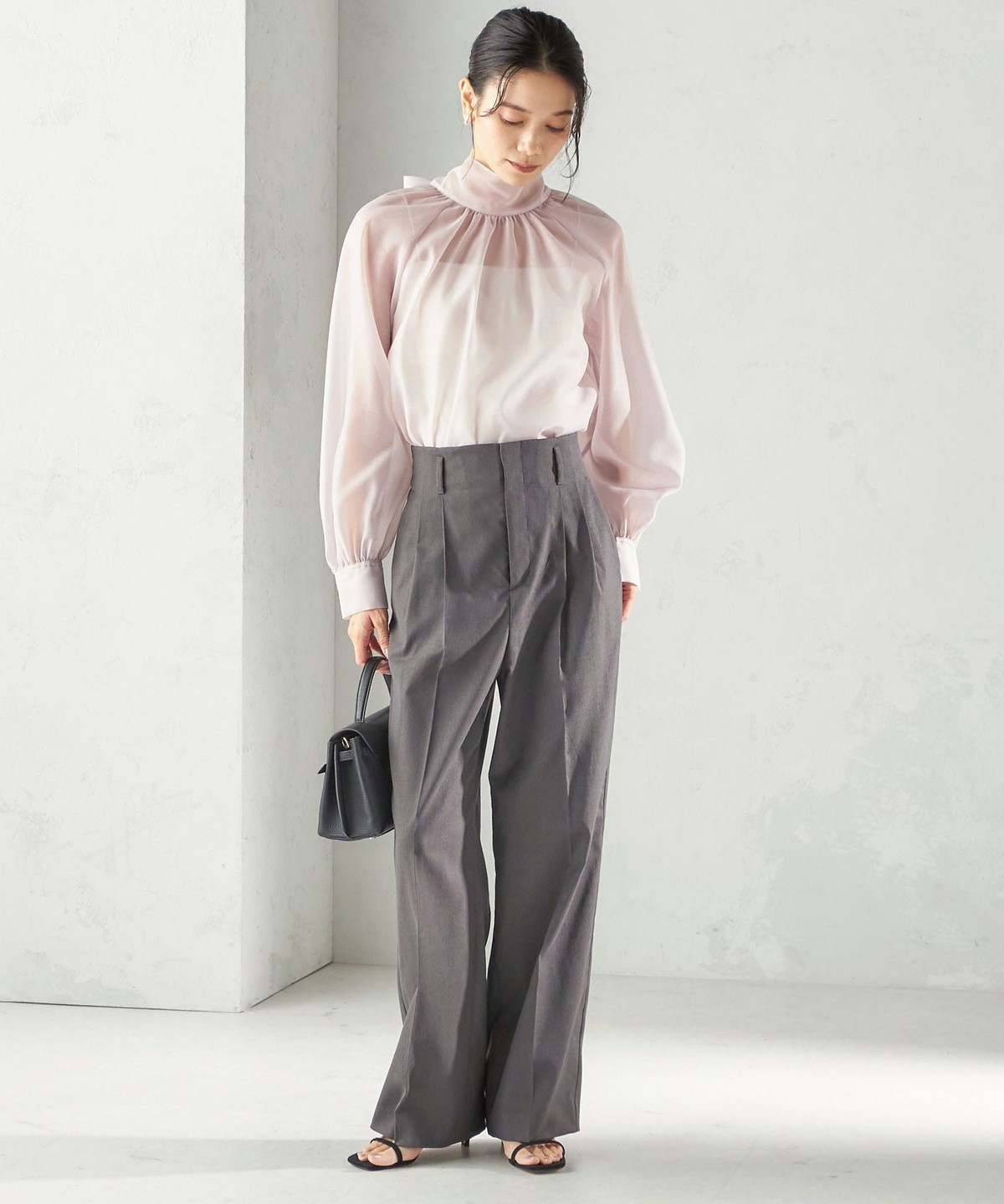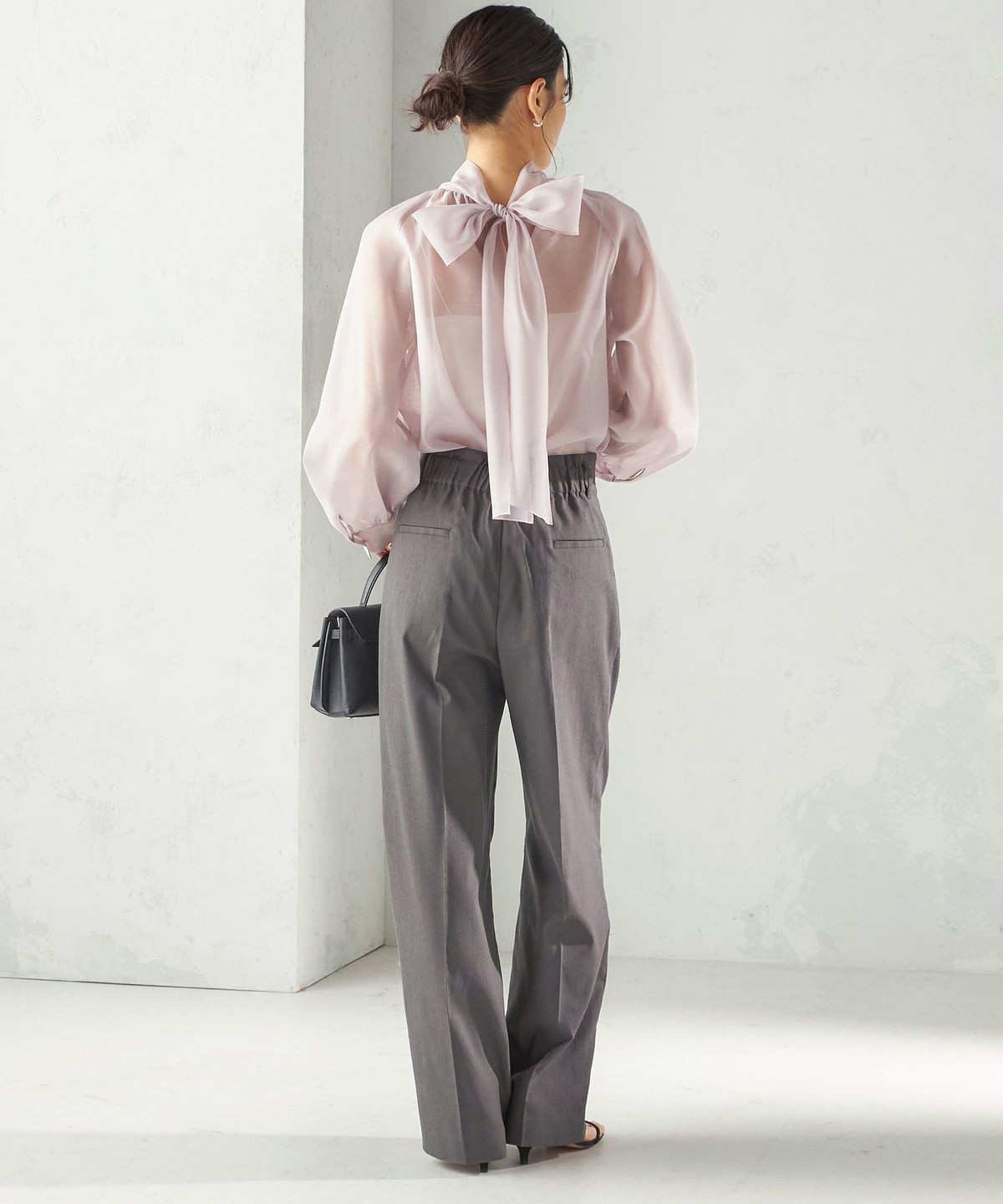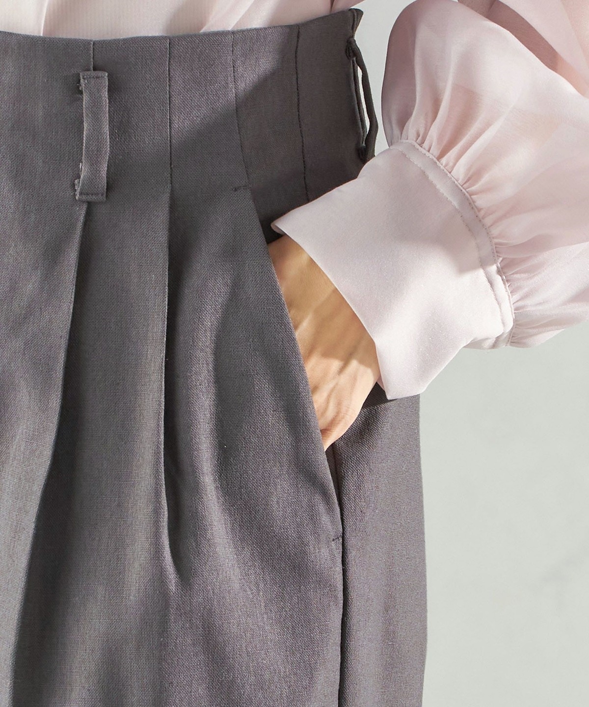ベルトレスなデザインで女性らしく、ウエスト周りをすっきりと仕上げています。