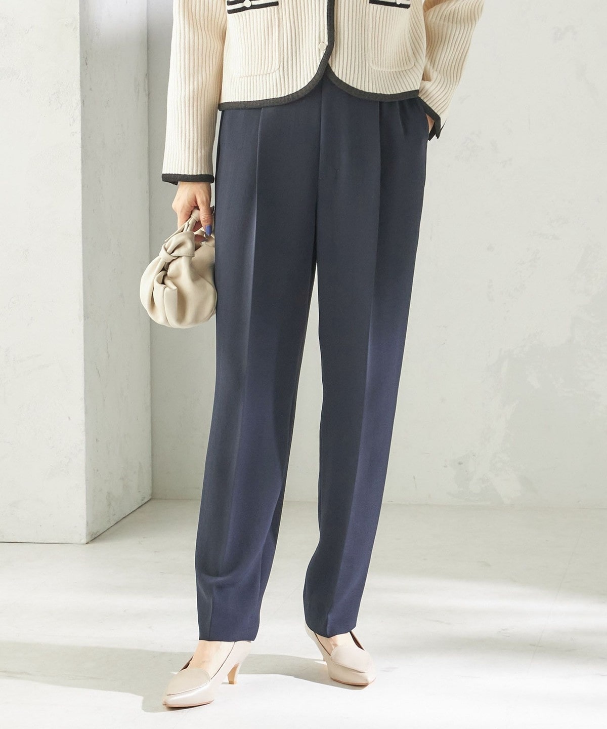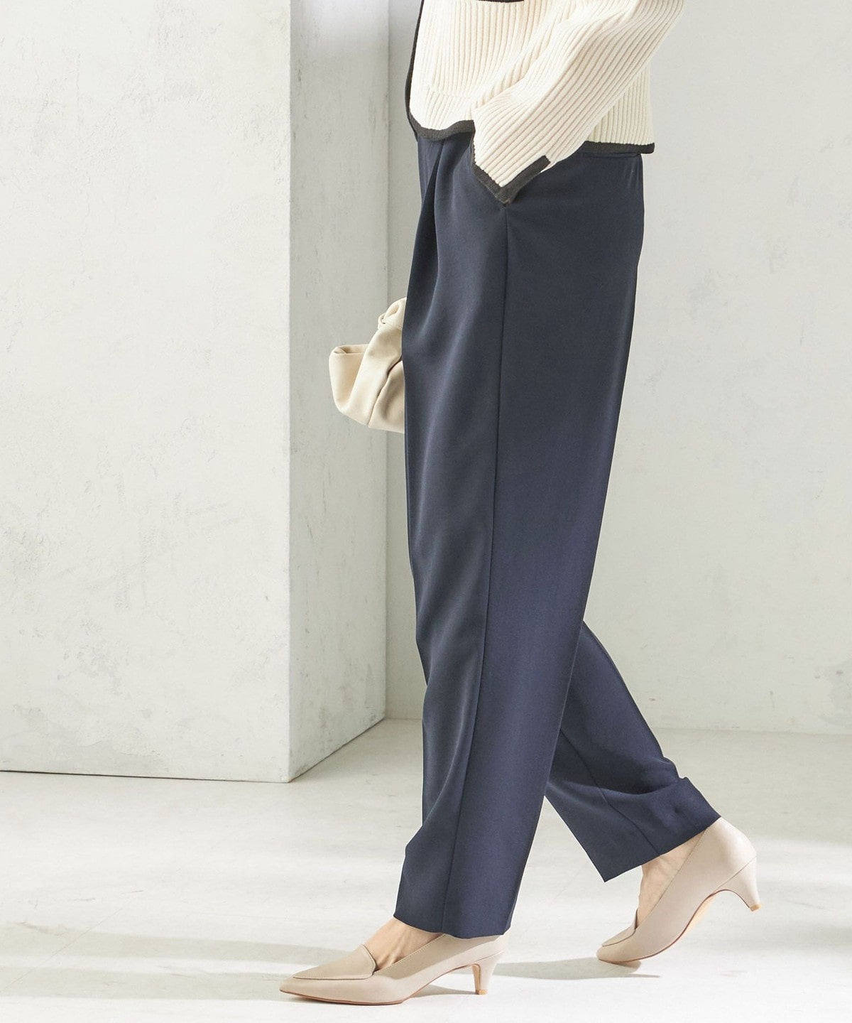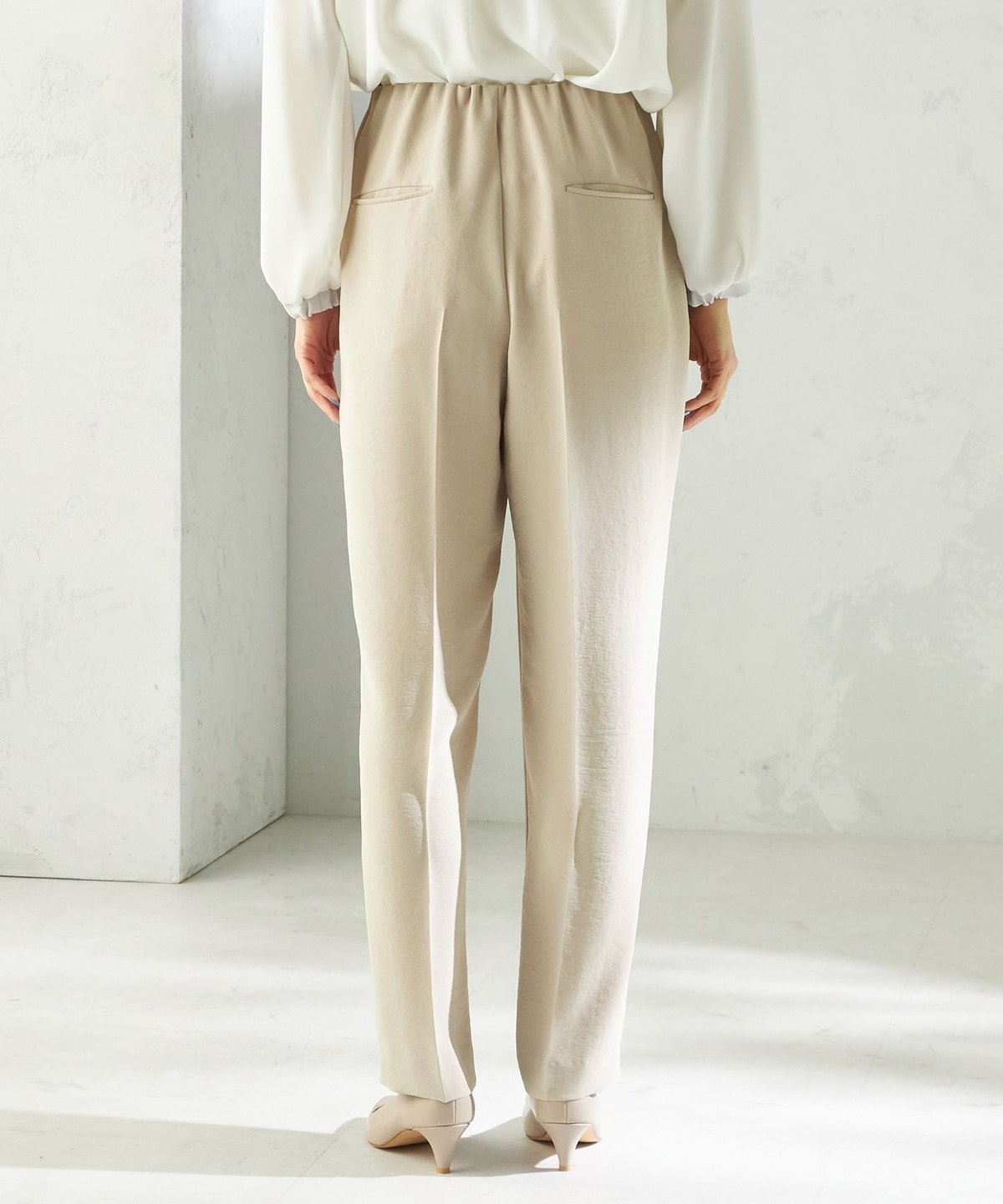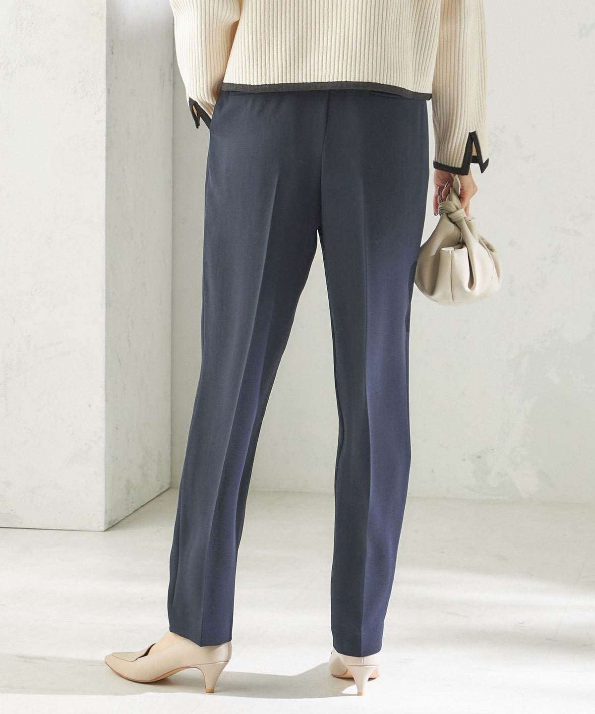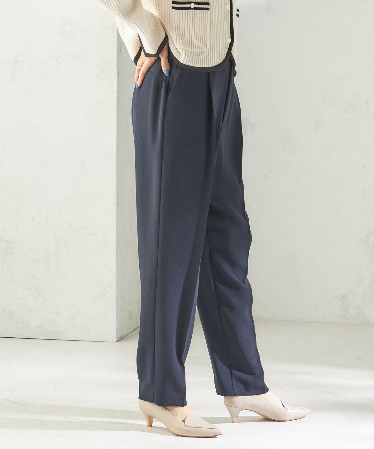 程よく細身のシルエットとセンタープレスが、落ち感のある素材と相まって脚のラインをきれいに演出します。