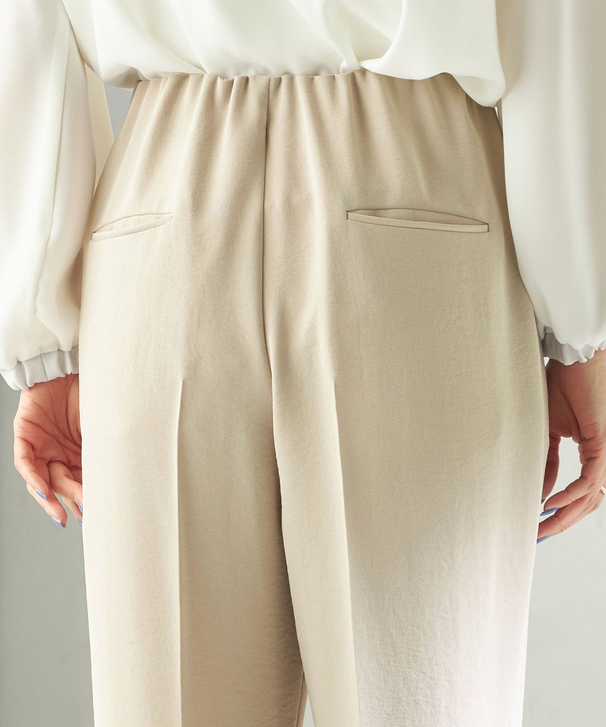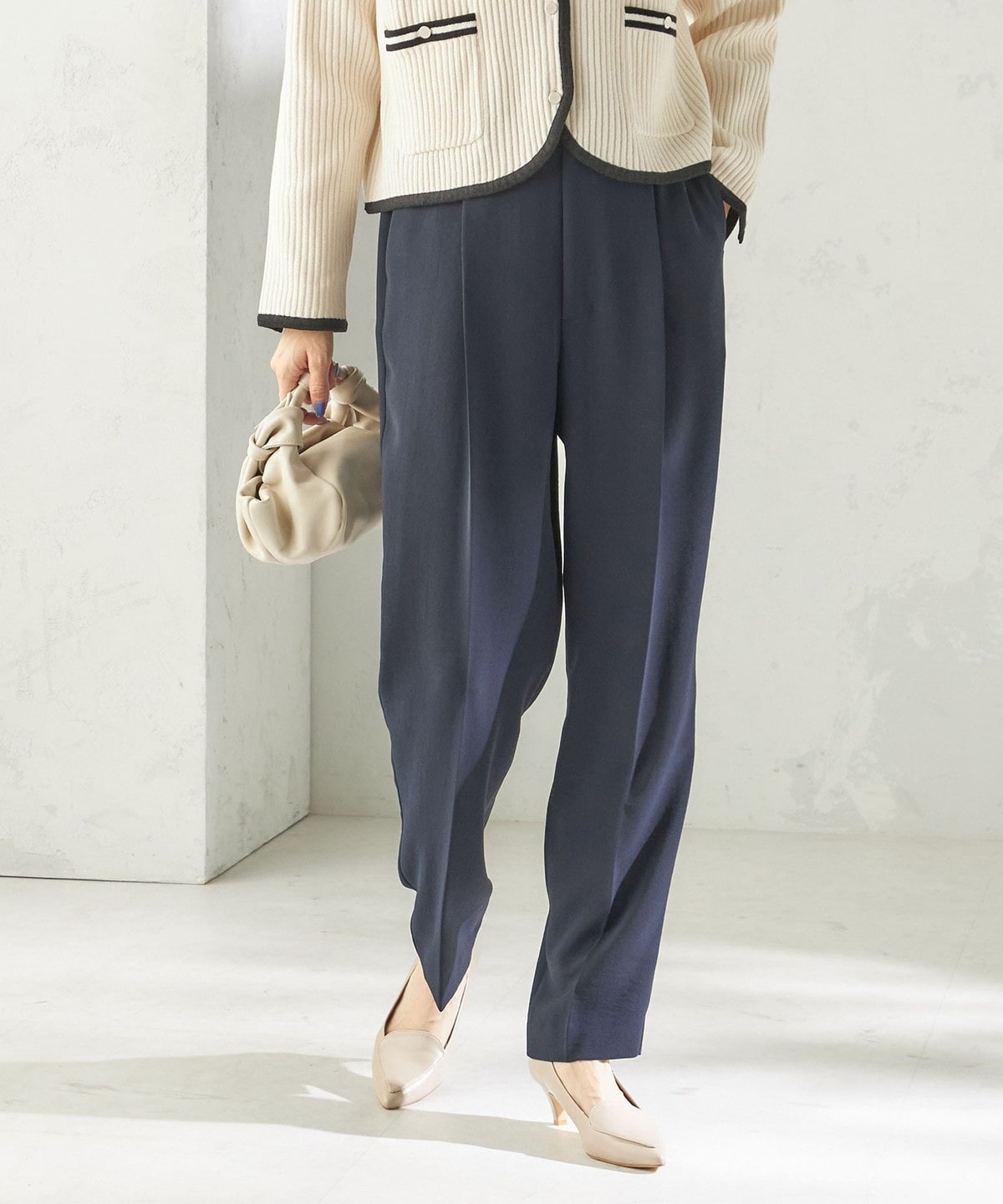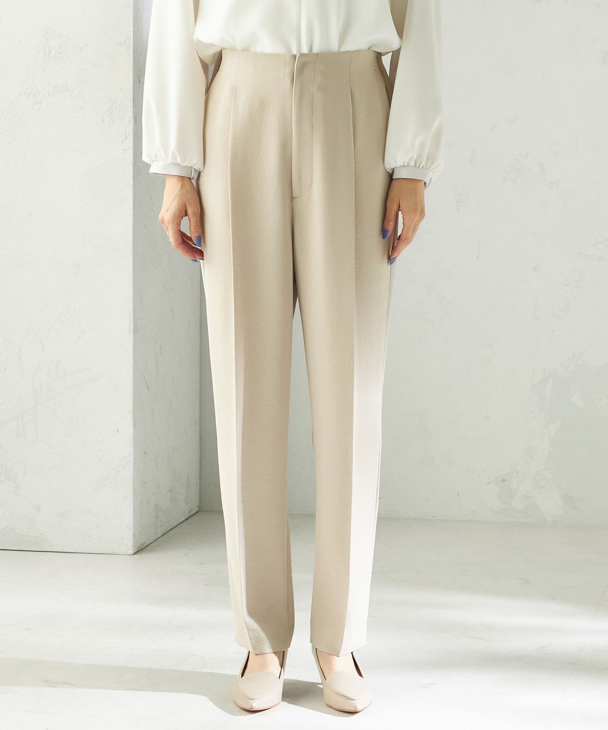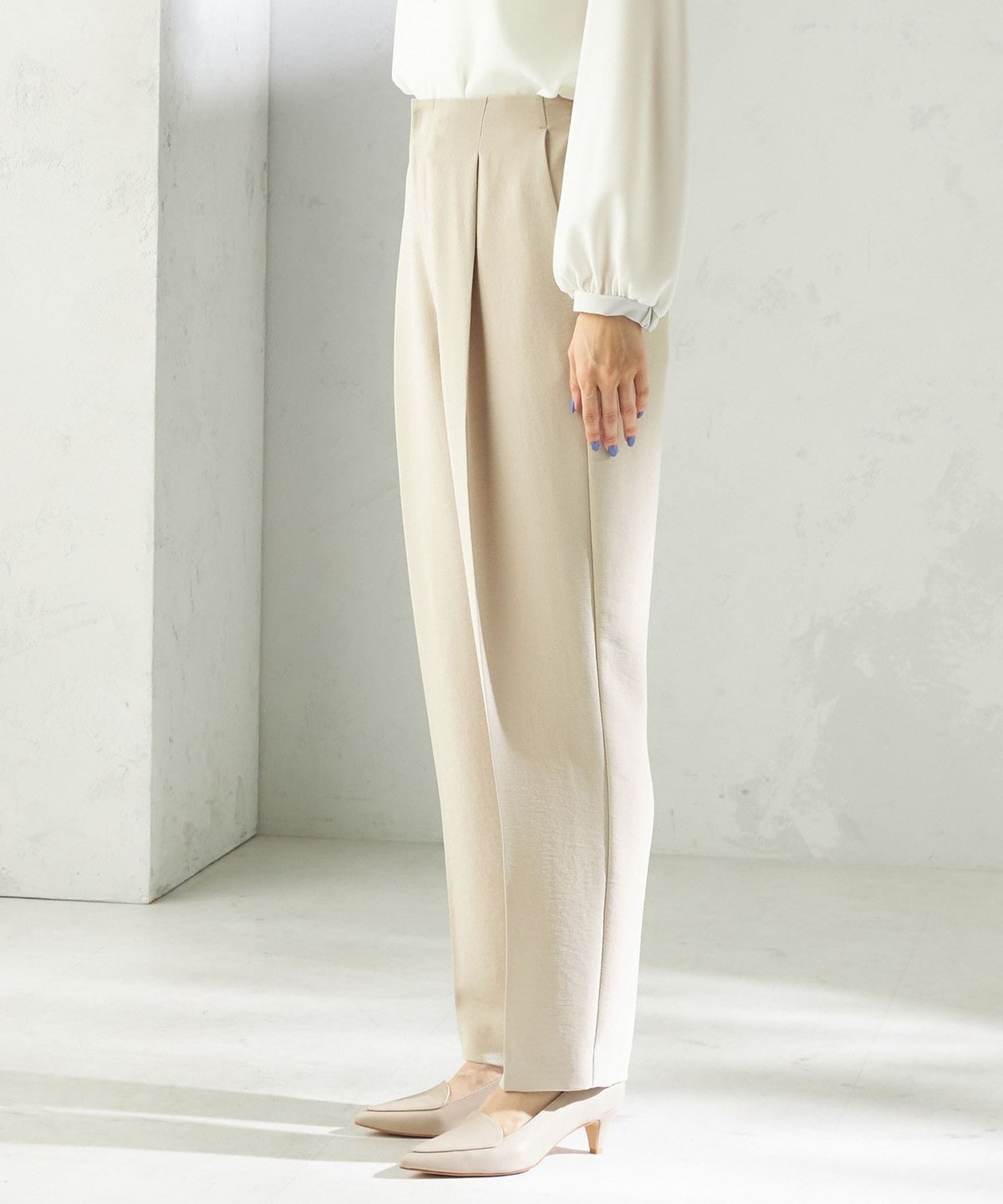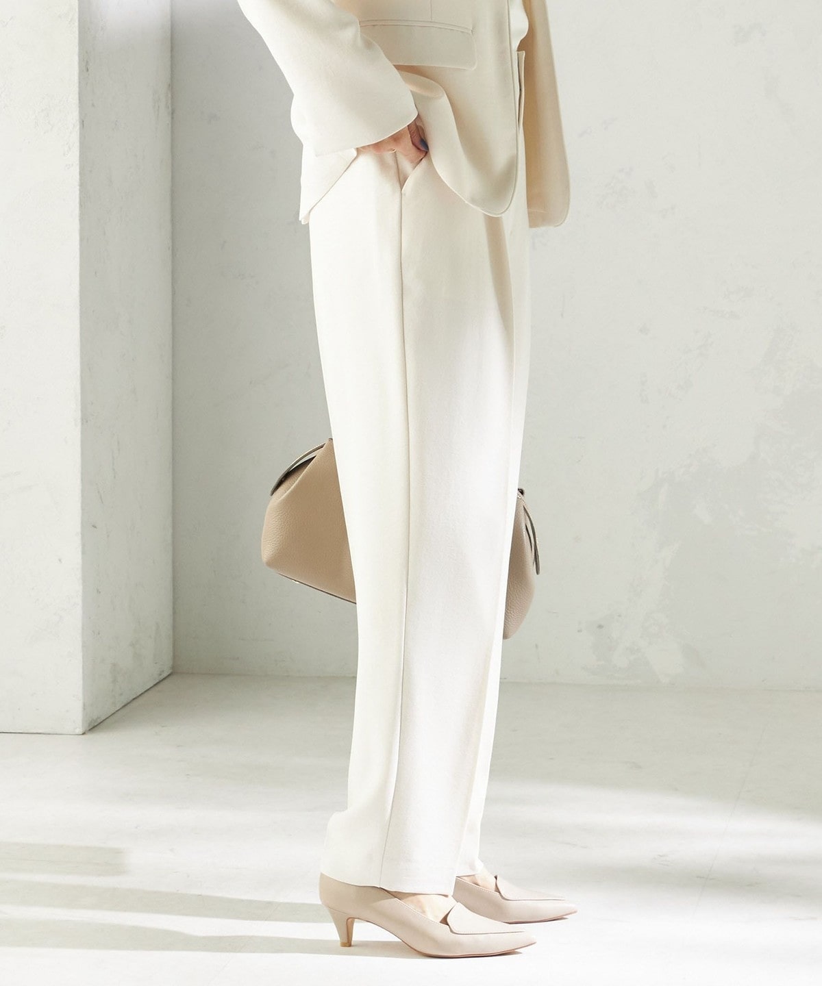程よく細身のシルエットとセンタープレスが、落ち感のある素材と相まって脚のラインをきれいに演出します。