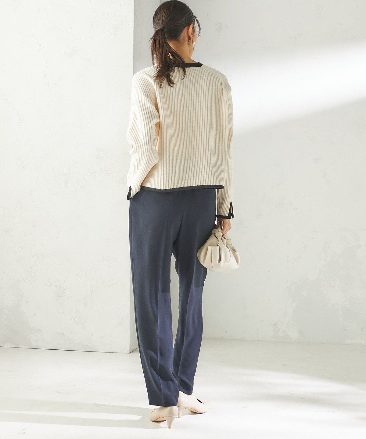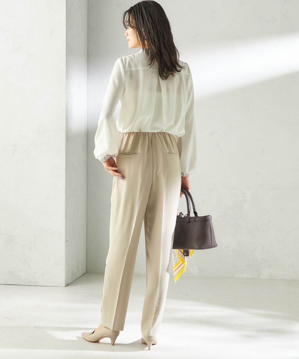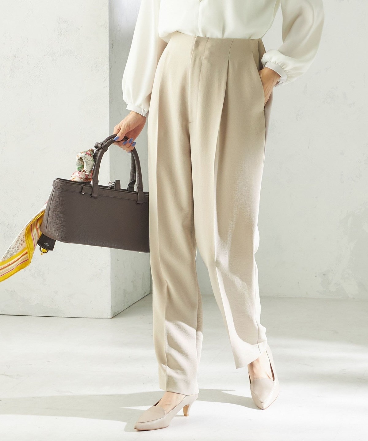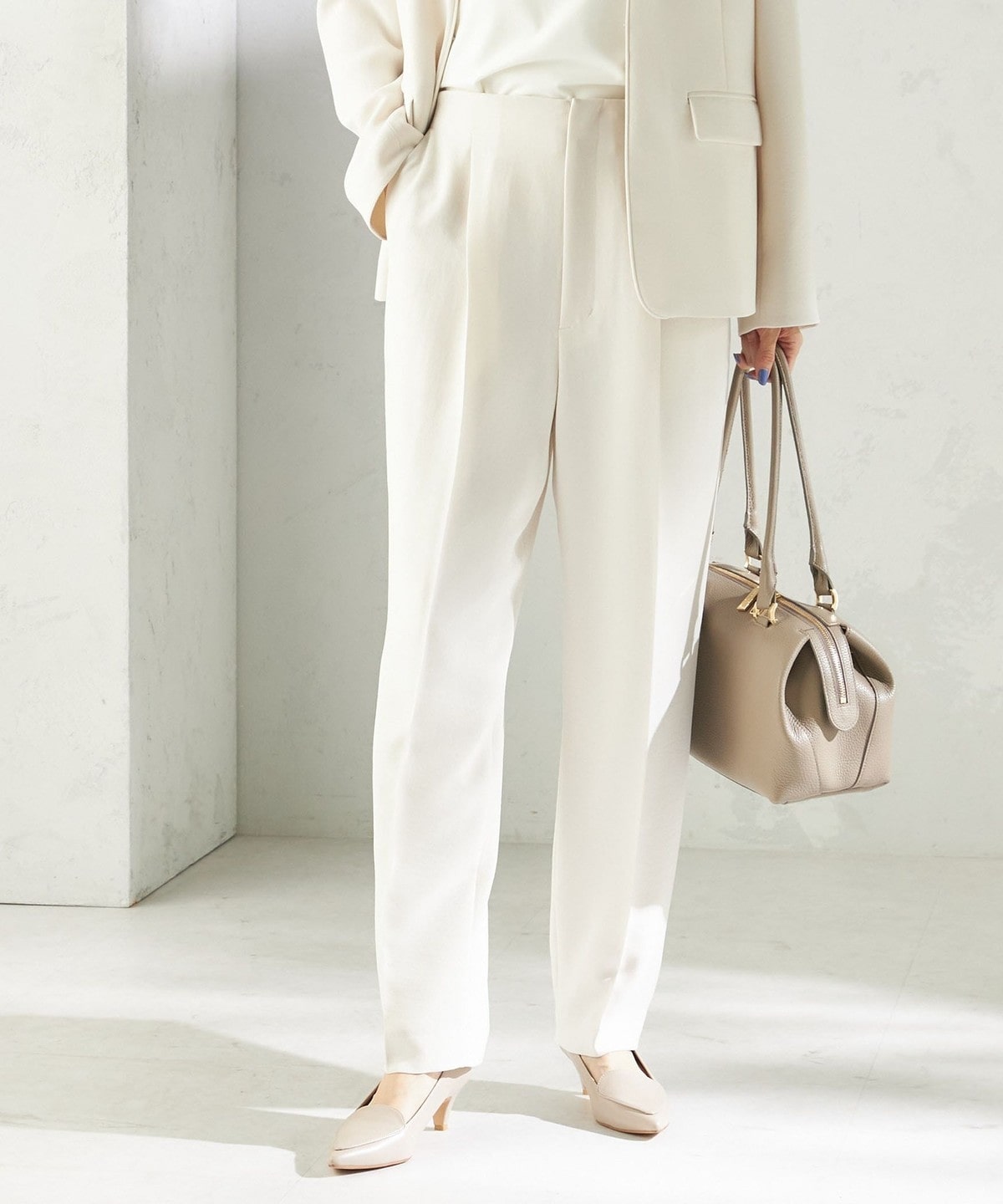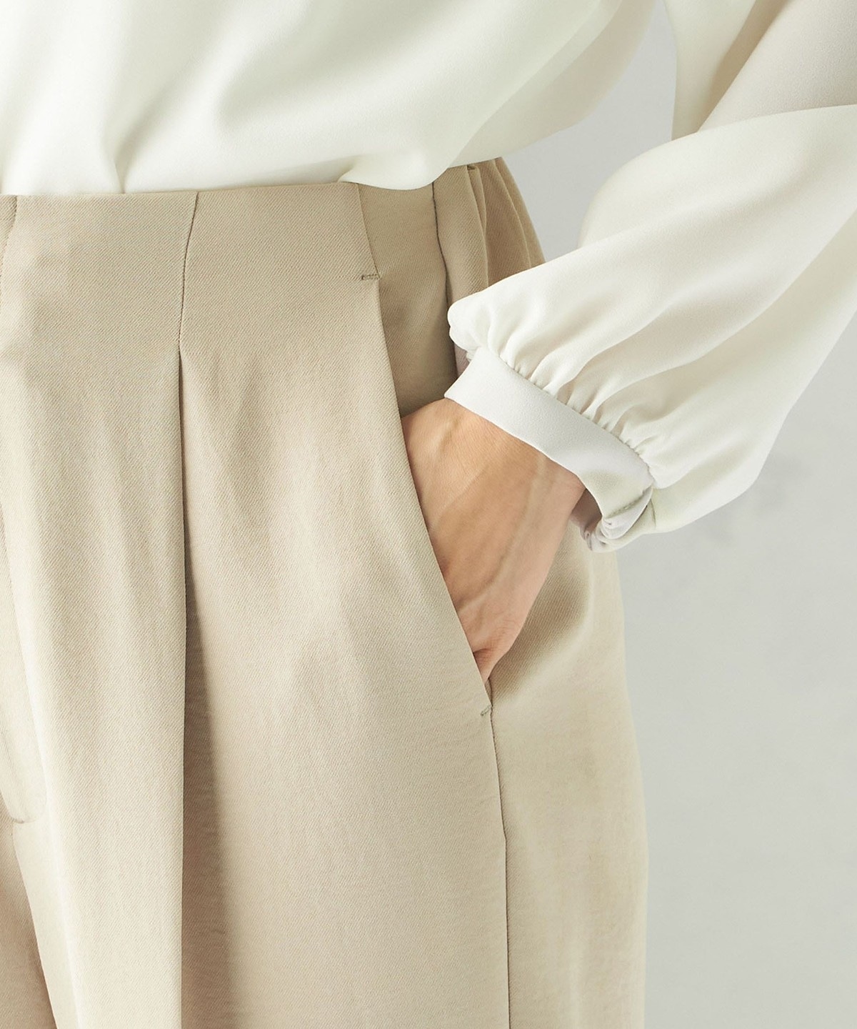 程よく細身のシルエットとセンタープレスが、落ち感のある素材と相まって脚のラインをきれいに演出します。