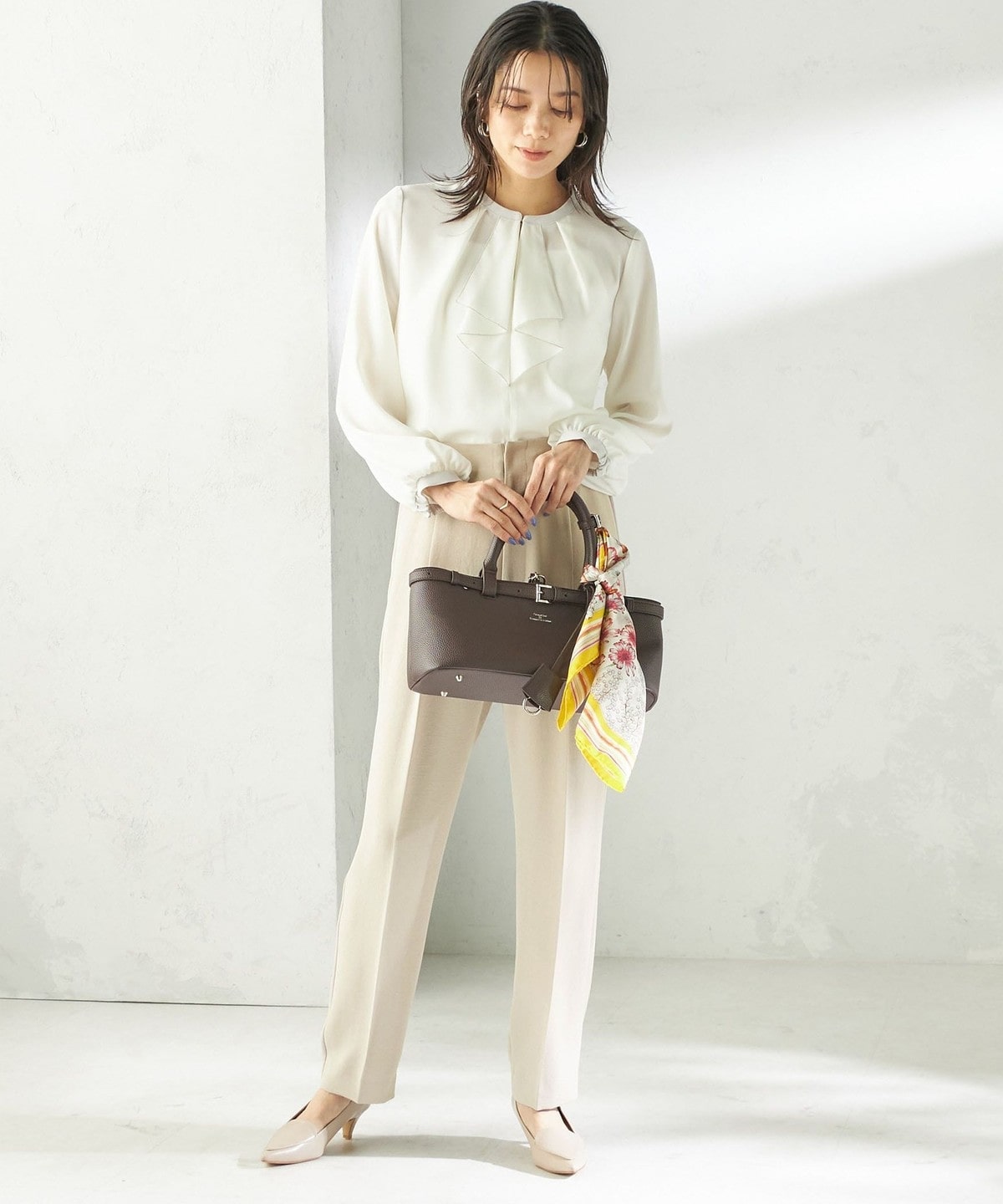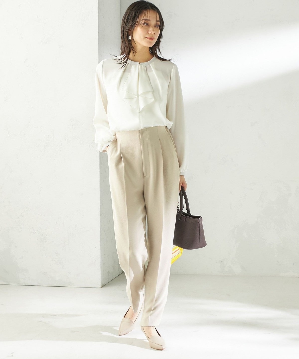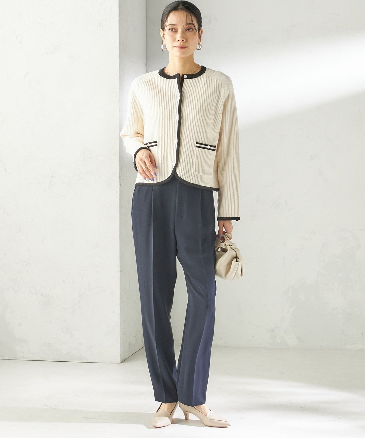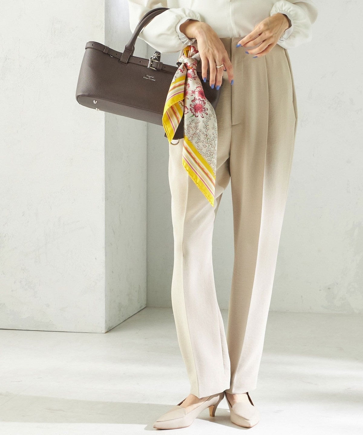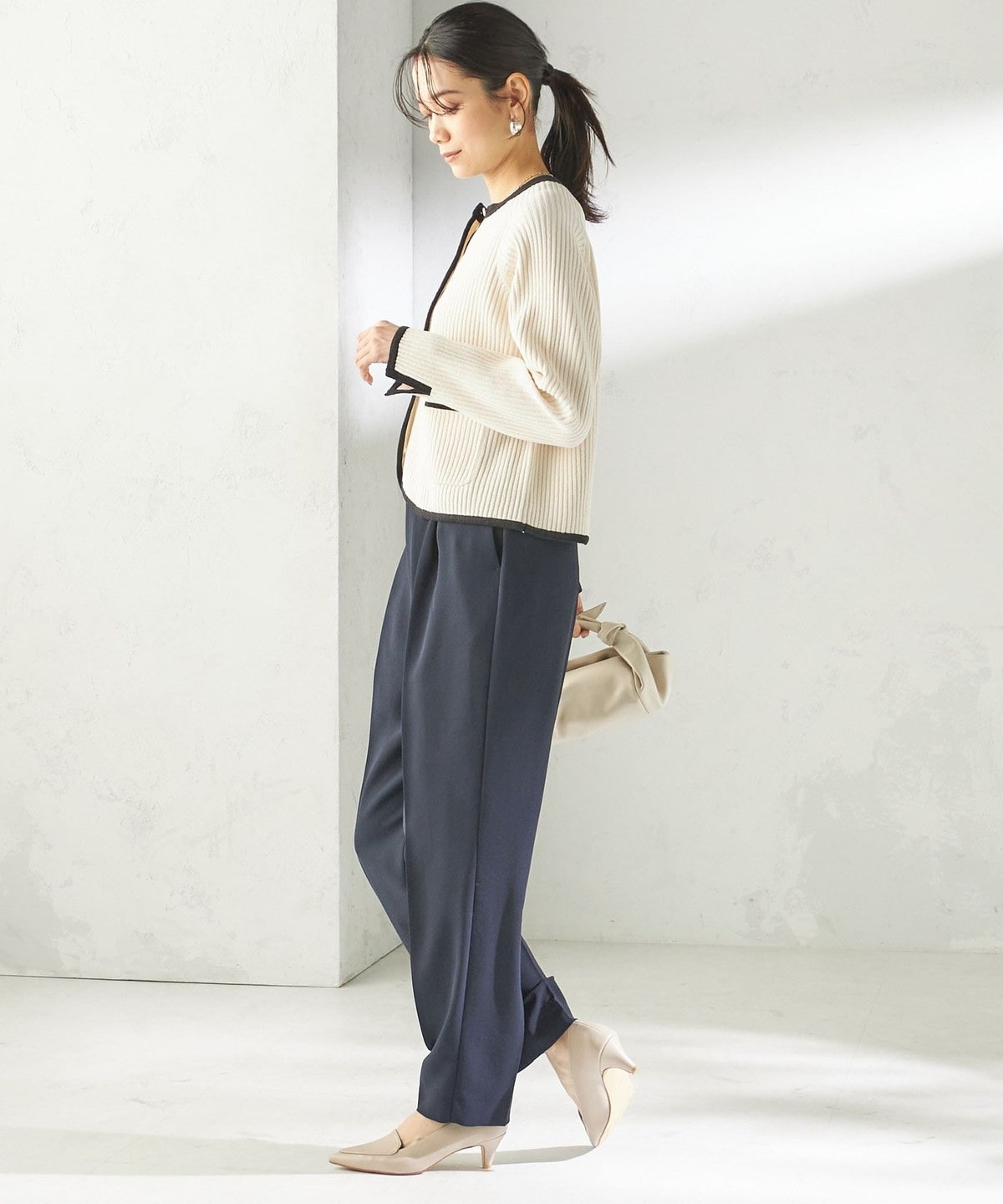 程よく細身のシルエットとセンタープレスが、落ち感のある素材と相まって脚のラインをきれいに演出します。