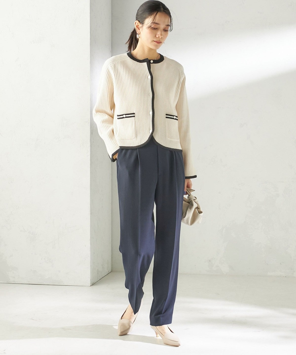 すっきりとしたテーパードシルエットのため、コンパクトなトップスからゆとりのあるアイテムまで好相性で、単品パンツとしても着回しやすい一枚です。