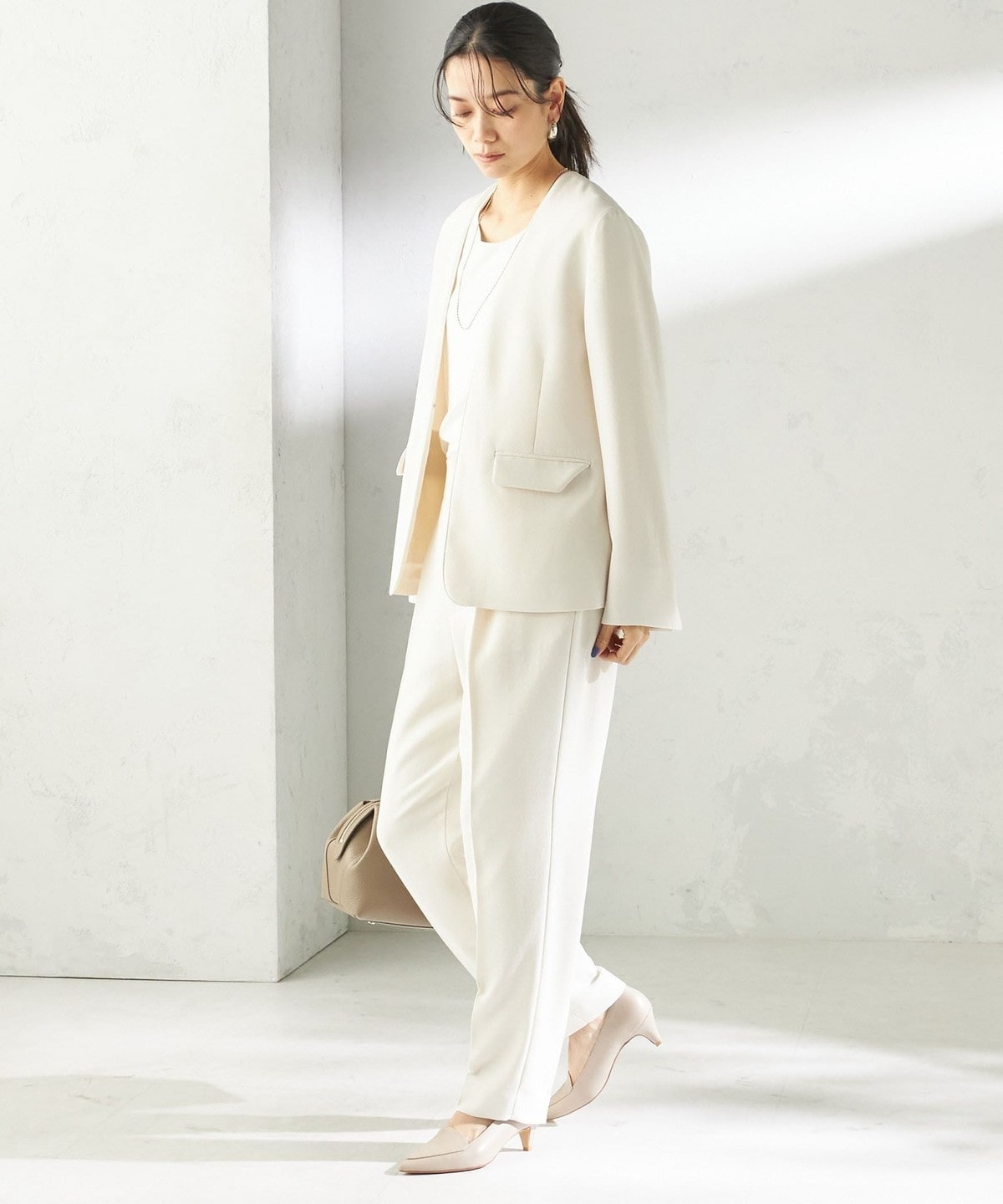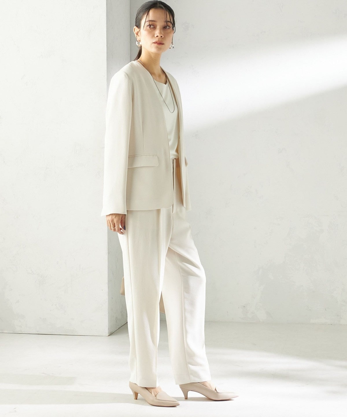 同素材のジャケットとのセットアップで、オフィスシーンからオケージョンまで幅広く対応。