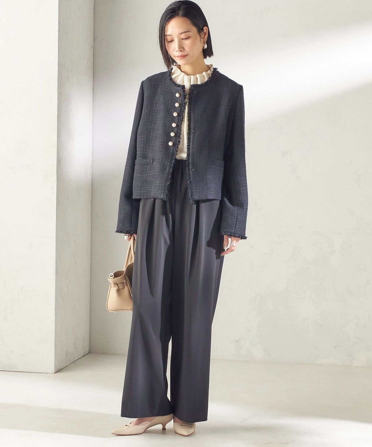 綺麗めなトップスやジャケット合わせでオフィスからお食事会まで着用していただけます。