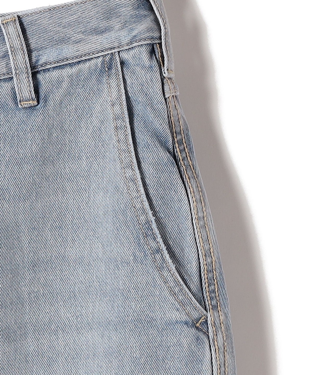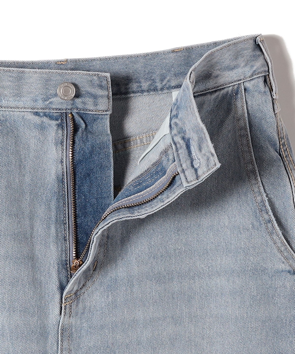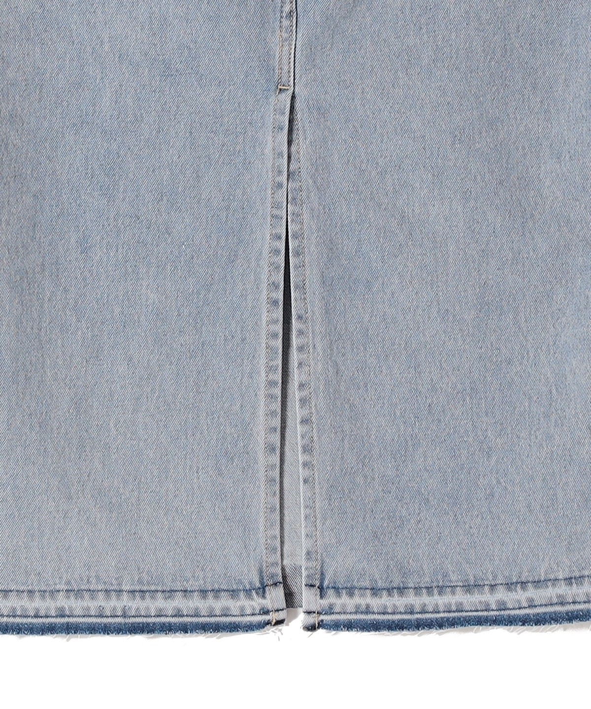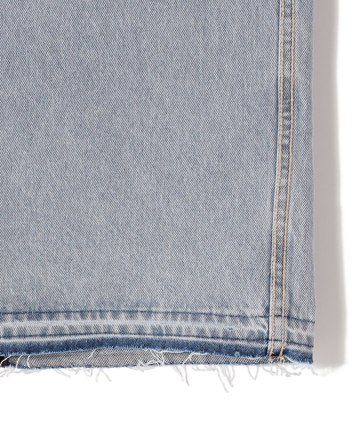 ヴィンテージ加工のライトブルーについては加工後に裾上げステッチを解き抜け感ある見え掛にしています。