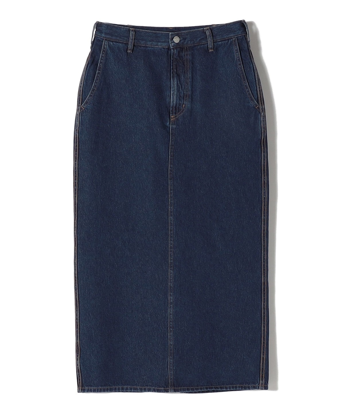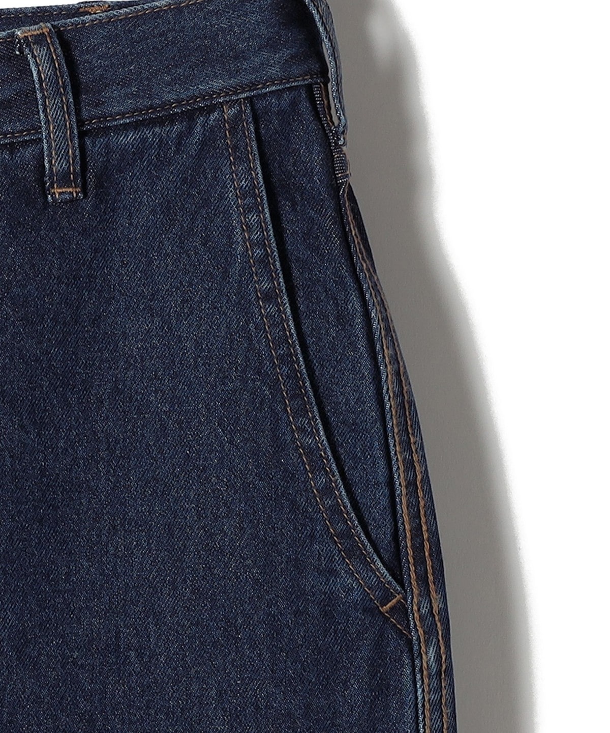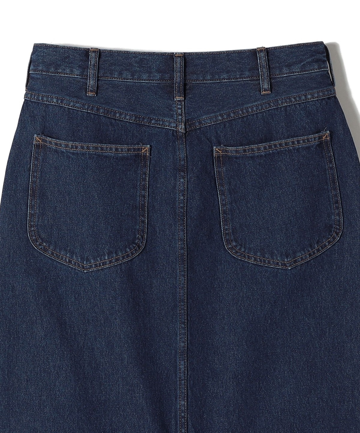 7本のベルトループやヨーク高にかけた環縫いステッチなど雰囲気のあるディティール使いと、まっすぐなストレートシルエットの長めの丈のバランスが大人っぽく素敵にマッチしています。