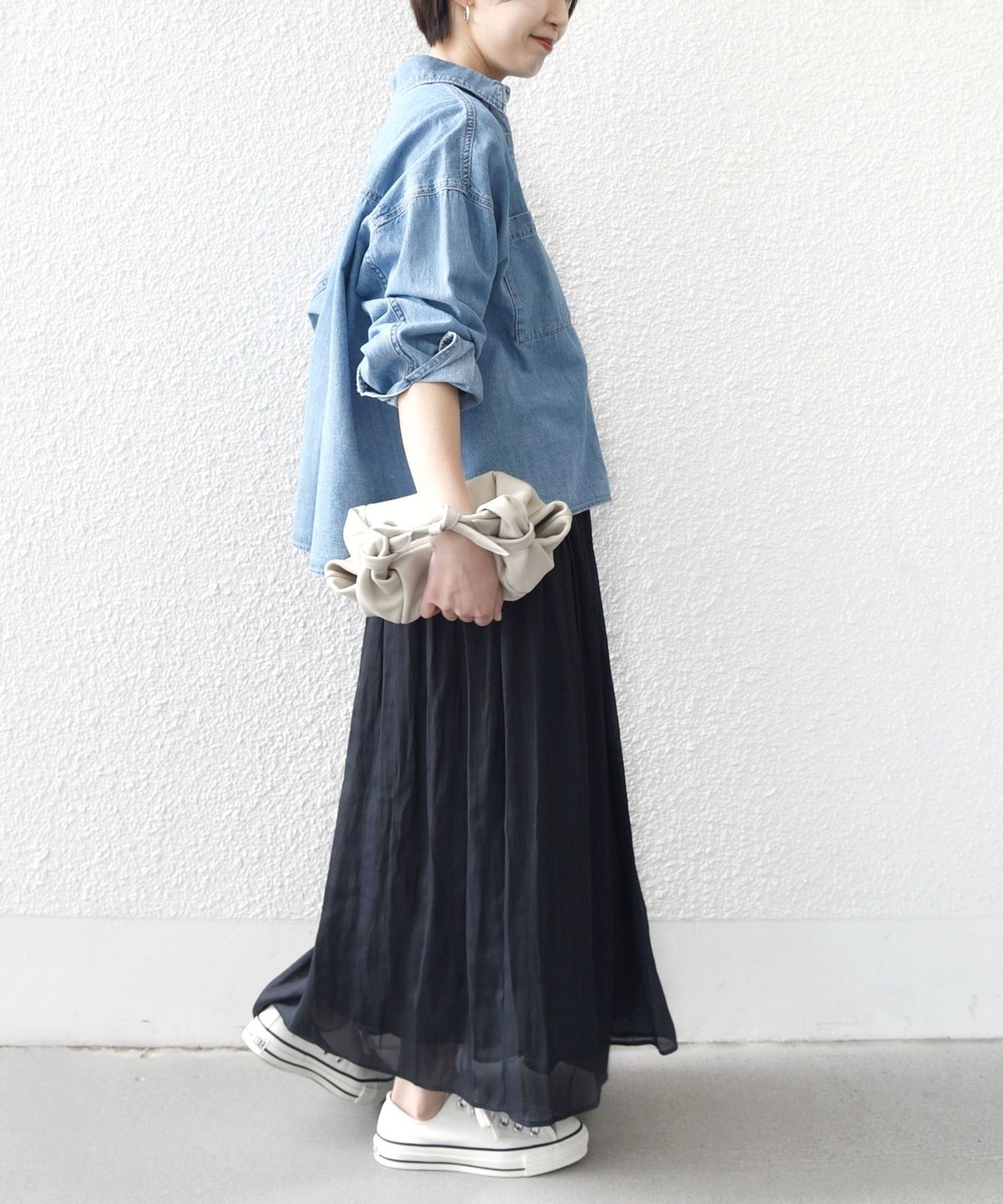 オーバーサイズのスウェットやゆるニットにスニーカーと合わせれば、甘さを抑えた大人のリラックススタイルに。
