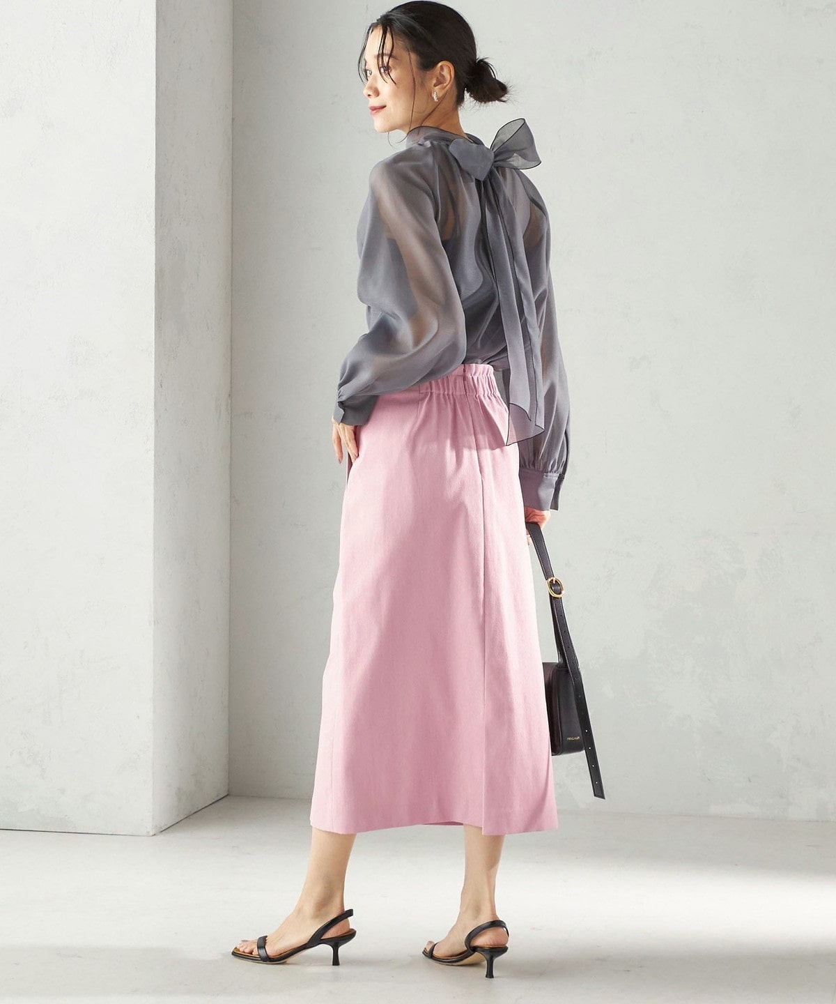 ウエストはベルトレスなデザインですっきりとさせ、後ろ中心のみをゴム仕様とし、着心地良く仕上げています。