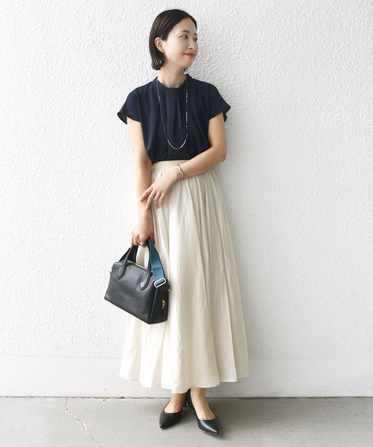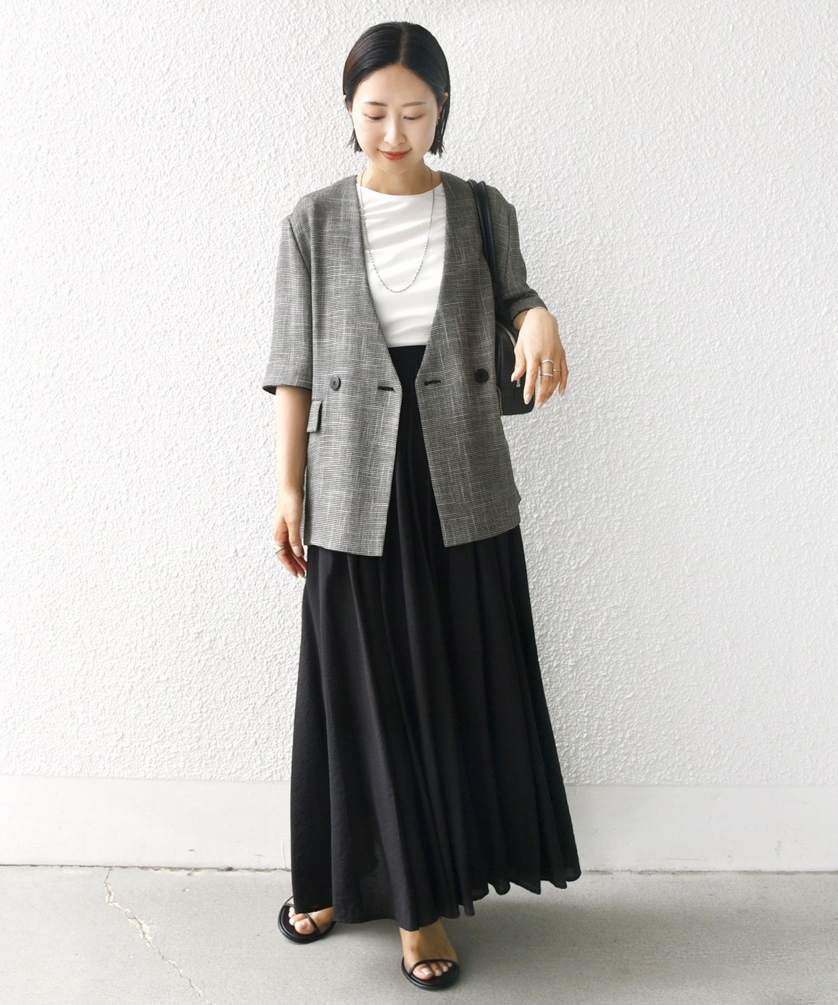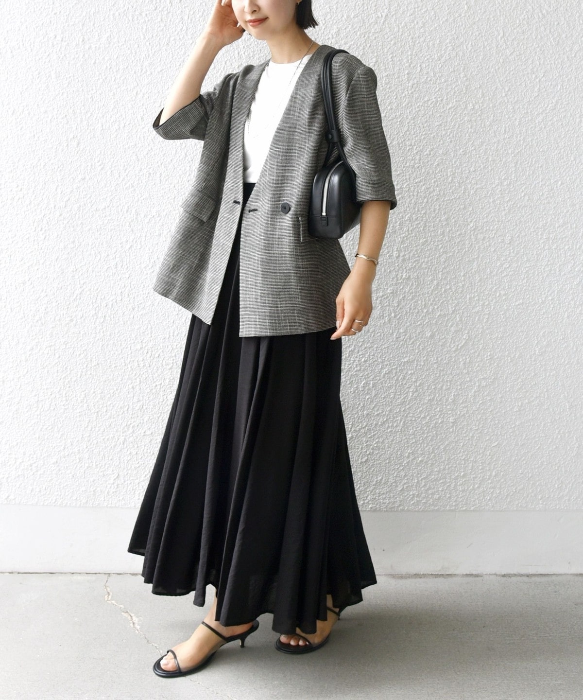 オフィスシーンではジャケットや落ち感のあるブラウスを合わせてきれいめに、オフの日はロゴTやメッシュシャツ、スウェットなどでカジュアルダウンしてもおしゃれにきまります。