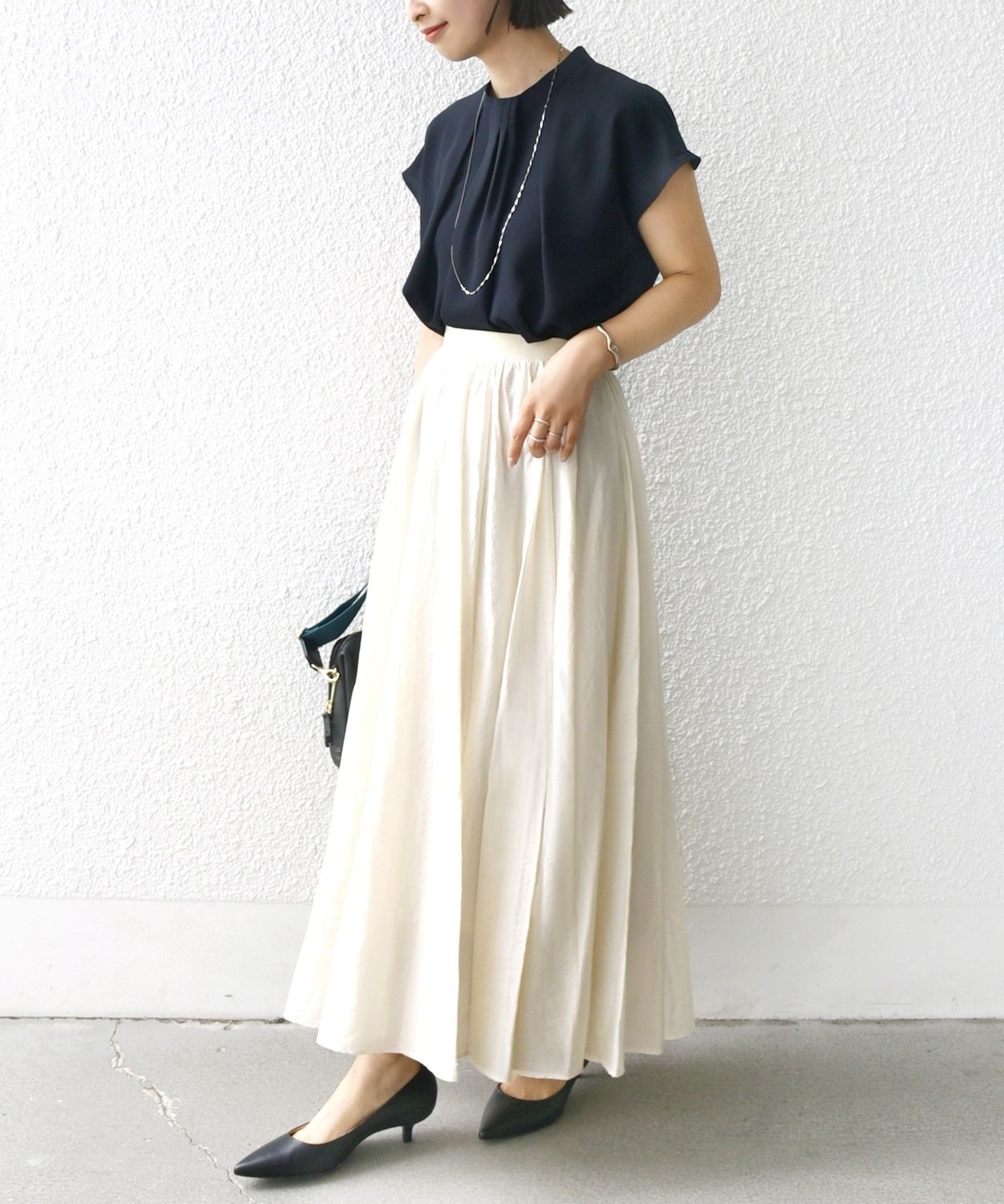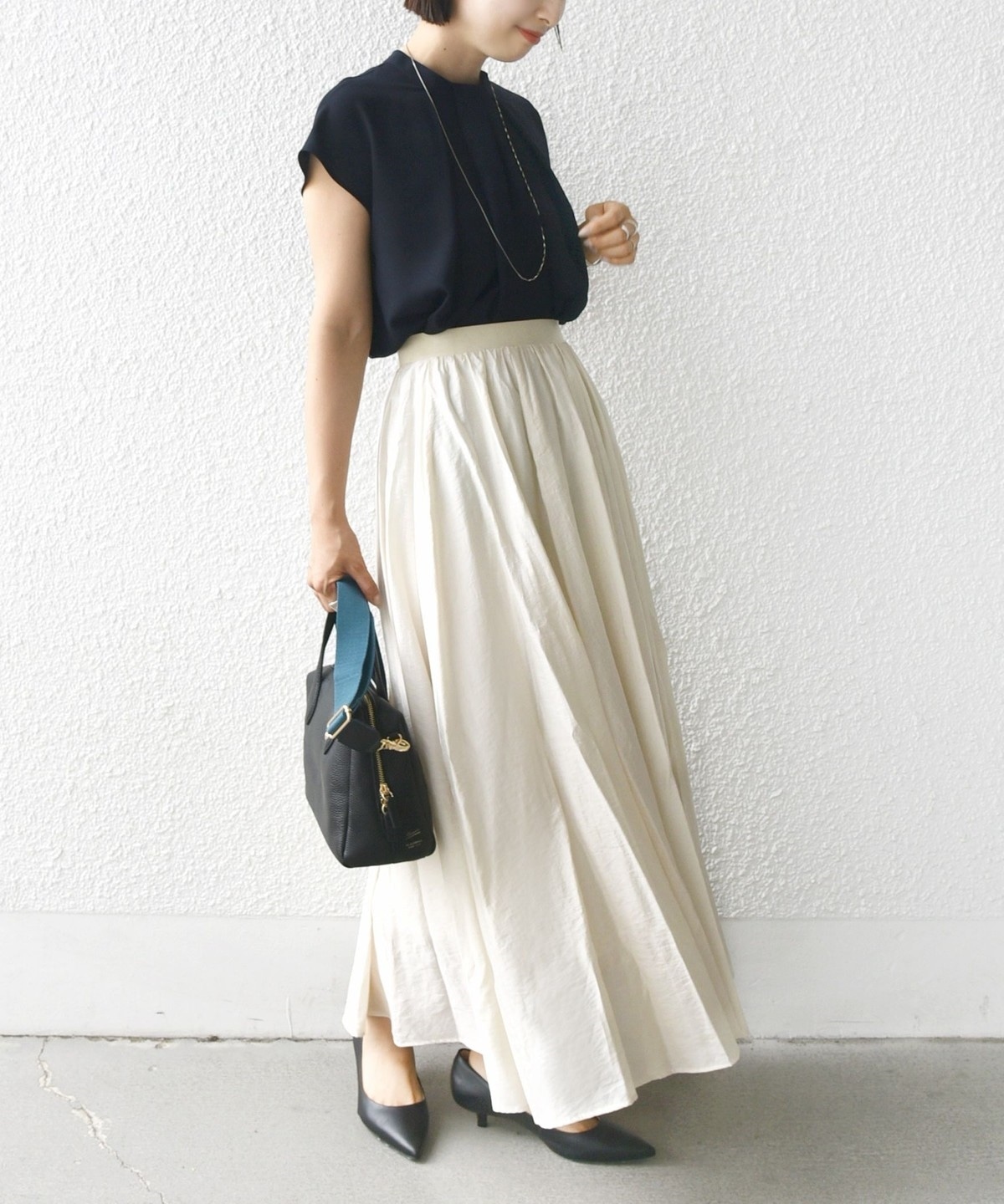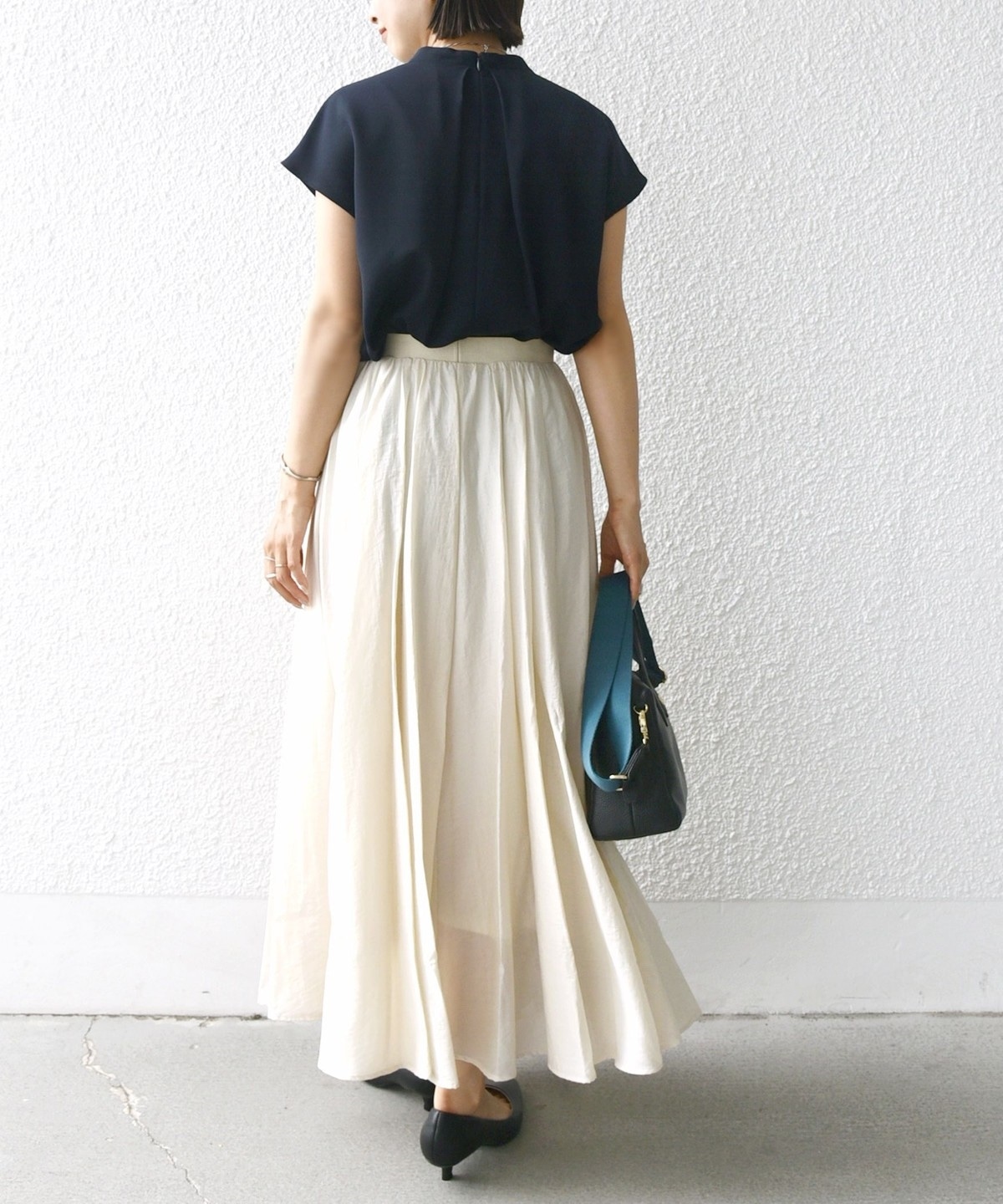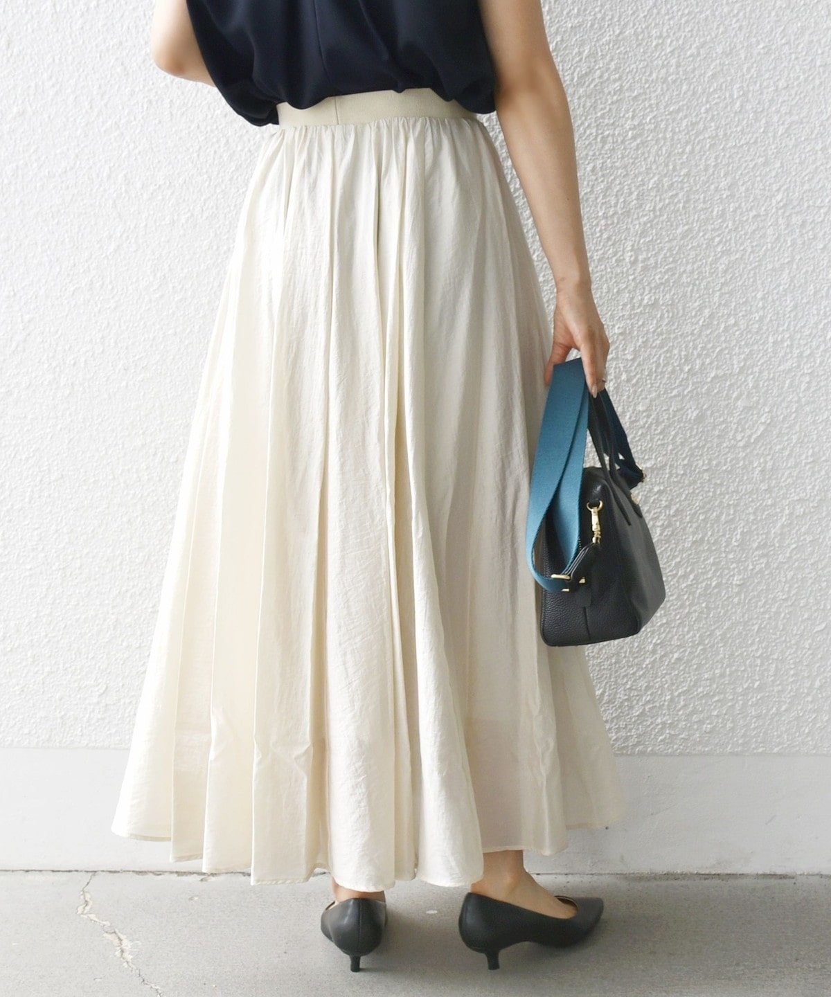 ウエスト部分はインスタイルで見せても映えるデザインなので、トップスをタックインしてメリハリのある着こなしがおすすめ。
