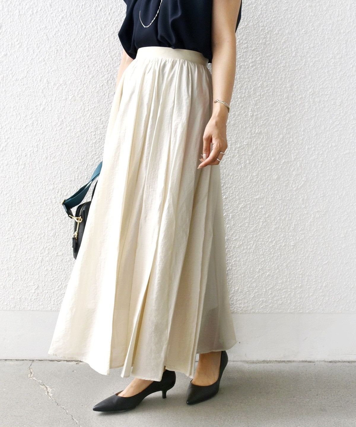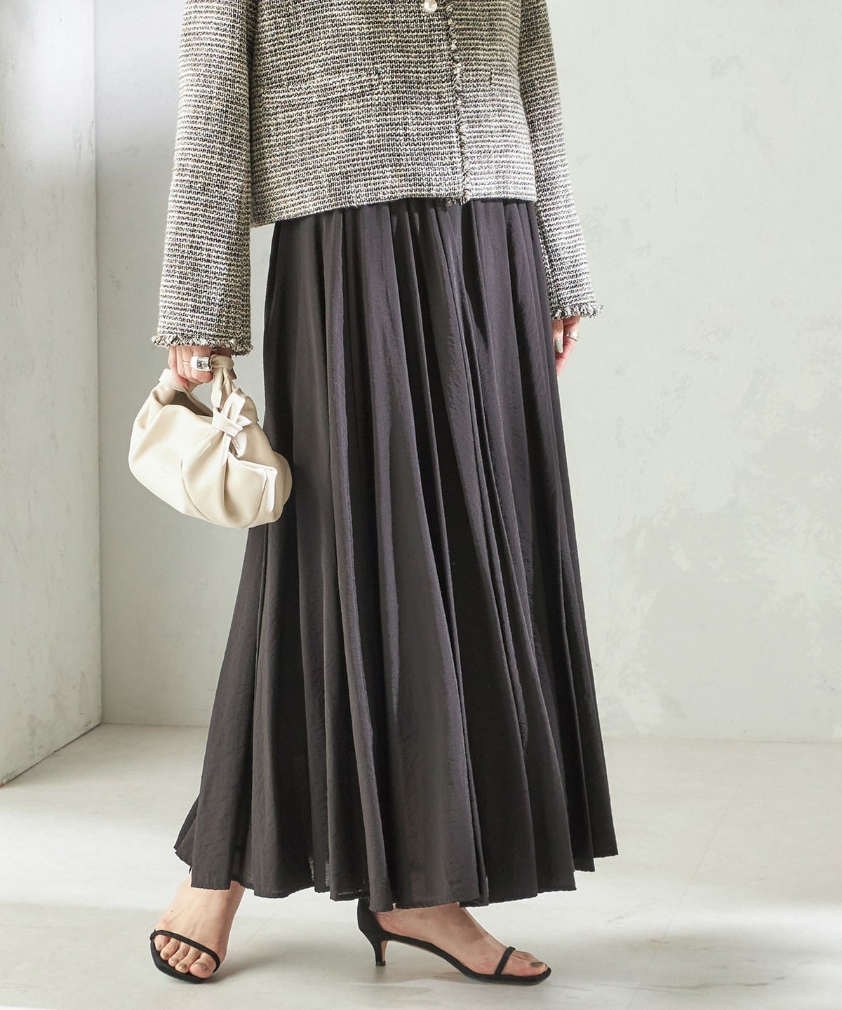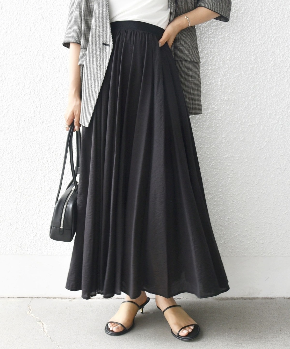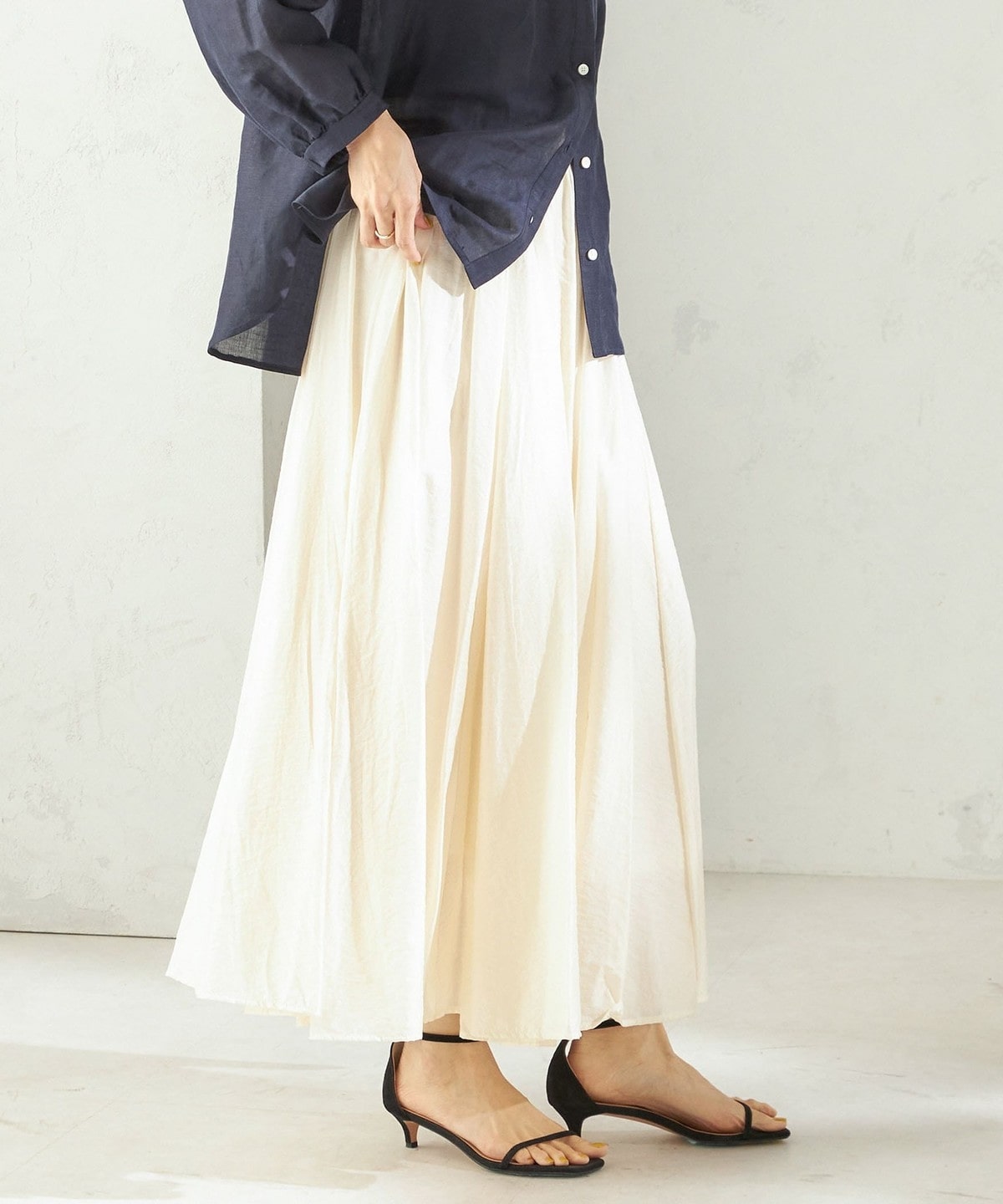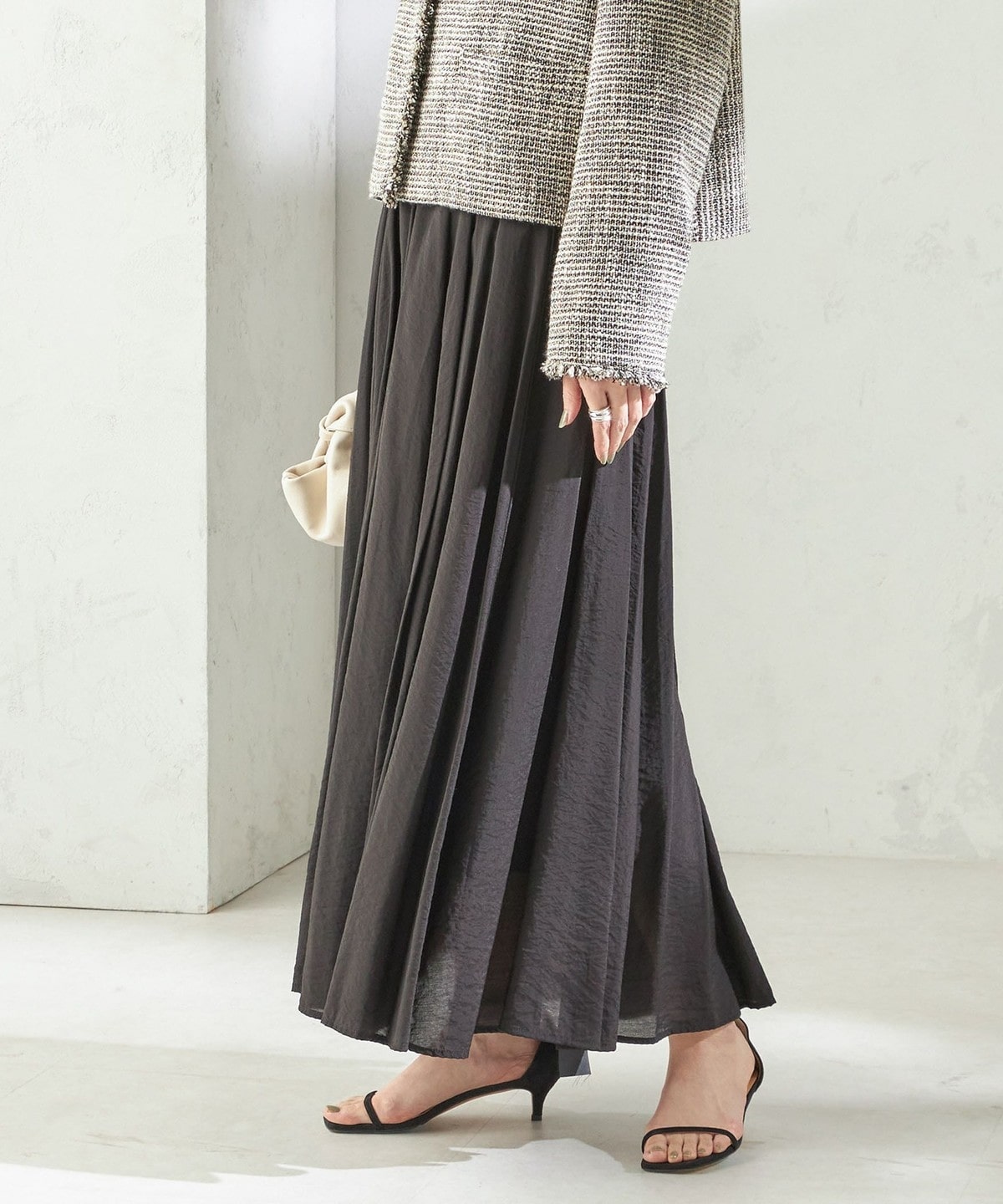 裾まわり500cm以上の贅沢なフレアシルエットで、動くたびに美しく揺れる存在感のあるロングスカート。