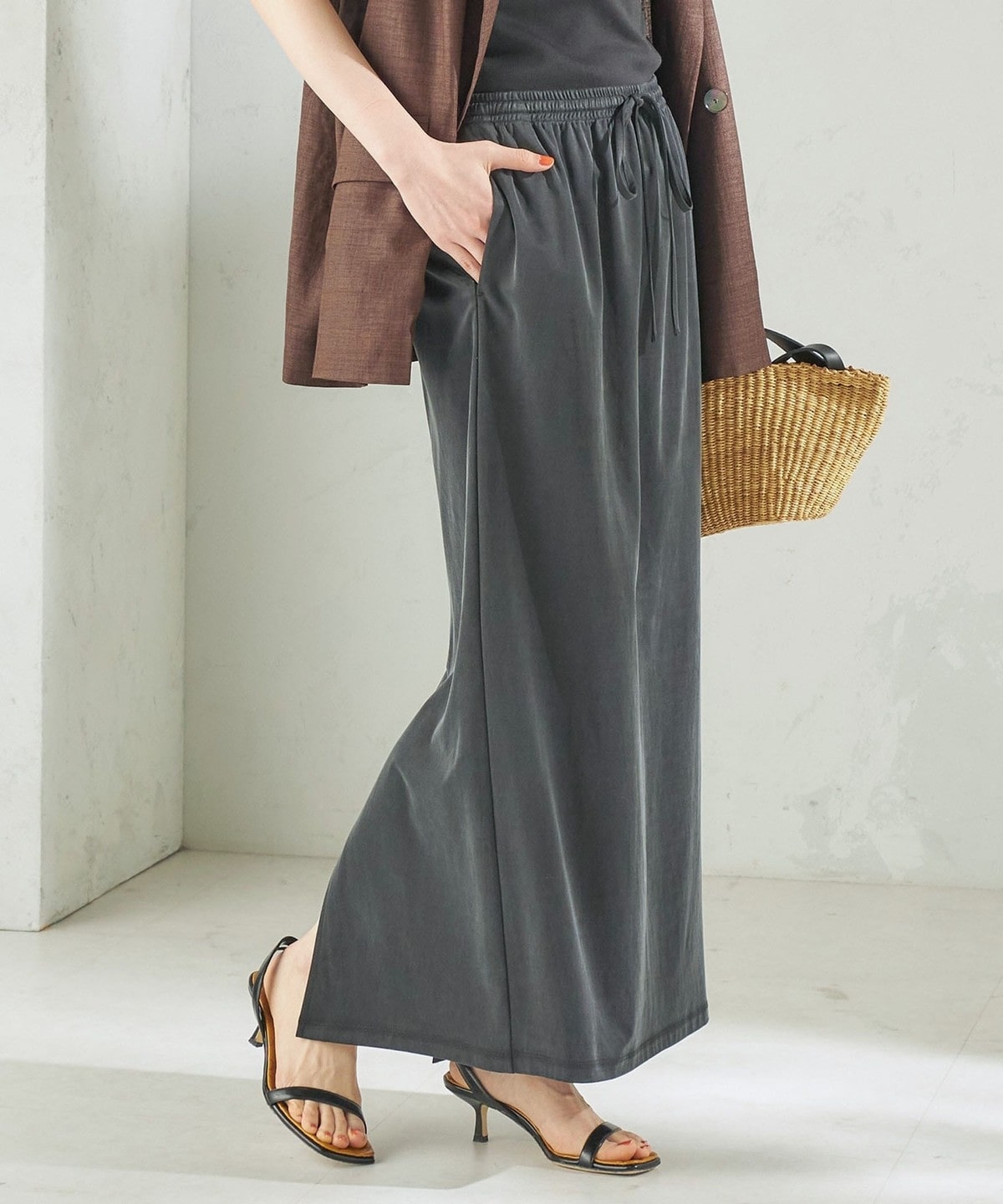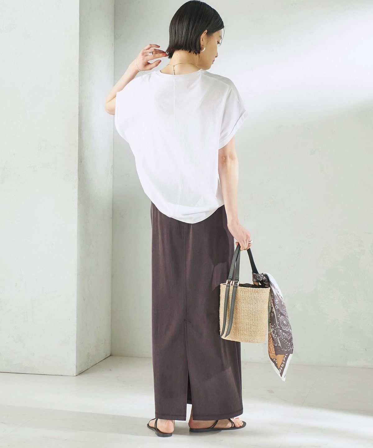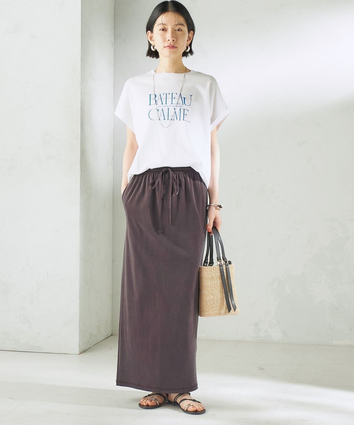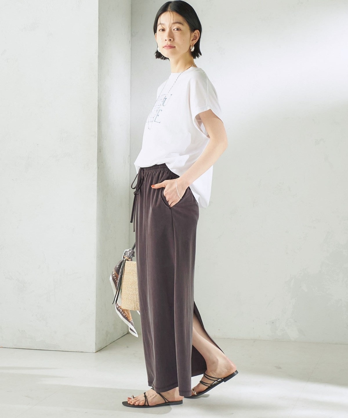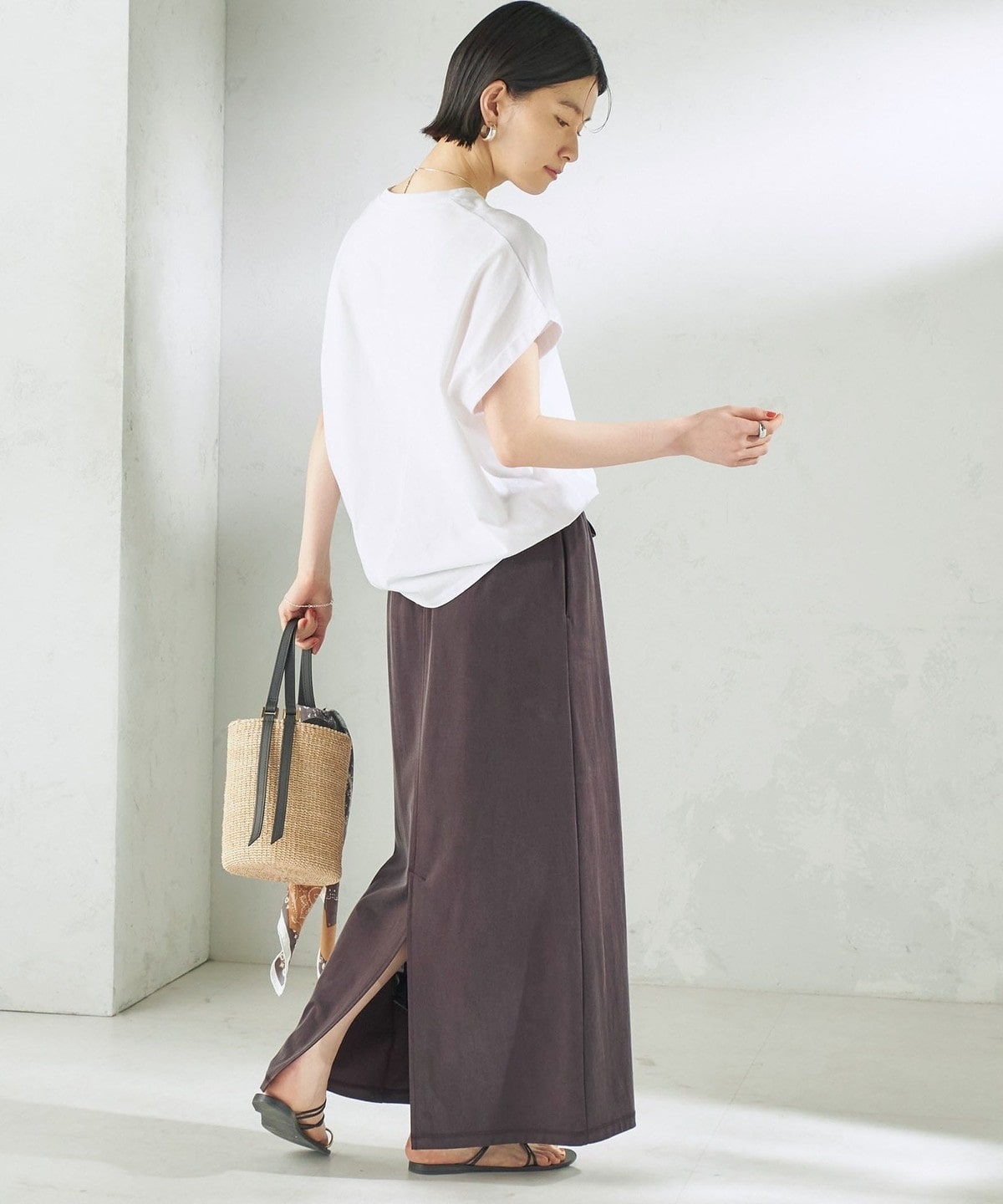 Tシャツやリネンシャツなど、カジュアルなトップスと合わせても上品で大人っぽいカジュアルスタイルに。