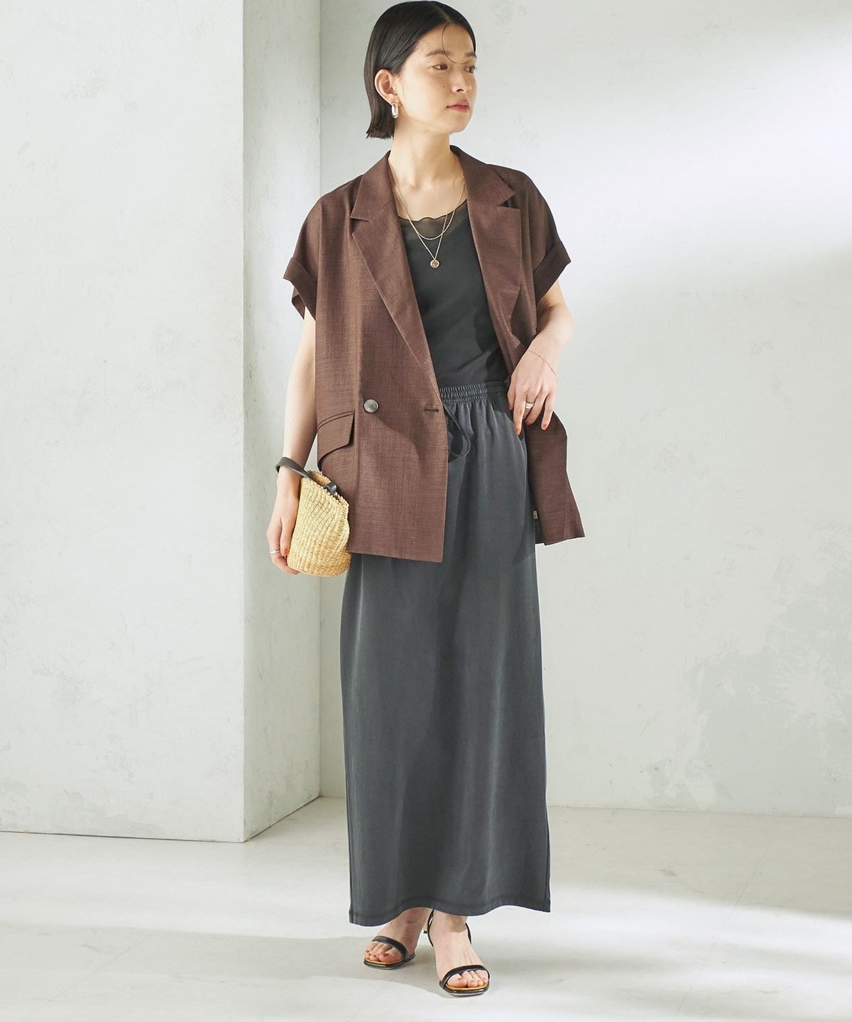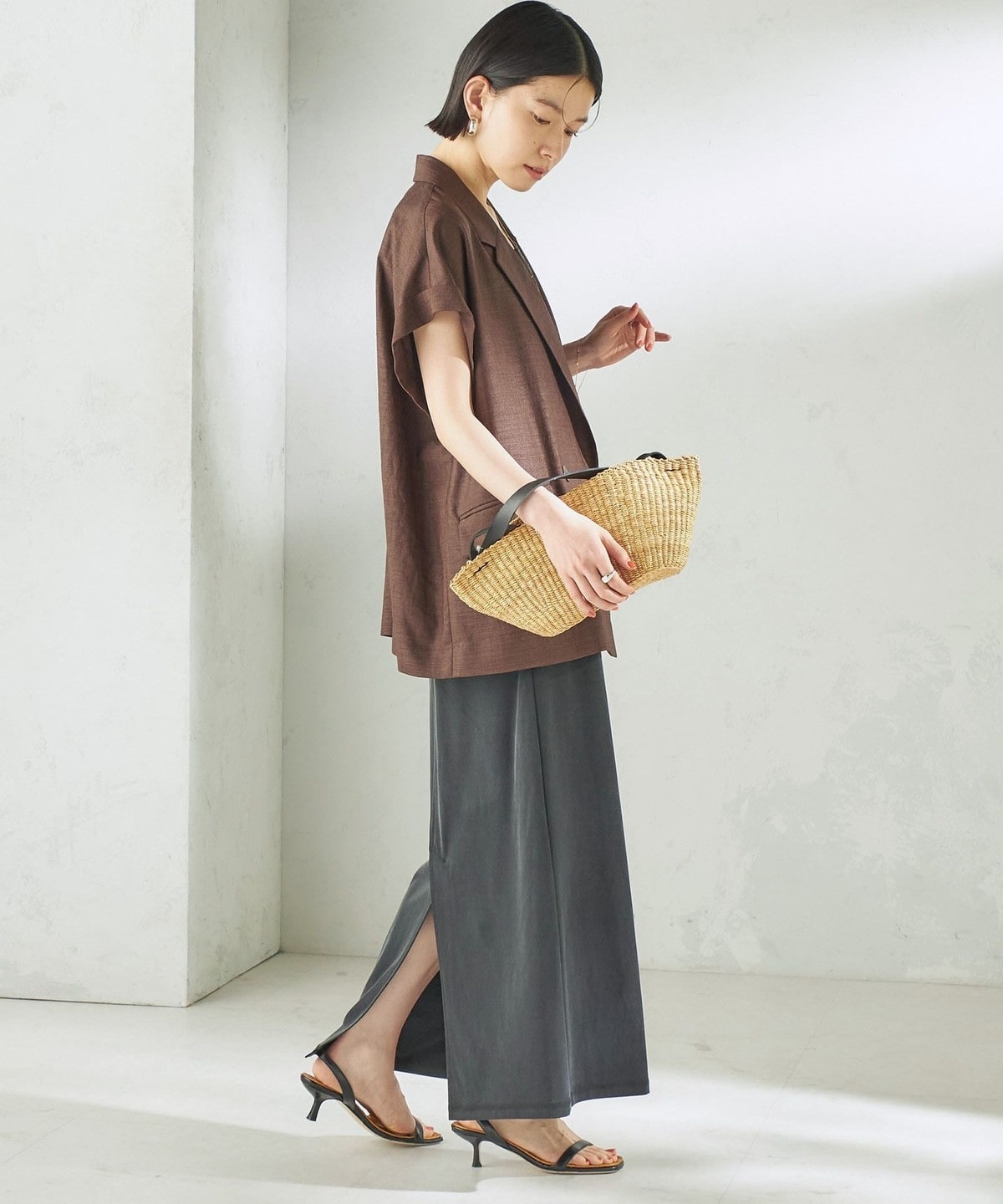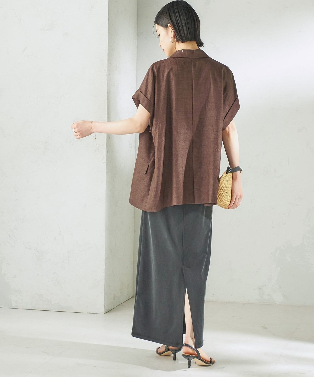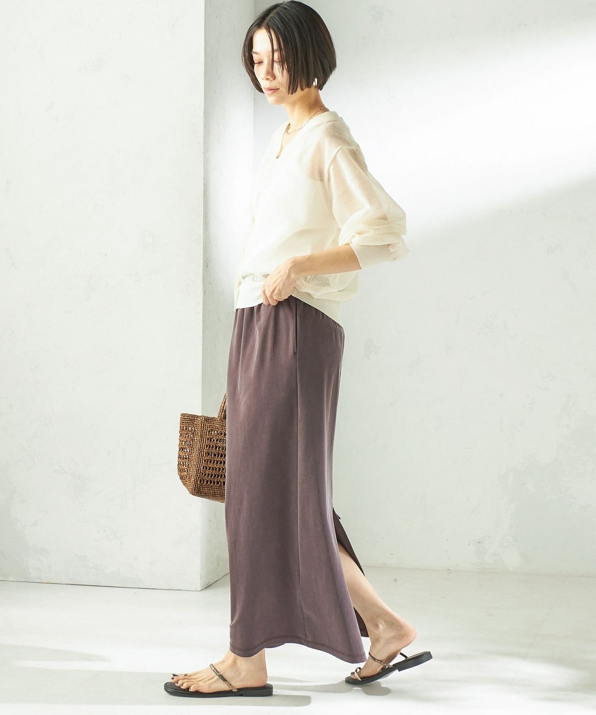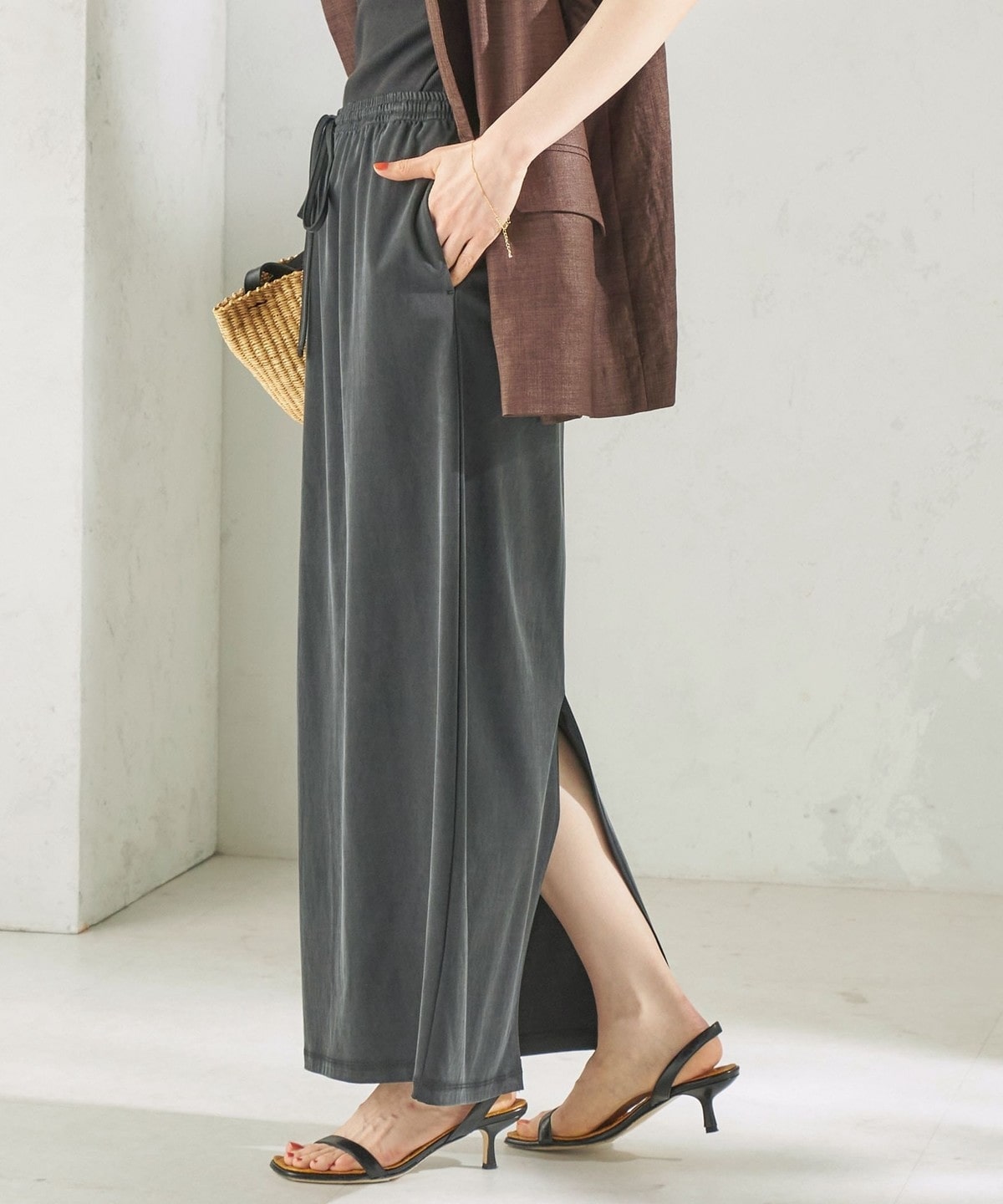 Tシャツやリネンシャツなど、カジュアルなトップスと合わせても上品で大人っぽいカジュアルスタイルに。