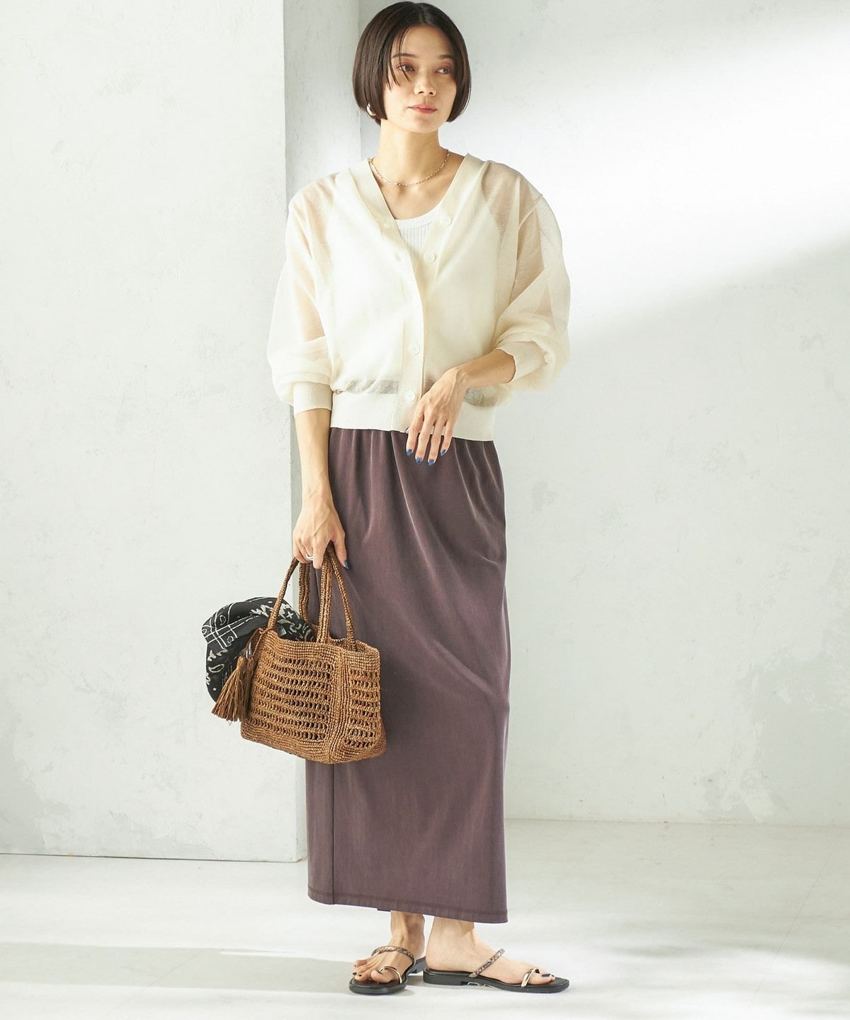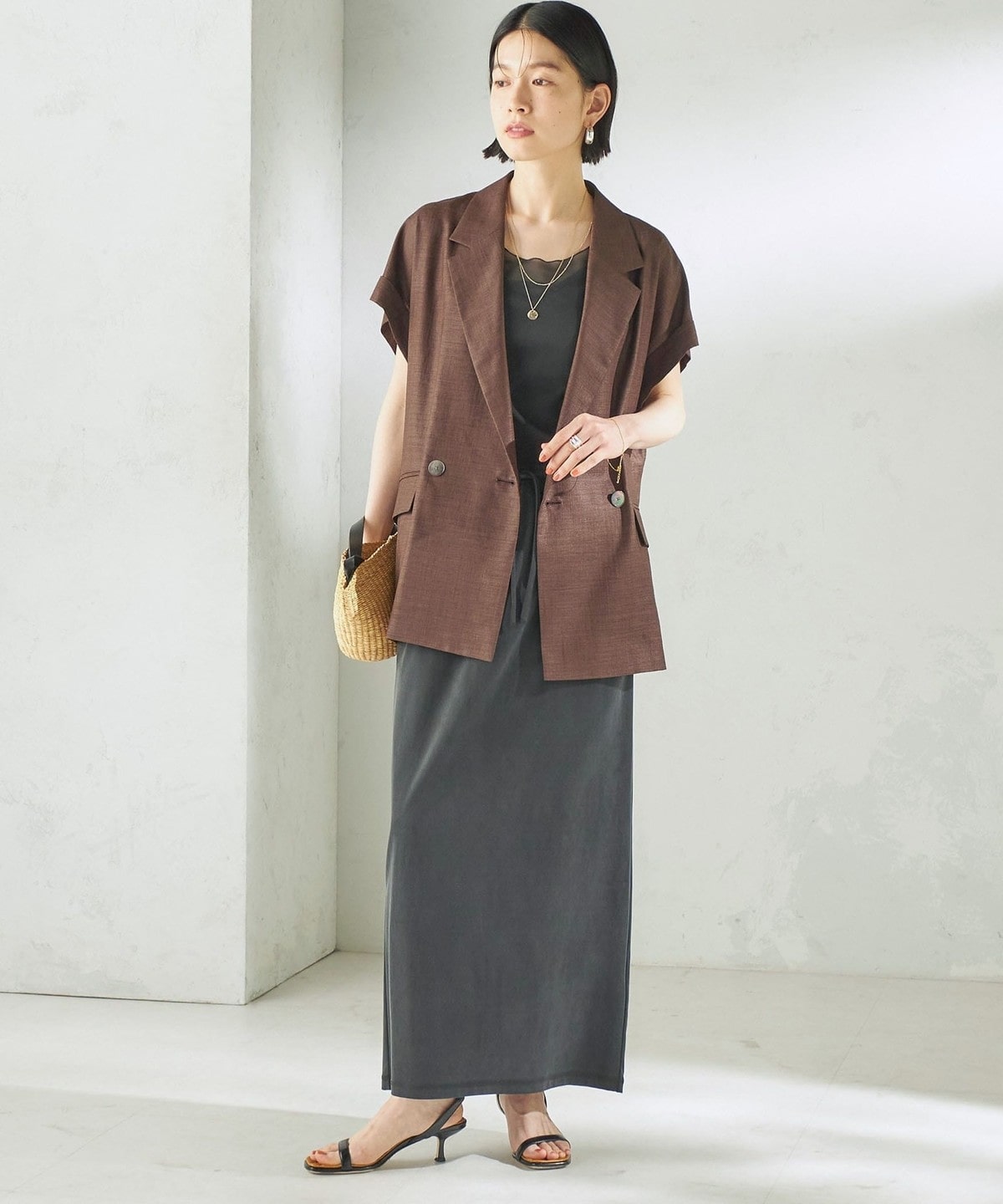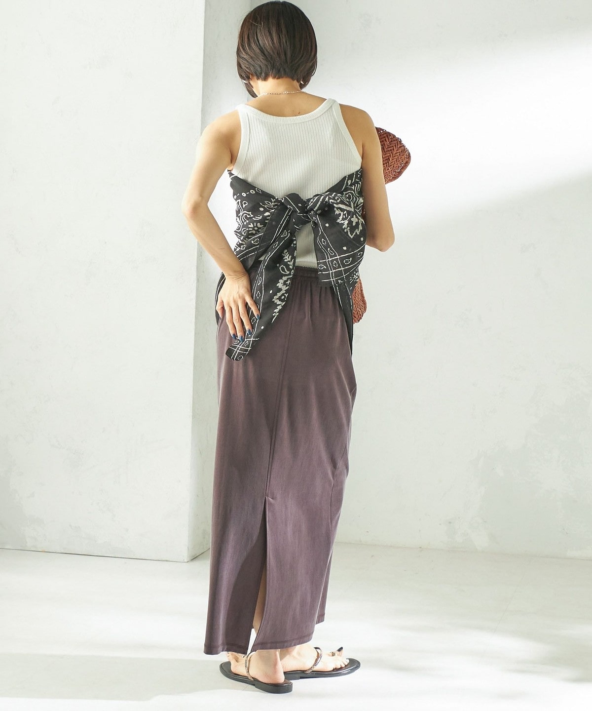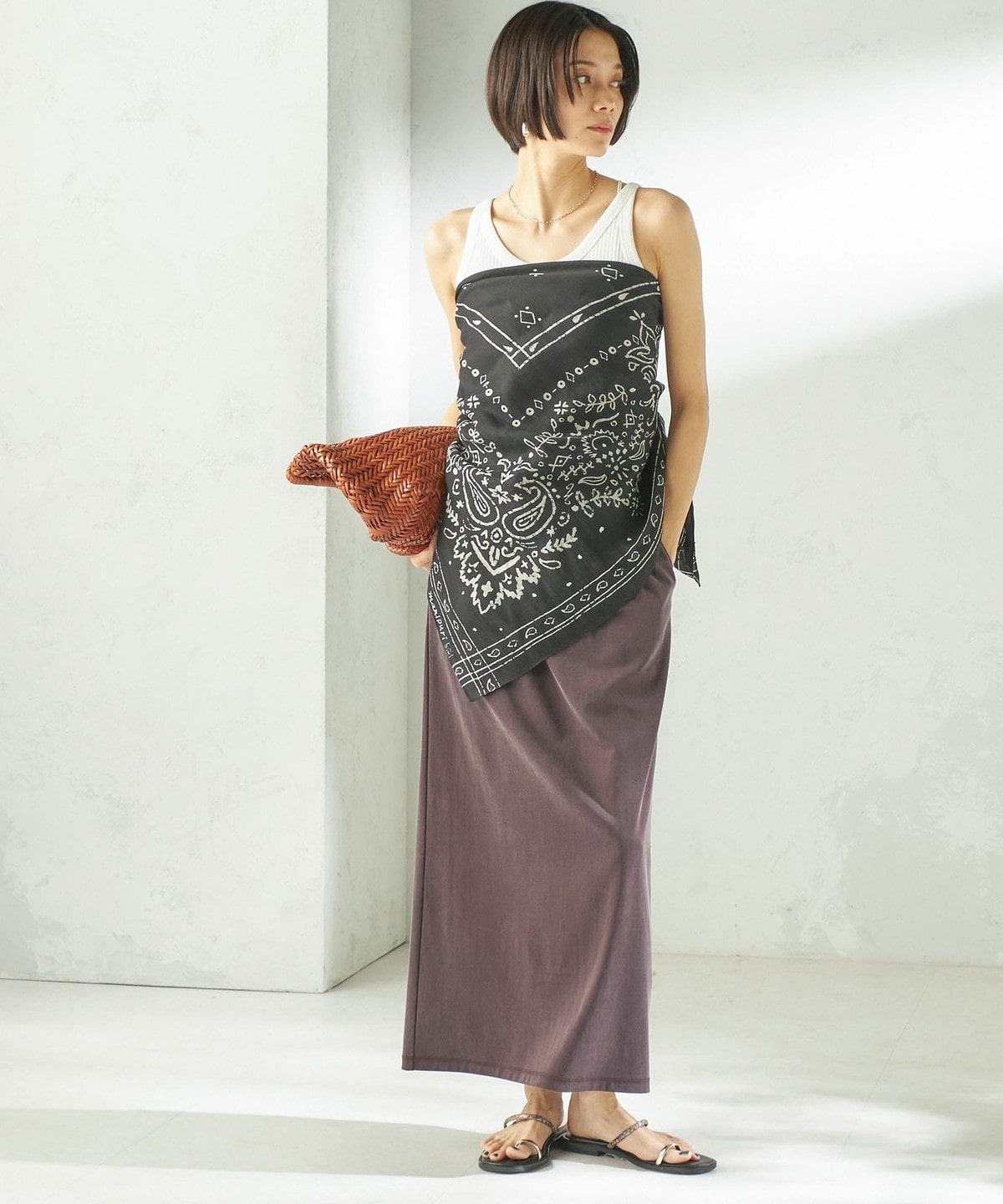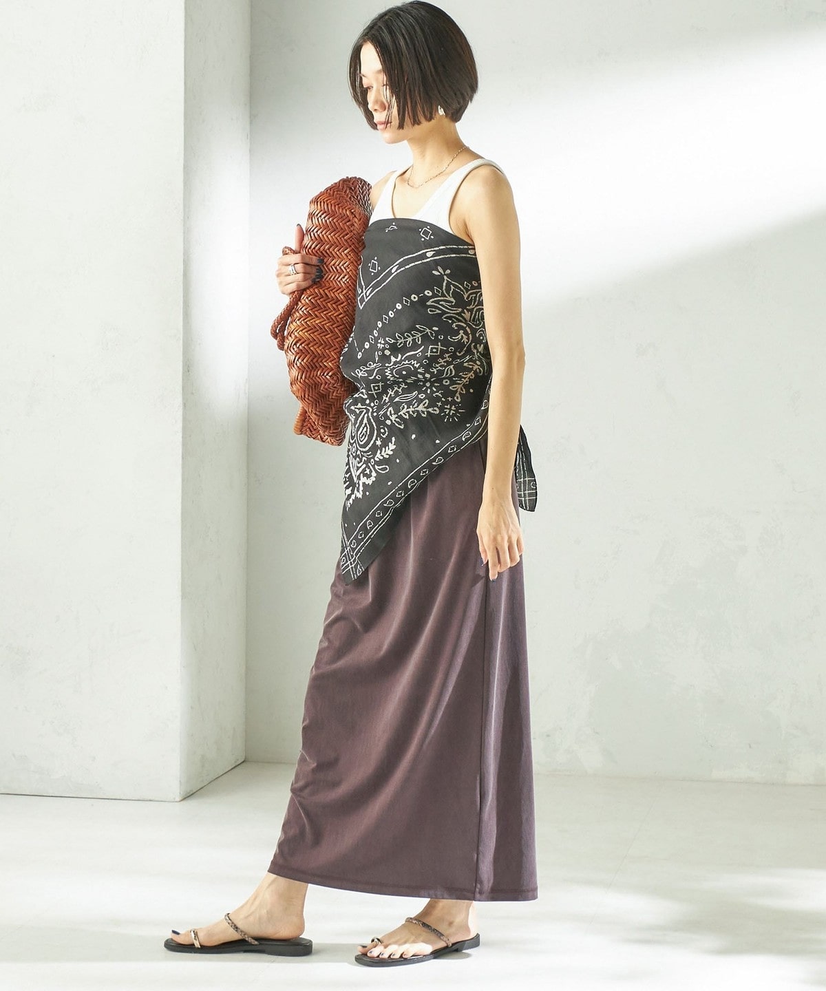 Tシャツやリネンシャツなど、カジュアルなトップスと合わせても上品で大人っぽいカジュアルスタイルに。